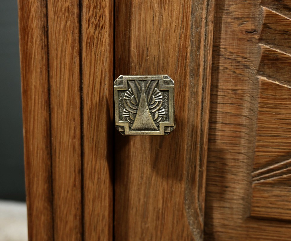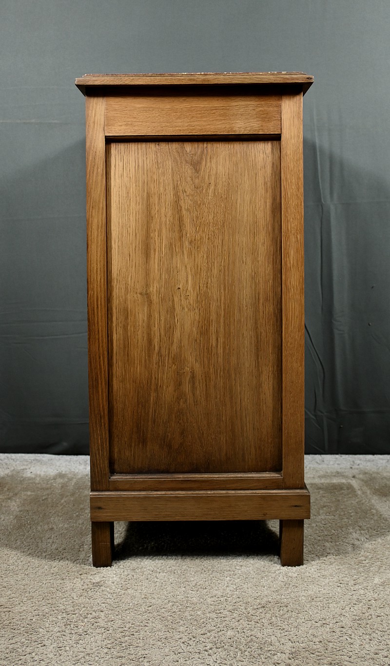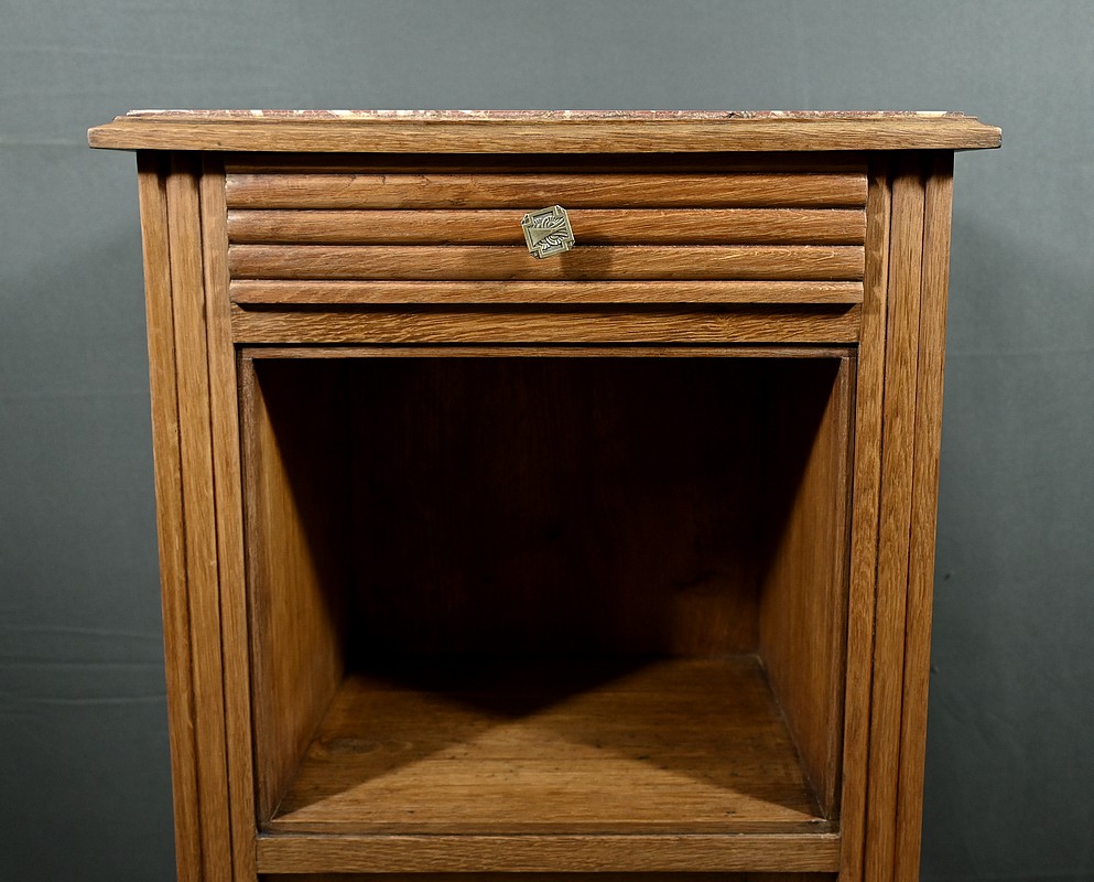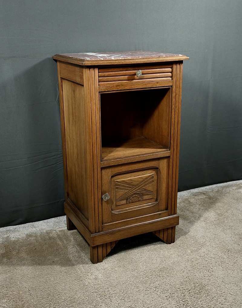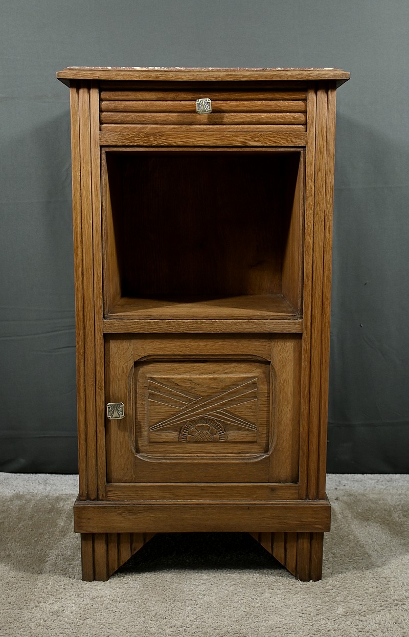 Petit meuble de rangement en chêne, doté d’un tiroir, d’une niche et d’une porte. Ce chevet est sommé d’un marbre griotte rouge de Belgique. La façade du tiroir est sculptée en trompe l’œil à l’horizontal et la porte est ornementée de grands motifs géométriques dans le style Art Déco. Les poignées de tirage de section carrée sont ciselées et les montants du meuble sont ouvragés en relief. Cette petite table repose sur des pieds avant travaillés en trompe l’œil à la verticale. Ce meuble de rangement est une pièce à la fois fonctionnelle et décorative.