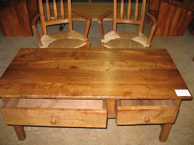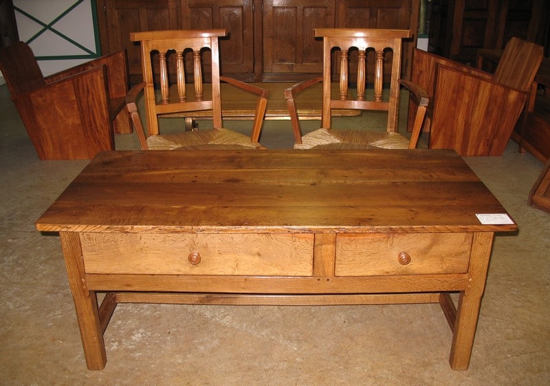 Table de ferme en chêne de la fin du XIXe mise en table basse de salon.
