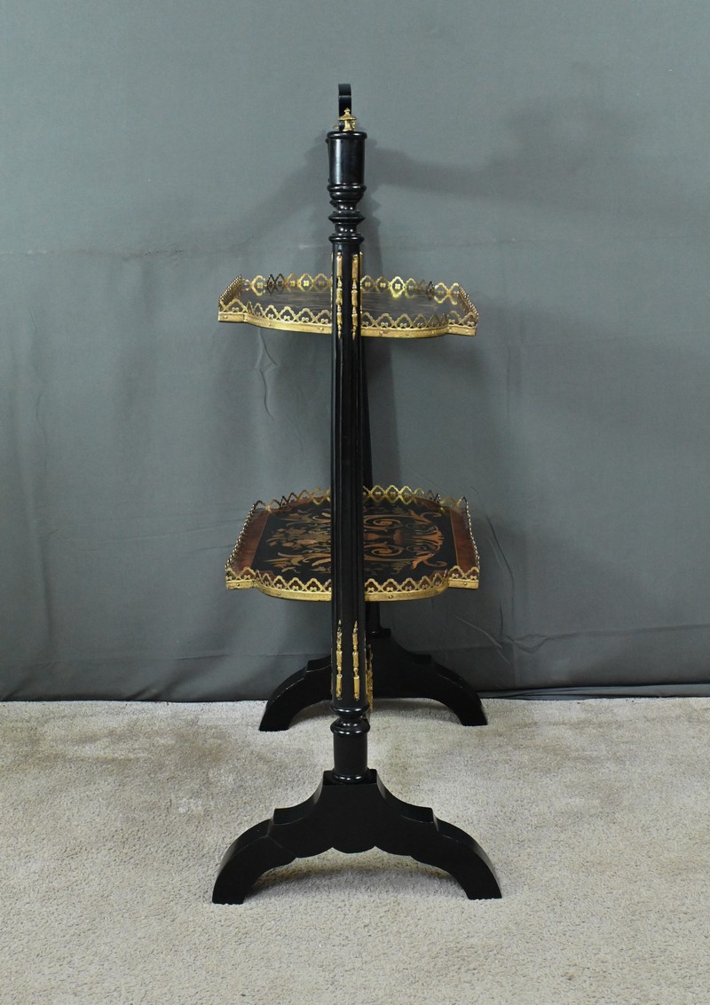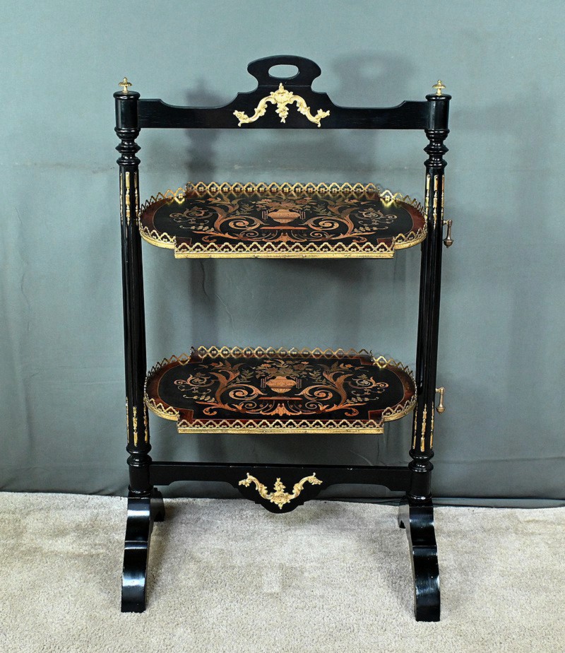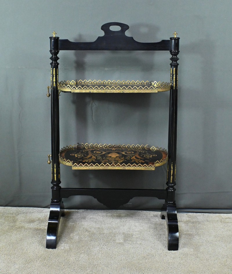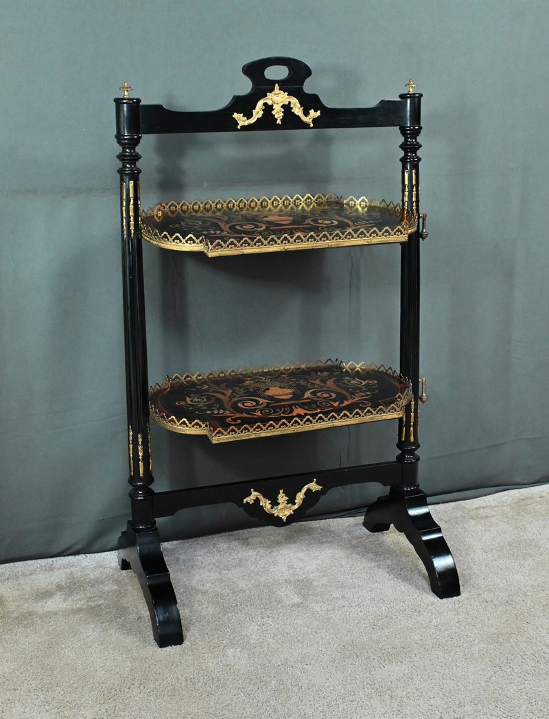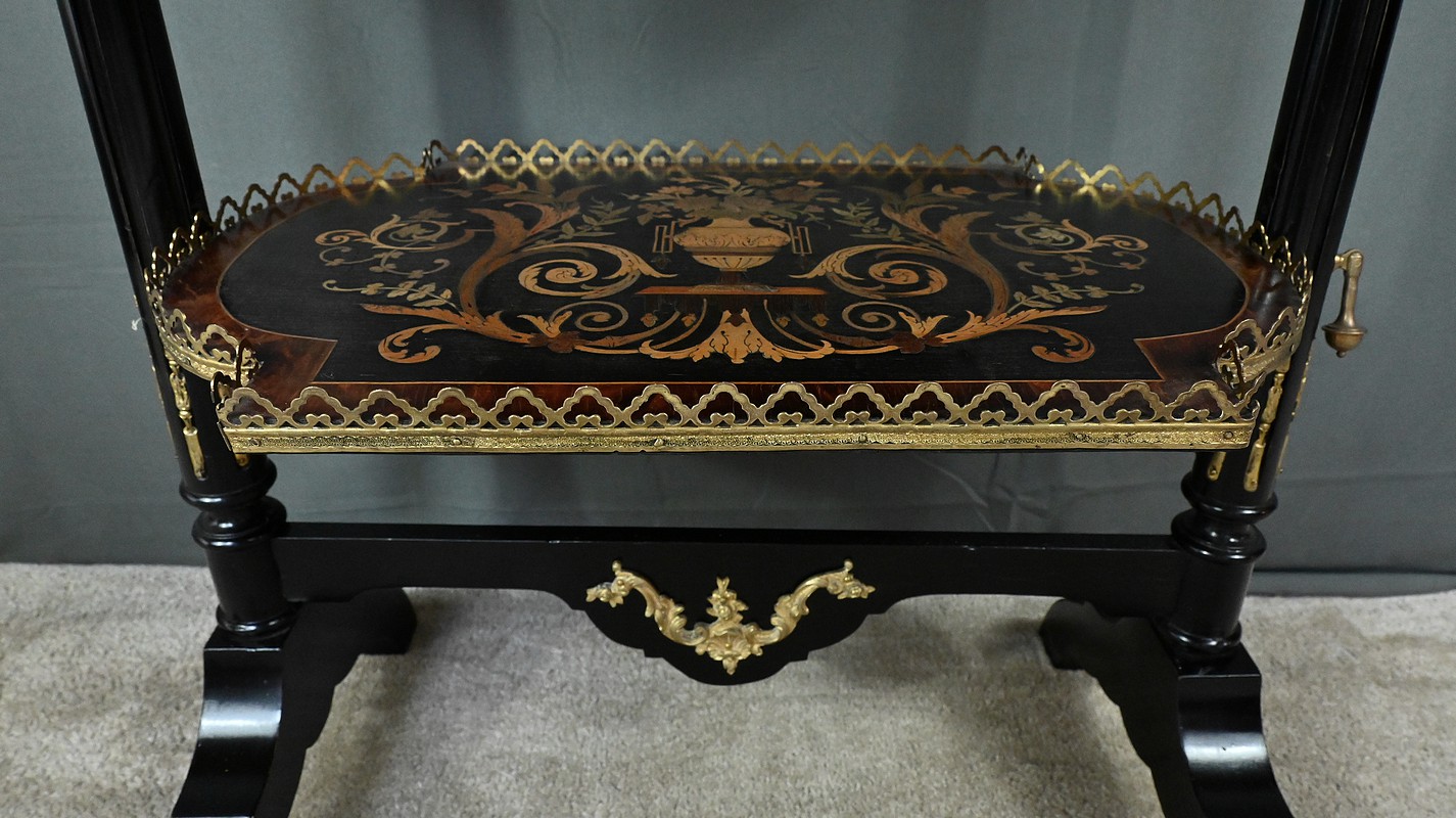 Superbe table de service à deux plateaux d’époque Napoléon III, réalisée en bois noirci sublimée par de délicates garnitures en bronze finement ciselées. Ses deux plateaux basculants fonctionnent grâce à un système ingénieux, alliant praticité et raffinement. La marqueterie de cette table de salon, figurant un vase accompagné de fleurs et de volutes, est composée d’acajou, de citronnier et d’autres essences de bois teintées, se déployant sur un fond de thuya chatoyant. Chaque plateau est cerclé d’une élégante galerie ajourée en laiton, offrant à la fois maintien et caractère décoratif. Cette pièce incarne parfaitement l’époque Napoléon III, où luxe, détails raffinés et savoir-faire artisanal se rencontrent. Elle saura trouver sa place dans un intérieur élégant, qu’elle serve lors d’un repas raffiné ou qu’elle trône en objet décoratif d’exception. Un véritable témoignage de l’art décoratif français du XIXᵉ siècle, prêt à enrichir la collection d’un amateur averti.