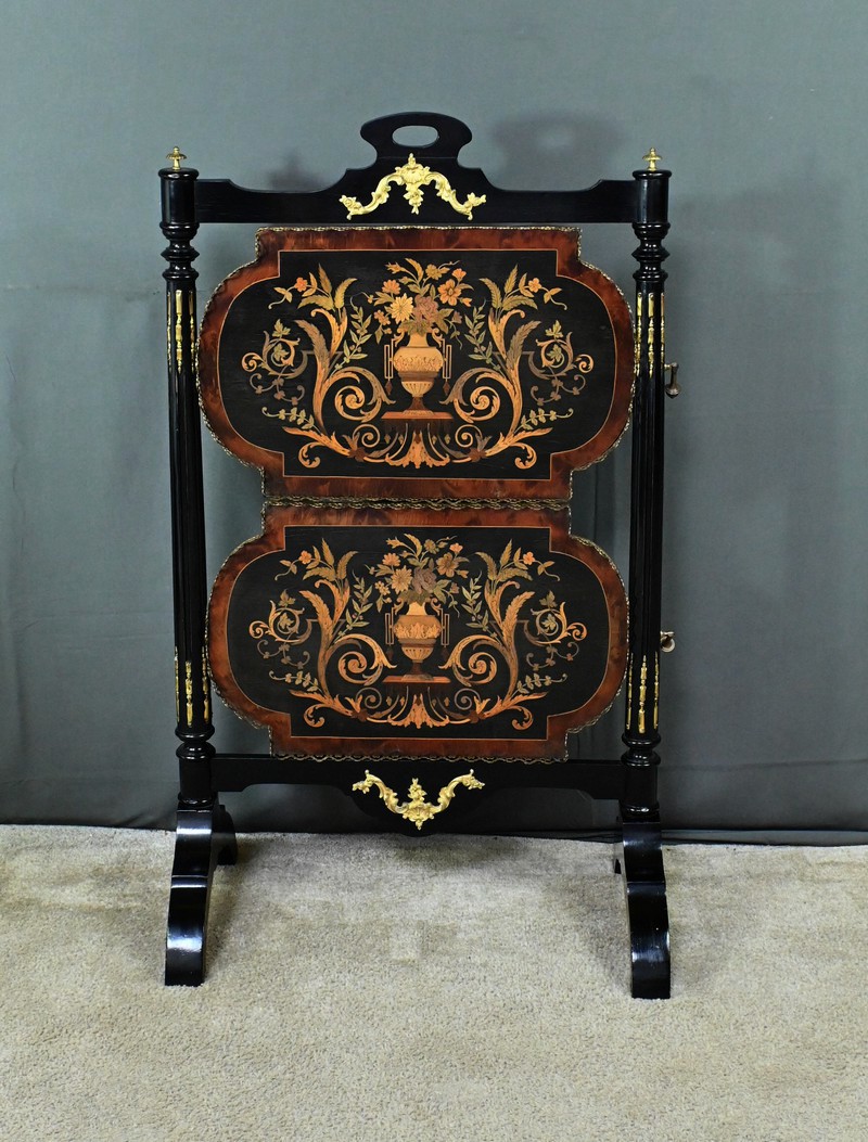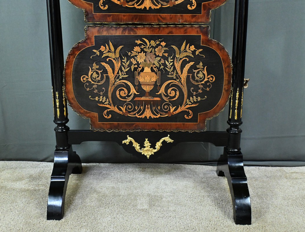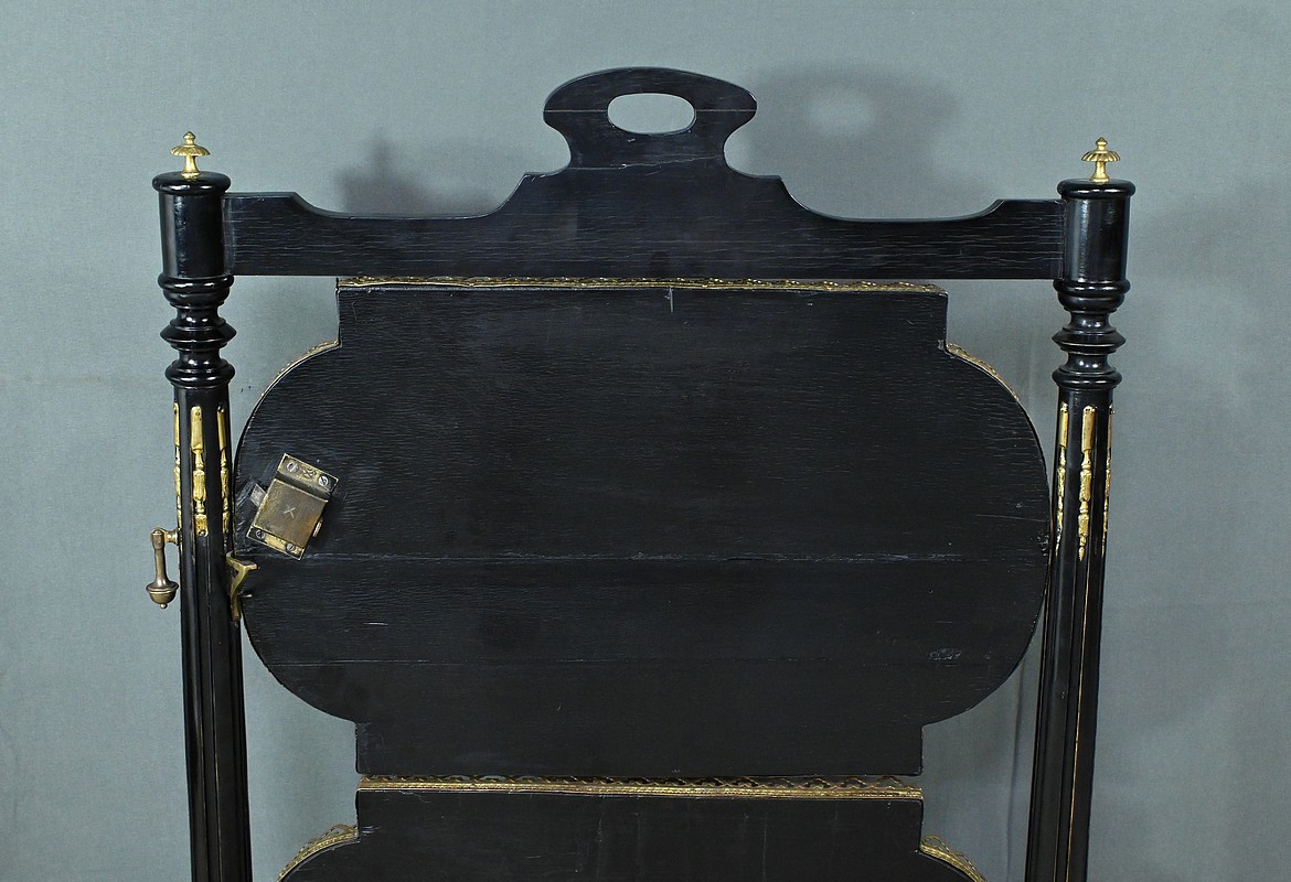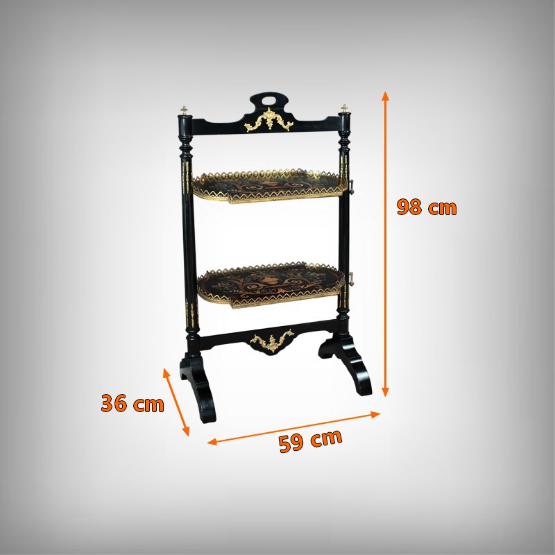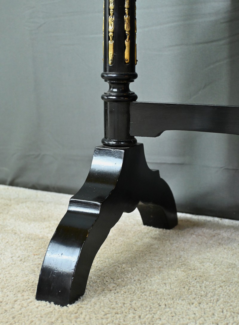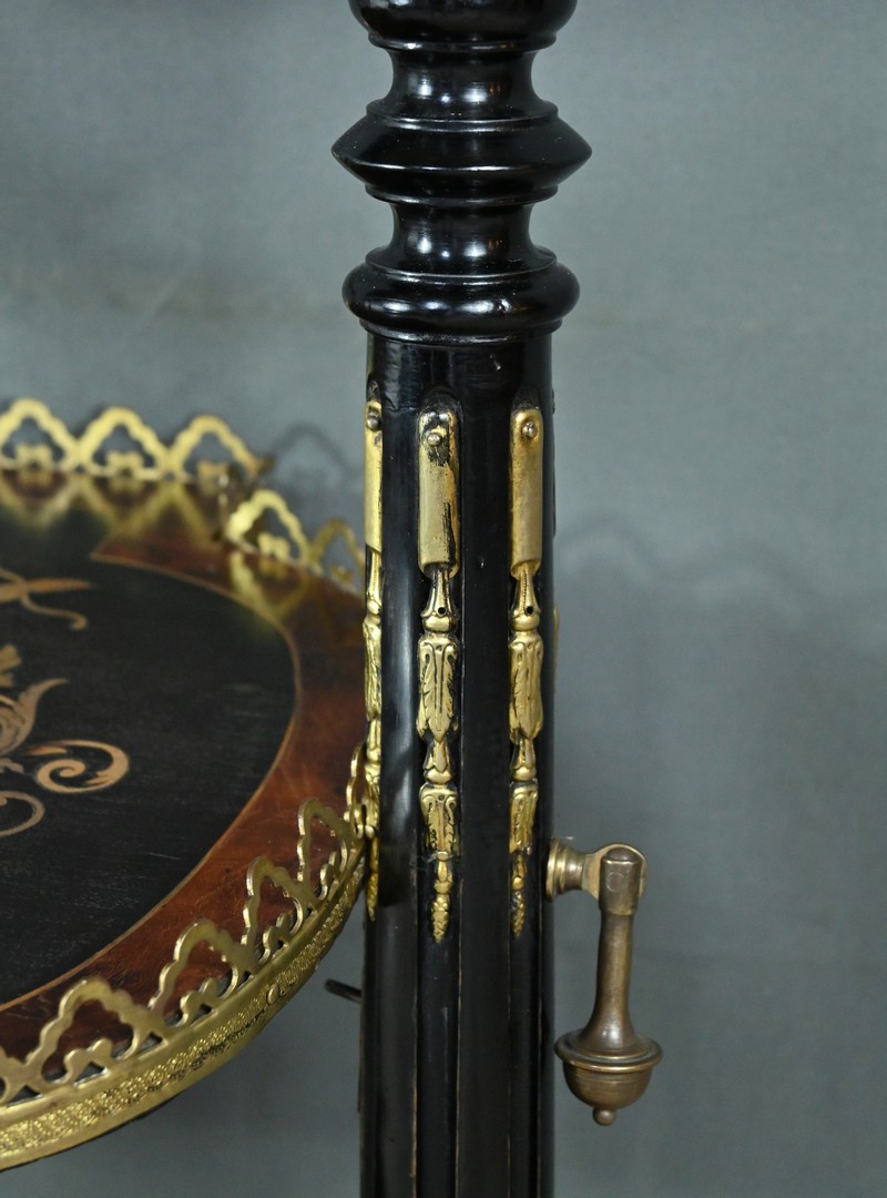 Superbe table de service à deux plateaux d’époque Napoléon III, réalisée en bois noirci sublimée par de délicates garnitures en bronze finement ciselées. Ses deux plateaux basculants fonctionnent grâce à un système ingénieux, alliant praticité et raffinement. La marqueterie de cette table de salon, figurant un vase accompagné de fleurs et de volutes, est composée d’acajou, de citronnier et d’autres essences de bois teintées, se déployant sur un fond de thuya chatoyant. Chaque plateau est cerclé d’une élégante galerie ajourée en laiton, offrant à la fois maintien et caractère décoratif. Cette pièce incarne parfaitement l’époque Napoléon III, où luxe, détails raffinés et savoir-faire artisanal se rencontrent. Elle saura trouver sa place dans un intérieur élégant, qu’elle serve lors d’un repas raffiné ou qu’elle trône en objet décoratif d’exception. Un véritable témoignage de l’art décoratif français du XIXᵉ siècle, prêt à enrichir la collection d’un amateur averti.