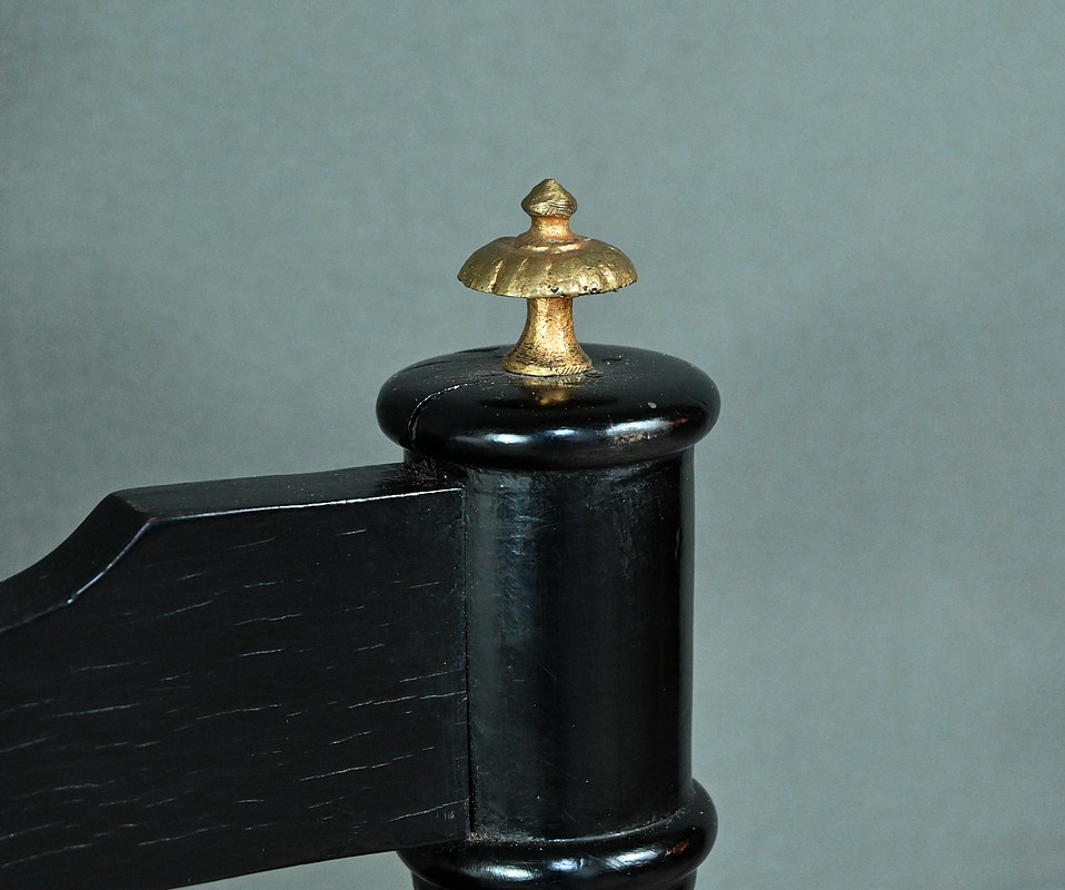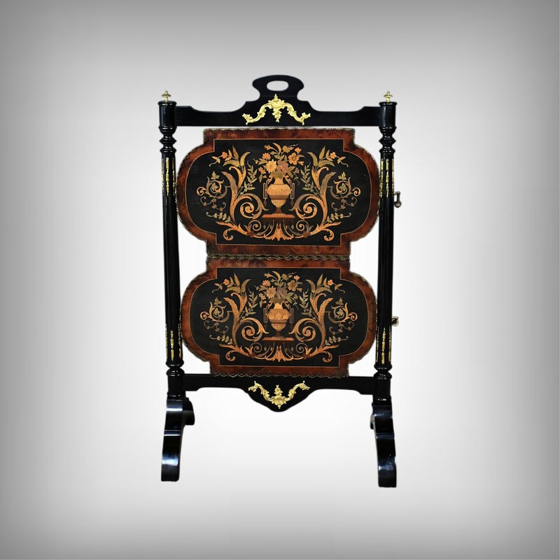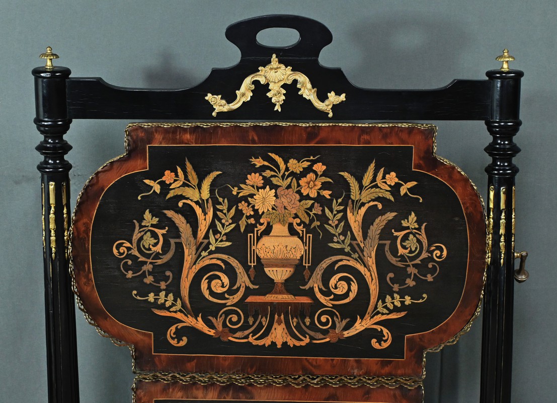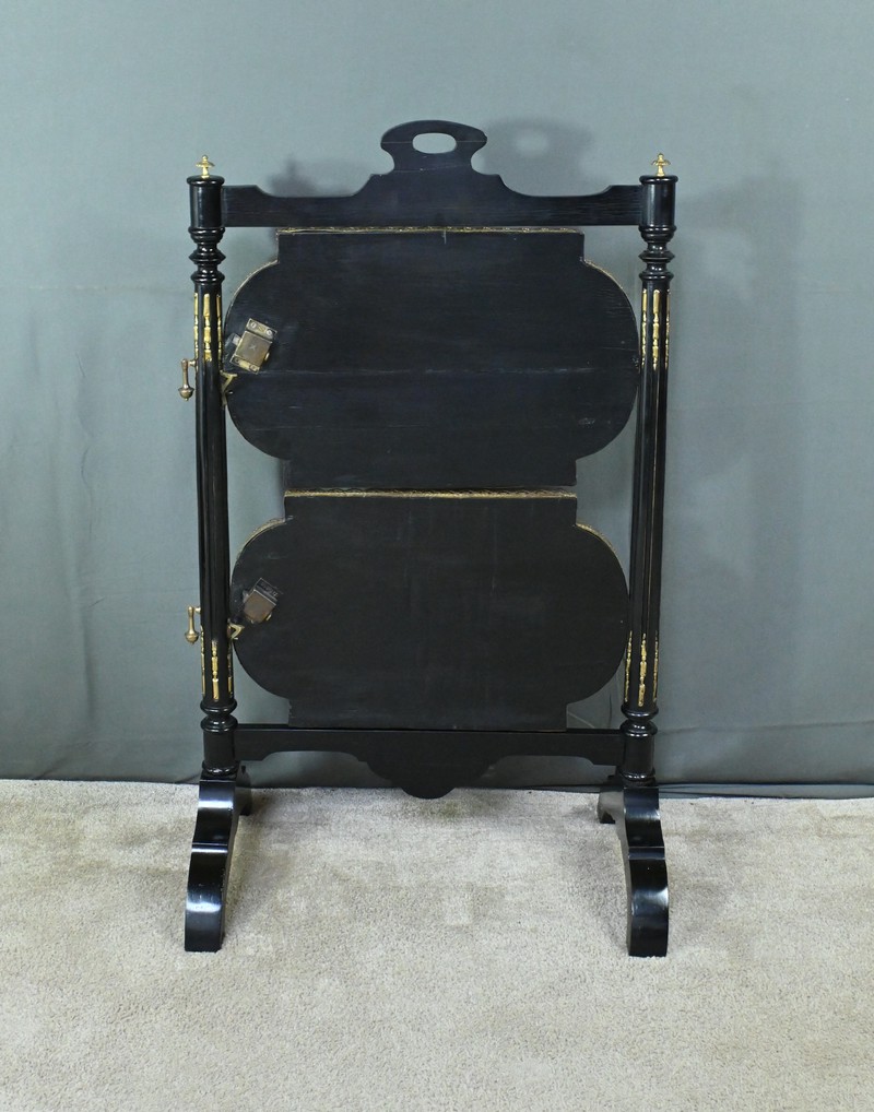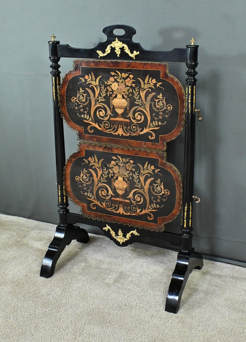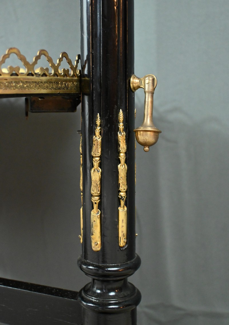 Superbe table de service à deux plateaux d’époque Napoléon III, réalisée en bois noirci sublimée par de délicates garnitures en bronze finement ciselées. Ses deux plateaux basculants fonctionnent grâce à un système ingénieux, alliant praticité et raffinement. La marqueterie de cette table de salon, figurant un vase accompagné de fleurs et de volutes, est composée d’acajou, de citronnier et d’autres essences de bois teintées, se déployant sur un fond de thuya chatoyant. Chaque plateau est cerclé d’une élégante galerie ajourée en laiton, offrant à la fois maintien et caractère décoratif. Cette pièce incarne parfaitement l’époque Napoléon III, où luxe, détails raffinés et savoir-faire artisanal se rencontrent. Elle saura trouver sa place dans un intérieur élégant, qu’elle serve lors d’un repas raffiné ou qu’elle trône en objet décoratif d’exception. Un véritable témoignage de l’art décoratif français du XIXᵉ siècle, prêt à enrichir la collection d’un amateur averti.