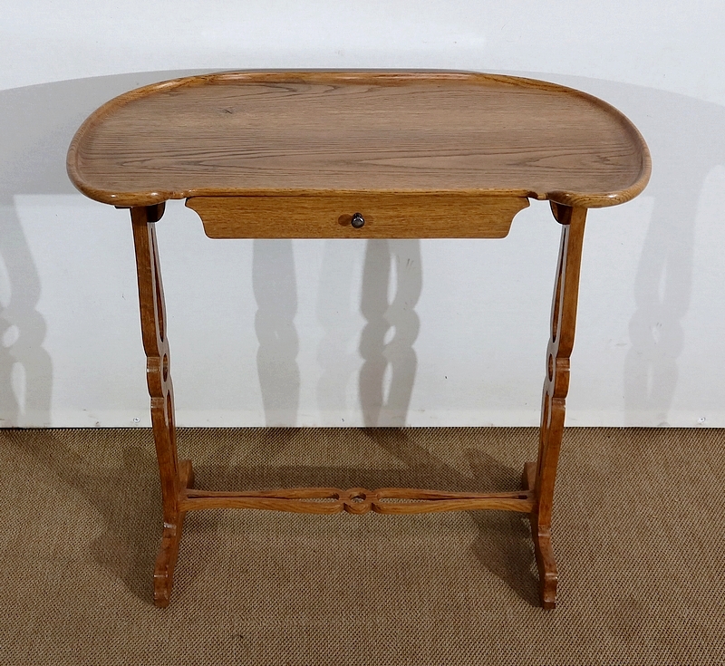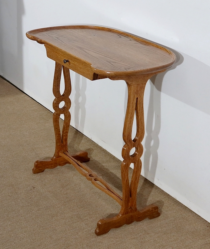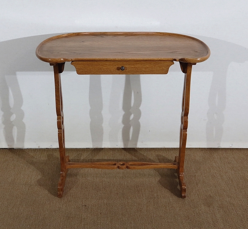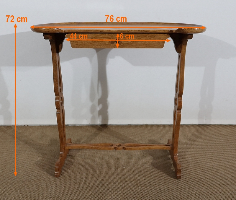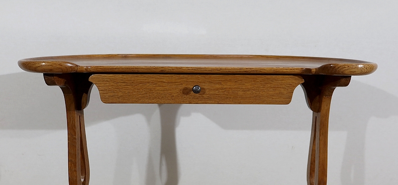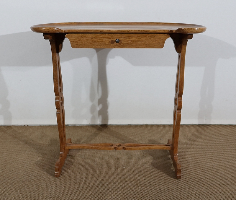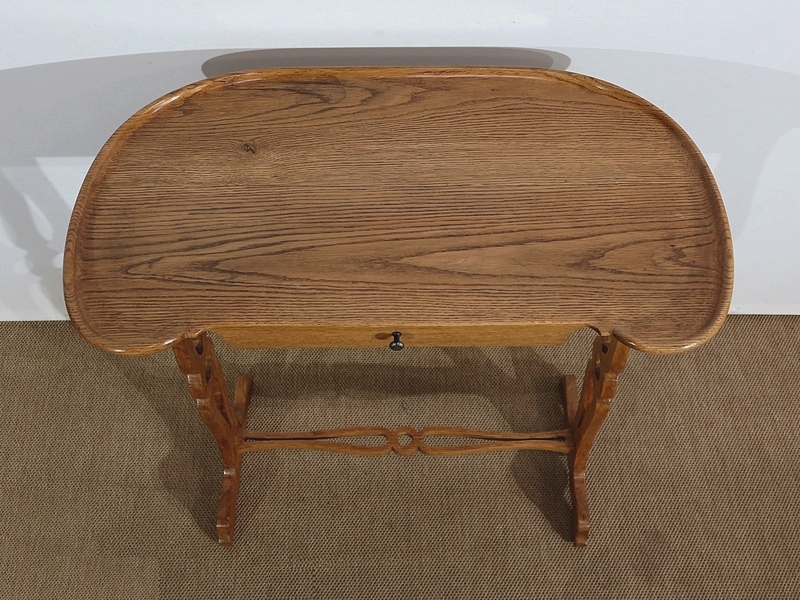 Charmante table desserte de forme rognon en chêne massif dotée d’un plateau à cuvette élégamment sculpté. Ce petit meuble présente en ceinture un tiroir en trémie. L’ensemble repose sur deux pieds lyre ajourés disposés sur une base. Les pieds sont reliés par entretoise ajourée également. finition cirée.