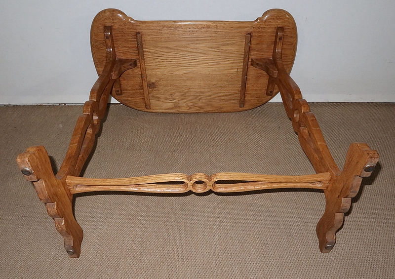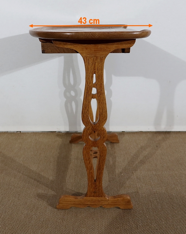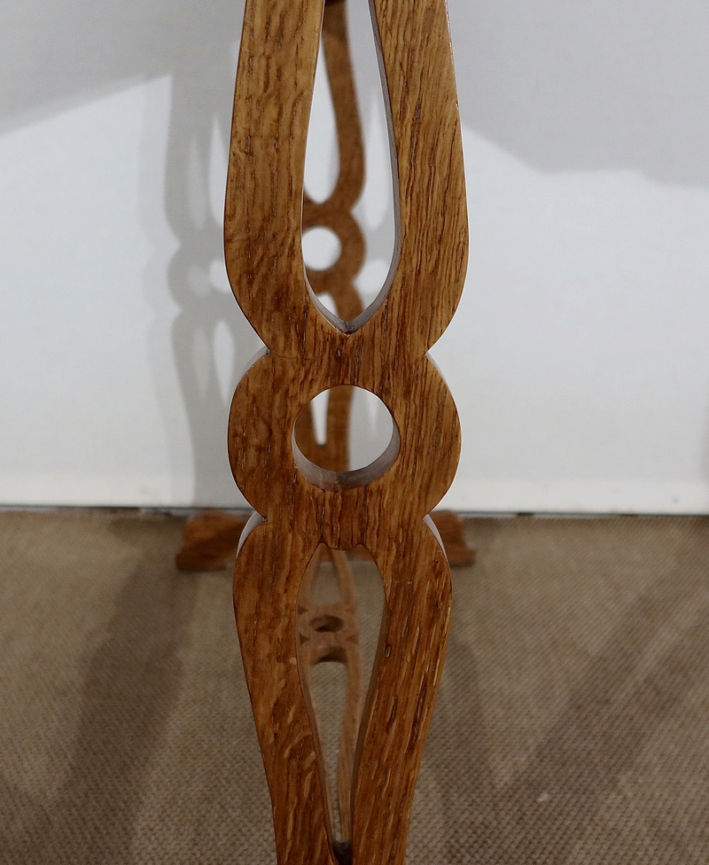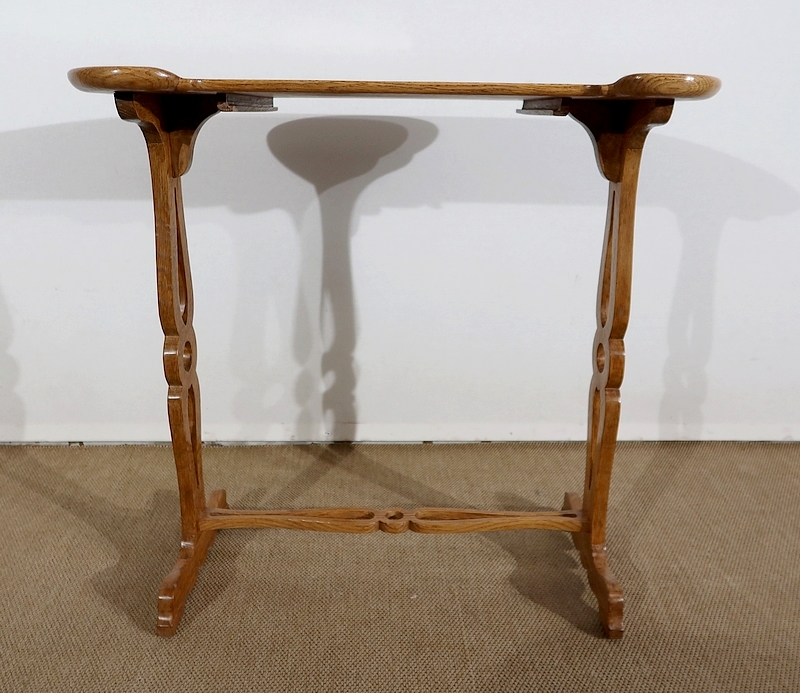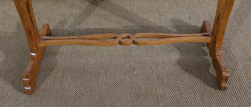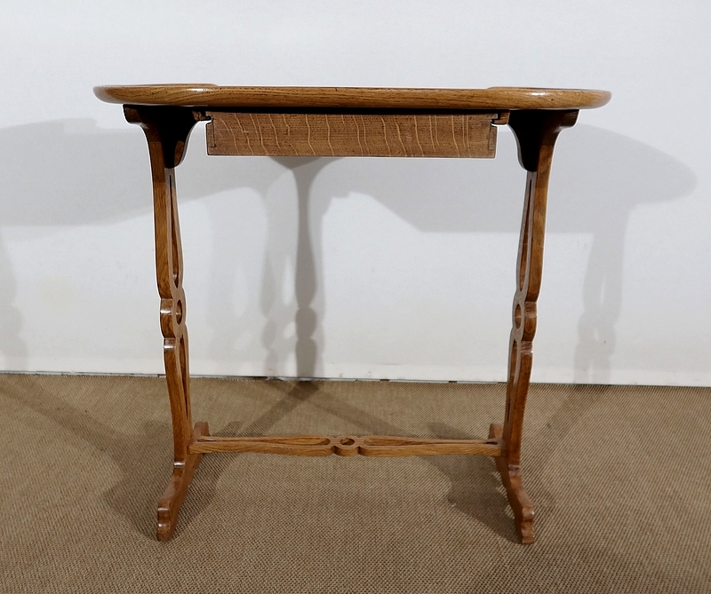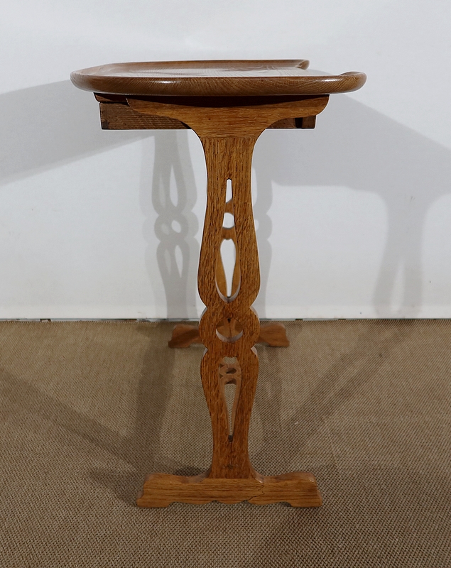 Charmante table desserte de forme rognon en chêne massif dotée d’un plateau à cuvette élégamment sculpté. Ce petit meuble présente en ceinture un tiroir en trémie. L’ensemble repose sur deux pieds lyre ajourés disposés sur une base. Les pieds sont reliés par entretoise ajourée également. finition cirée.