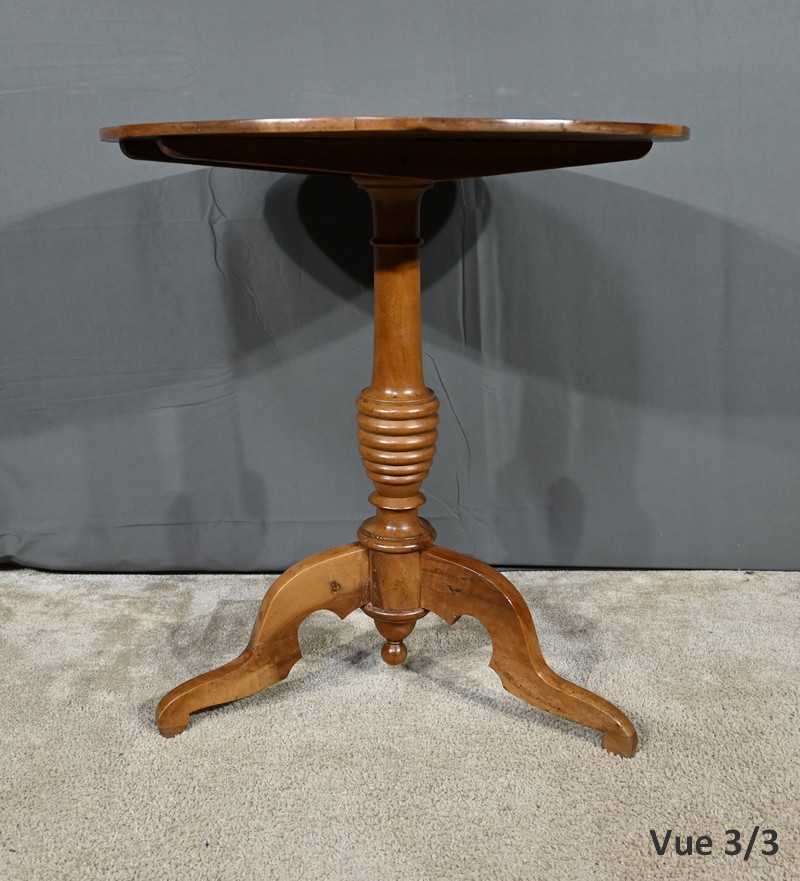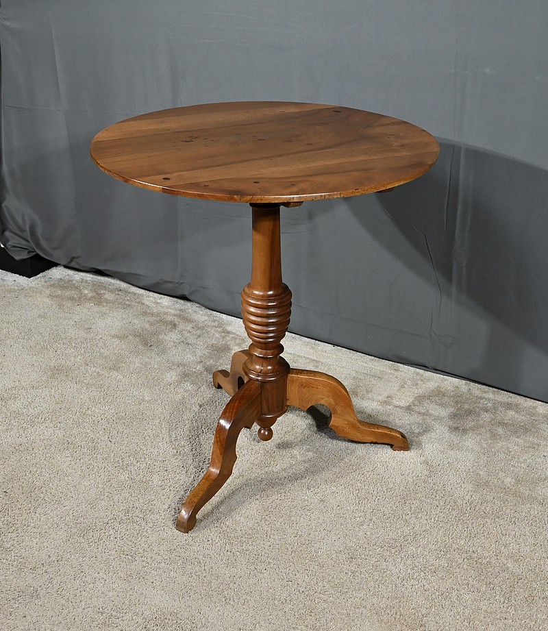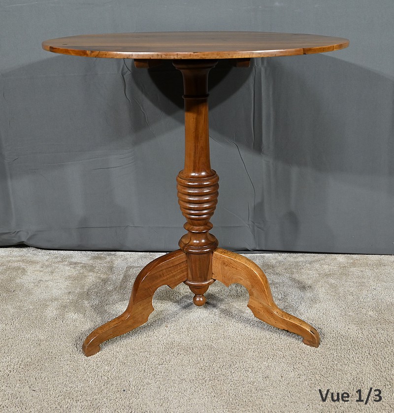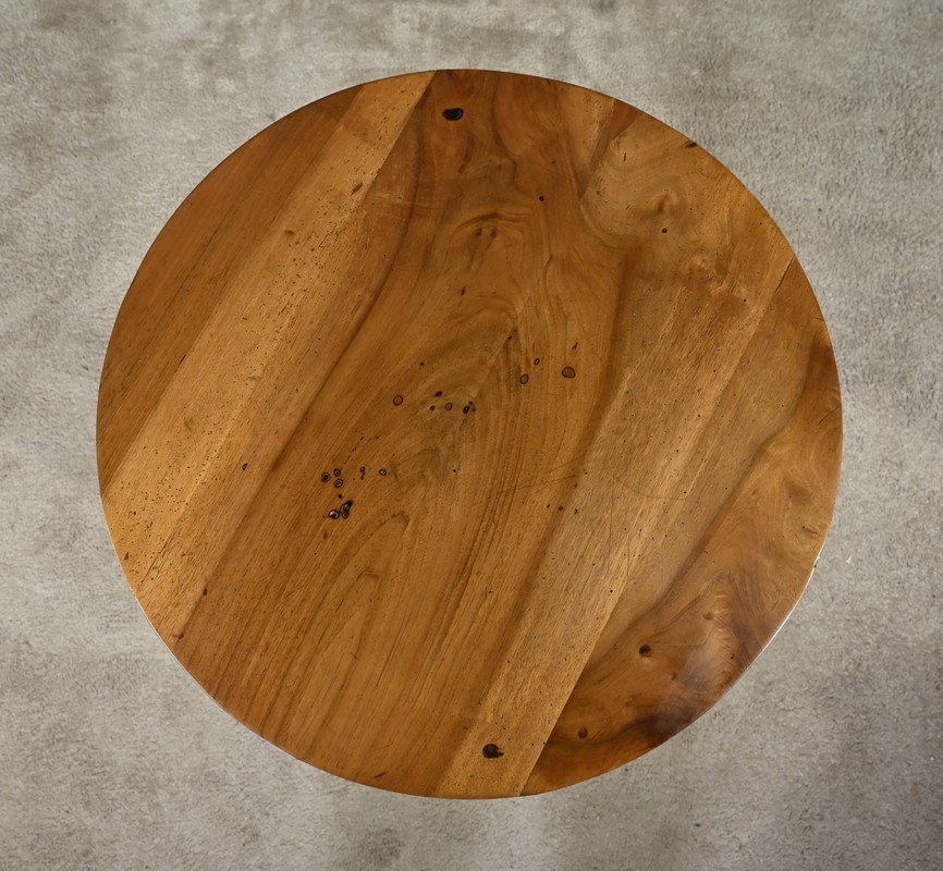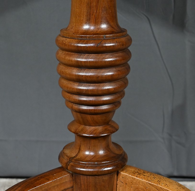 Guéridon circulaire doté d’un plateau constitué de trois planches de noyer bien jointives, soutenues par un fût cylindrique à bourrelets. Cette table repose sur un piétement tripode constitué de pieds mouvementés et évasés.