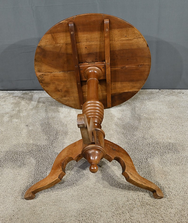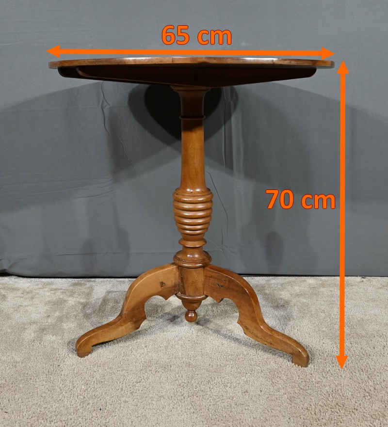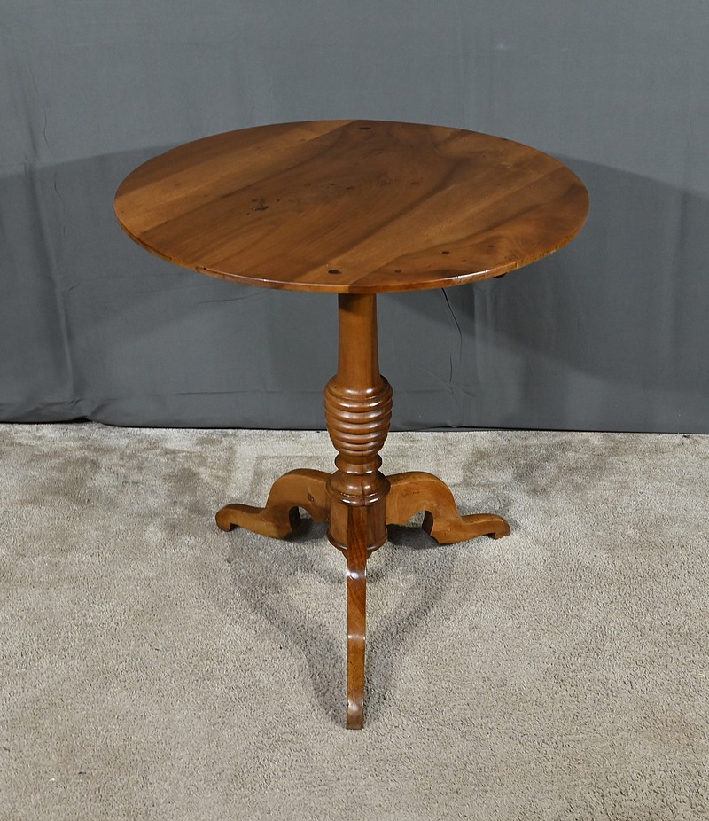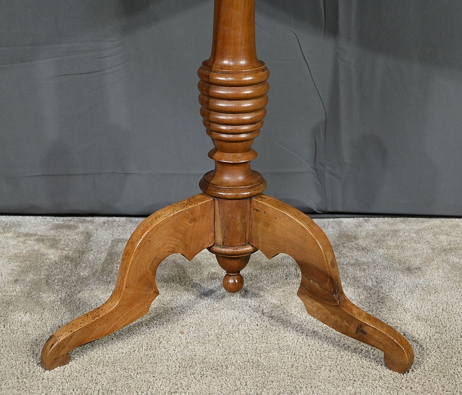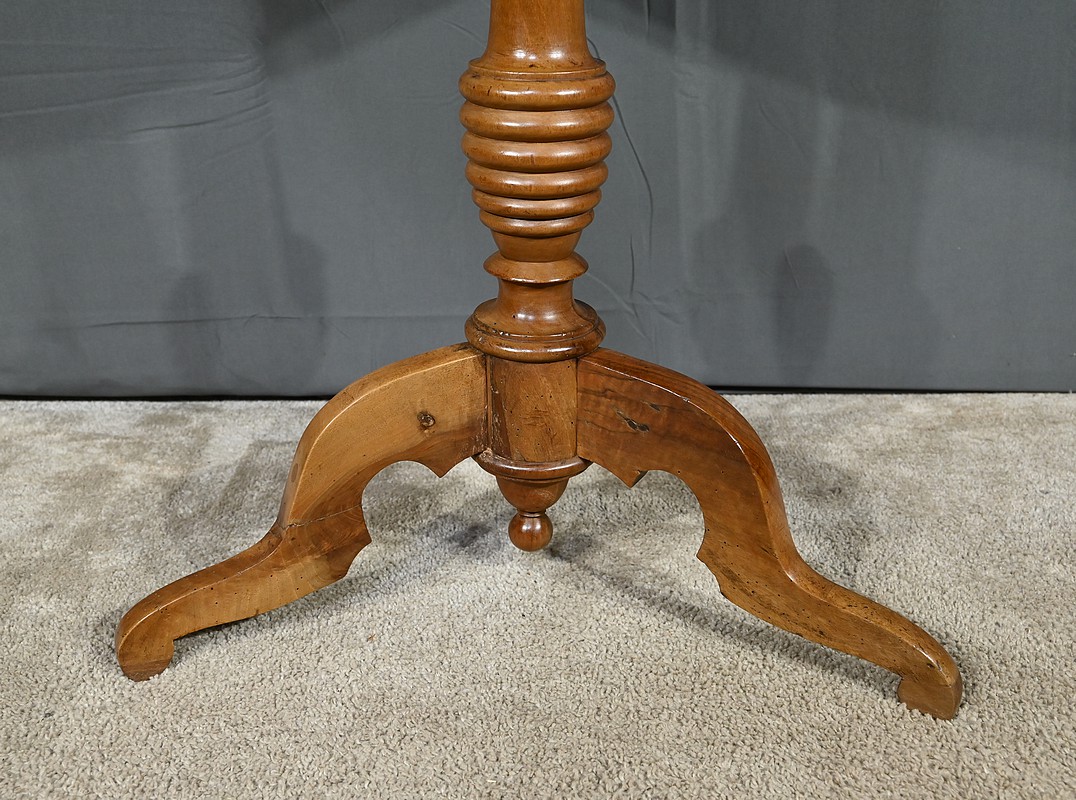 Guéridon circulaire doté d’un plateau constitué de trois planches de noyer bien jointives, soutenues par un fût cylindrique à bourrelets. Cette table repose sur un piétement tripode constitué de pieds mouvementés et évasés.