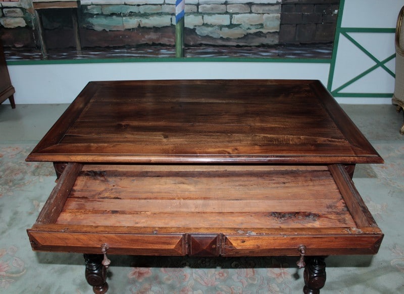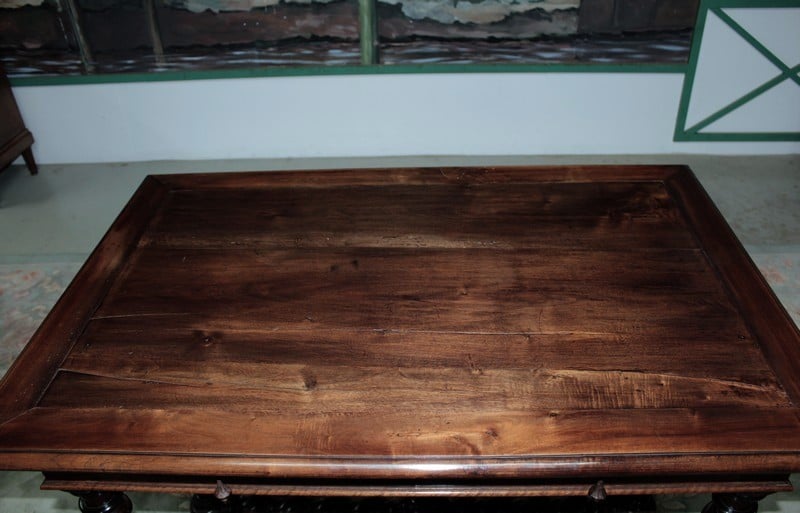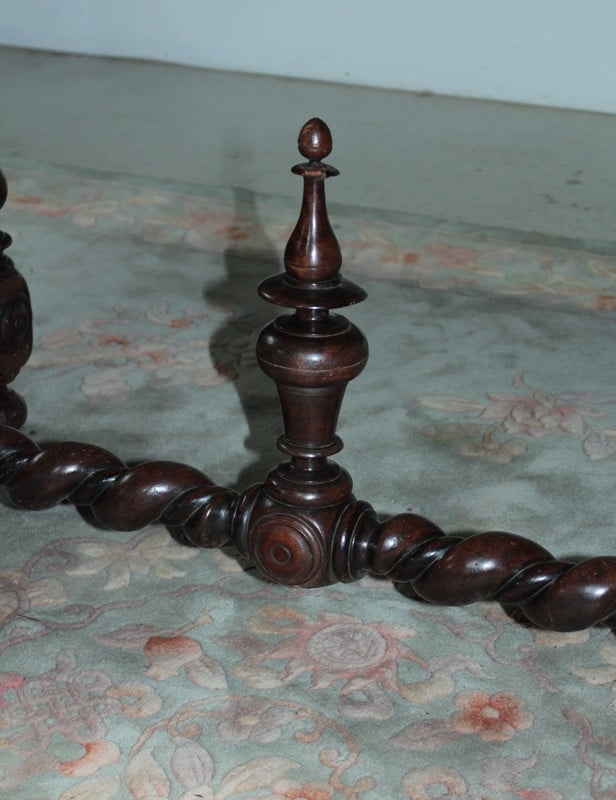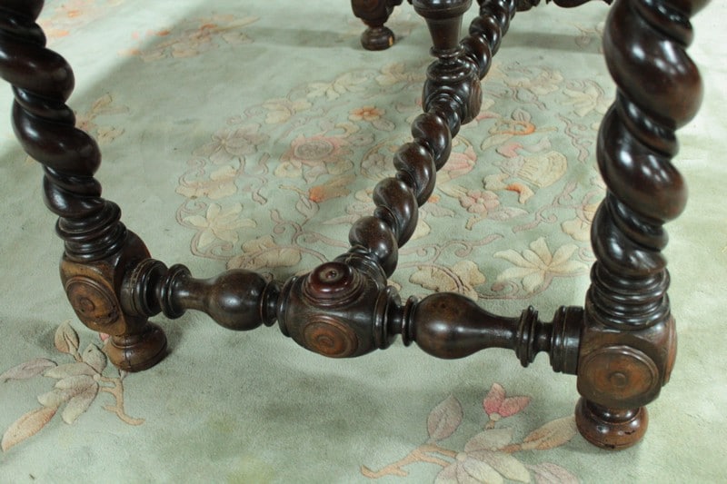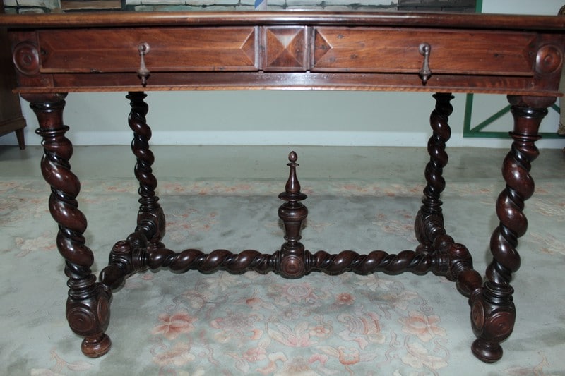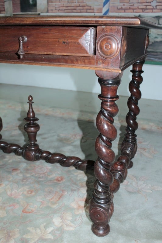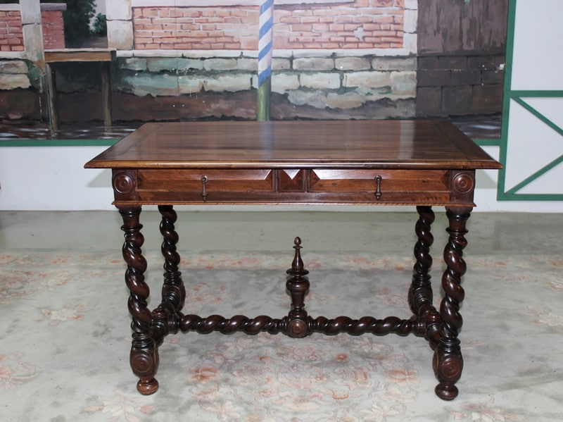 Table à écrire Louis XIII en noyer pour le plateau et le piètement et chêne pour les traverses (arrière et côtés). Les pieds en torsades allongées à lacet sont réunis par une entretoise. Époque : début XiXe. Finition cirée.