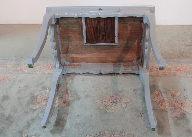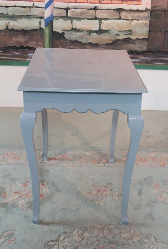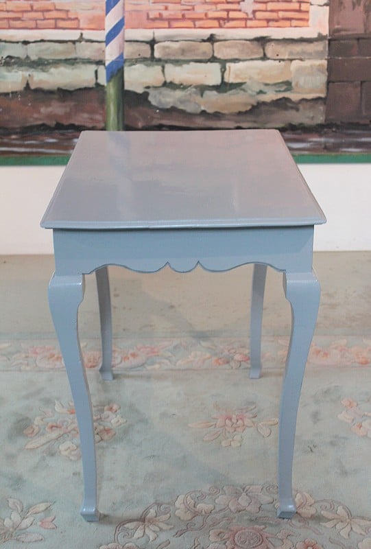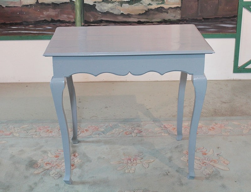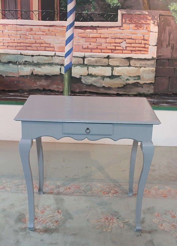Petite table Louis XV peinte en gris bleuté, reposant sur 4 pieds cambrés et ouvrant par un petit tiroir en ceinture.