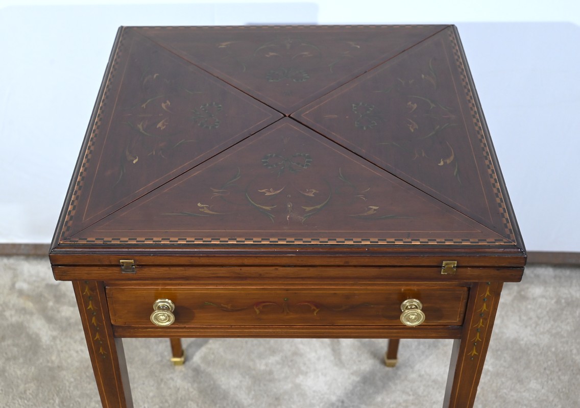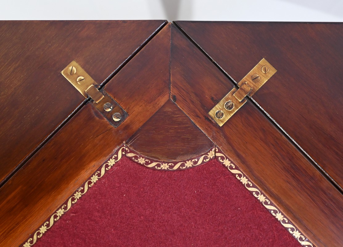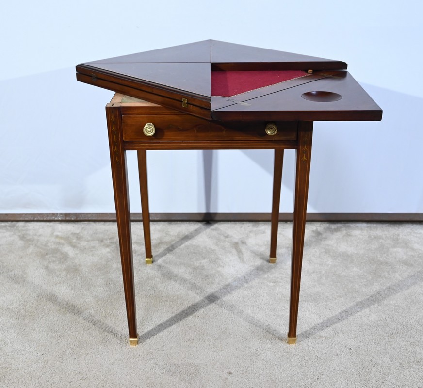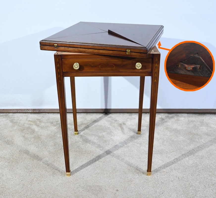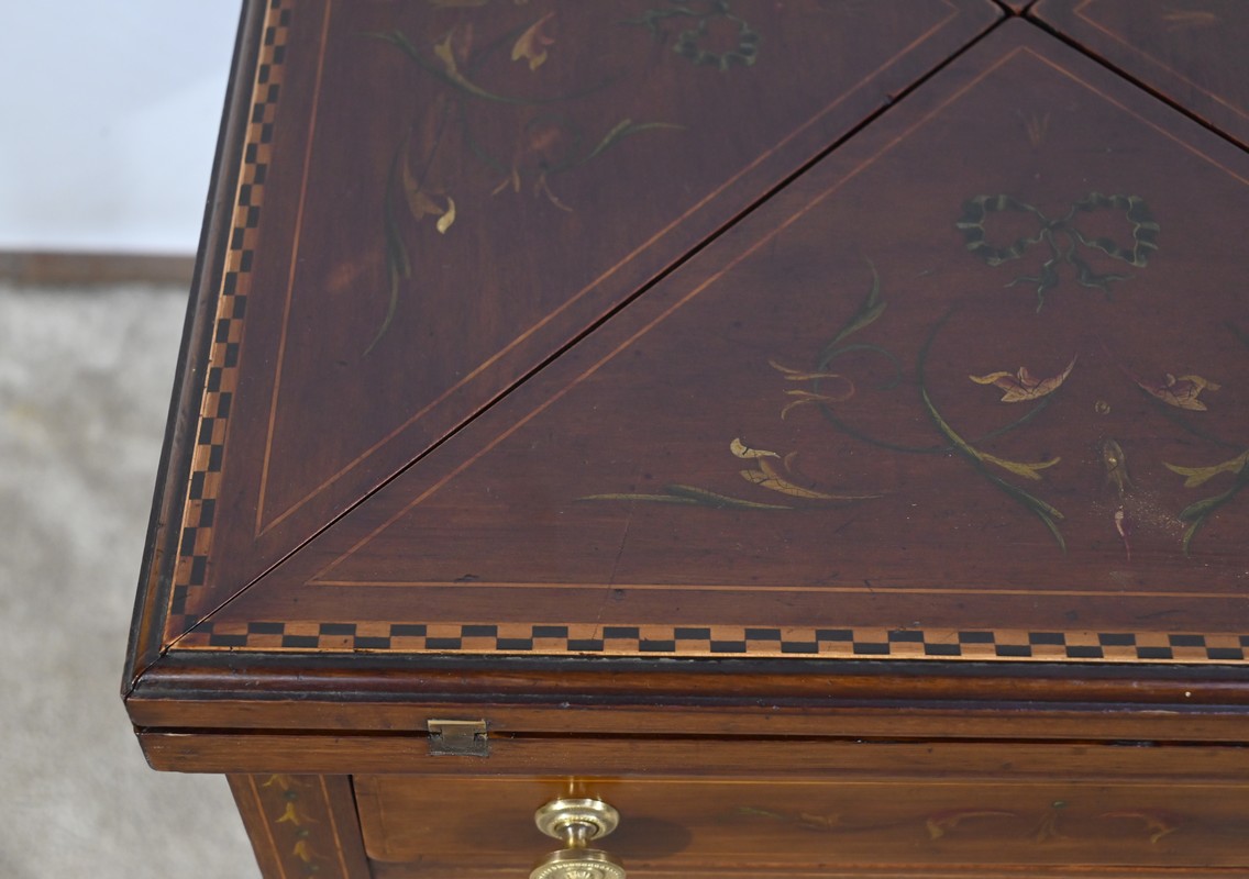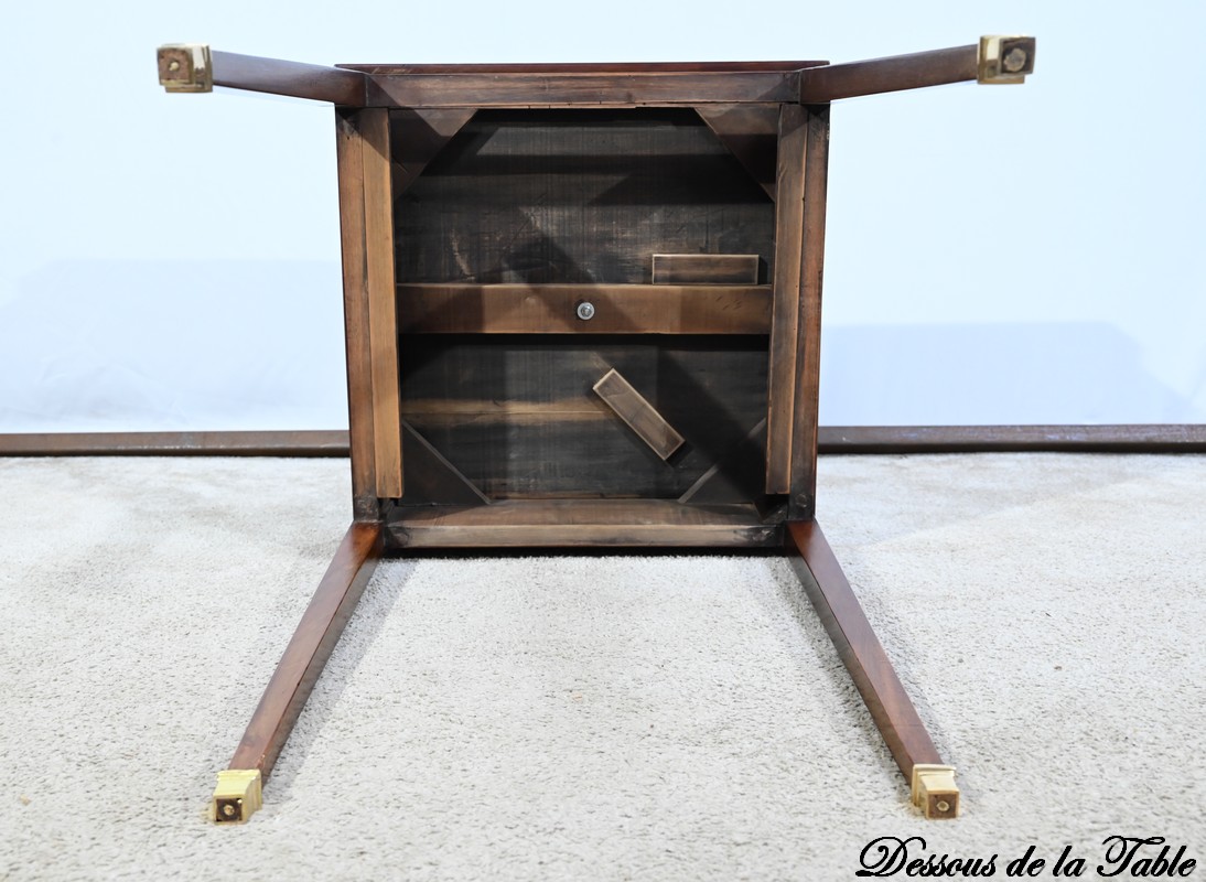 Le dessus, ceint d’une composition d’ébène et de citronnier, est composé de quatre triangles, à décors identiques, montés sur charnières laiton. En pivotant le plateau, un ergot situé en dessous permet de soulever un de ces triangles afin de faciliter le dépliage.
