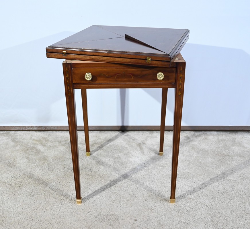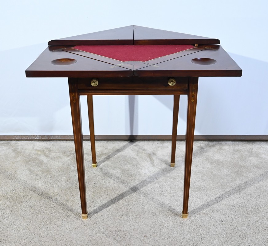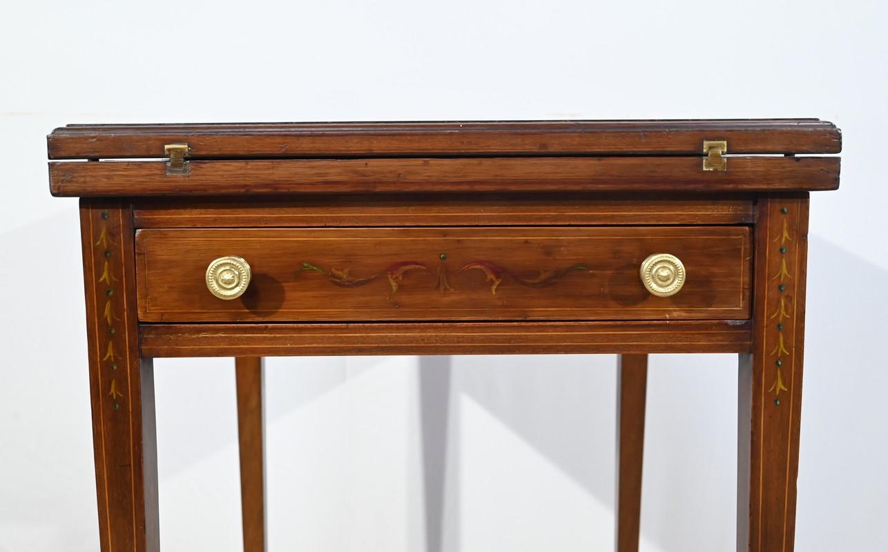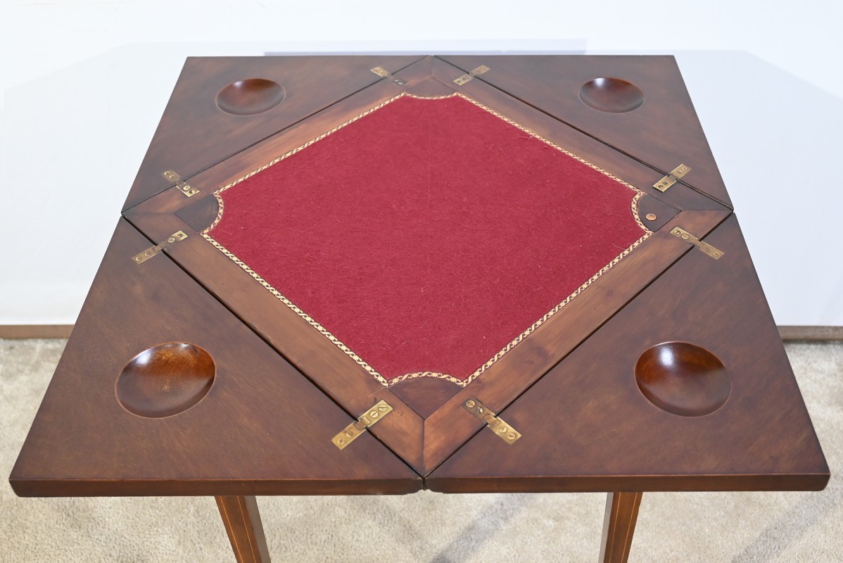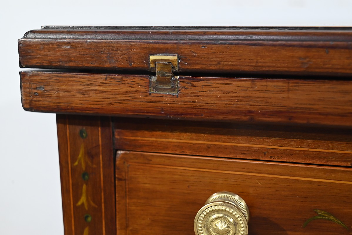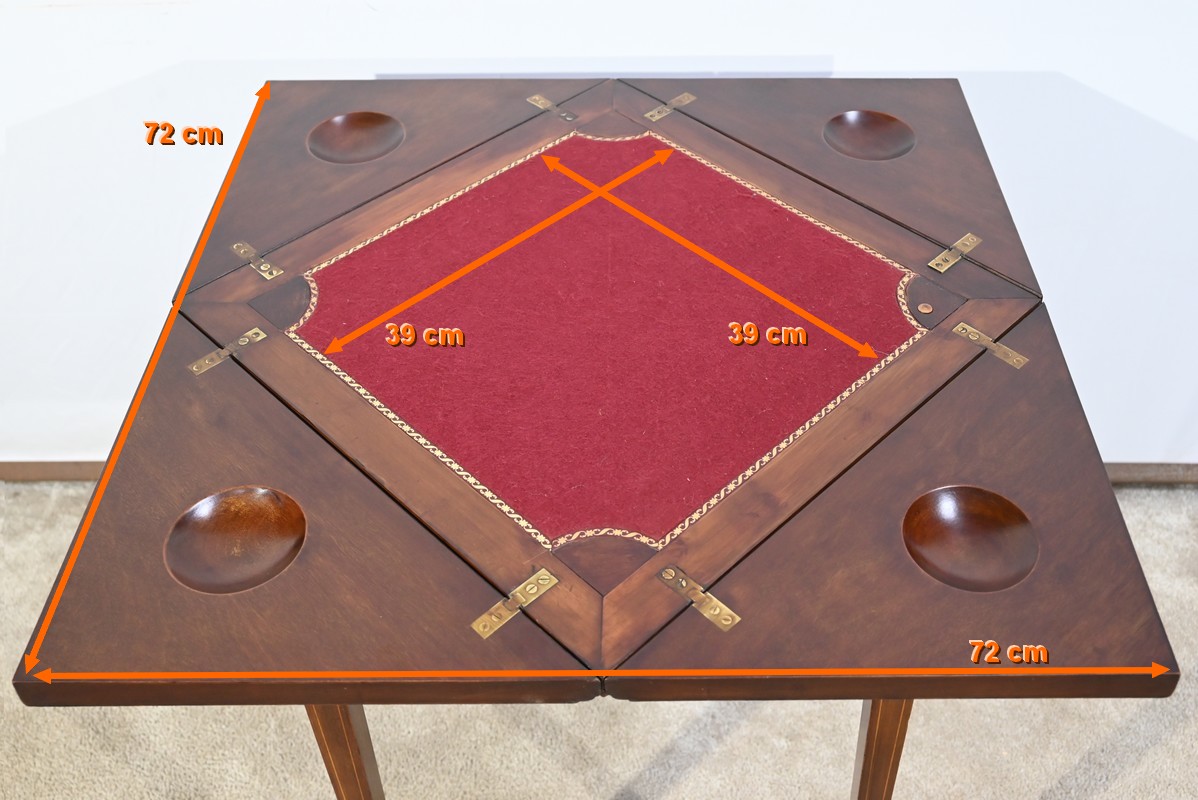 Le dessus, ceint d’une composition d’ébène et de citronnier, est composé de quatre triangles, à décors identiques, montés sur charnières laiton. En pivotant le plateau, un ergot situé en dessous permet de soulever un de ces triangles afin de faciliter le dépliage.