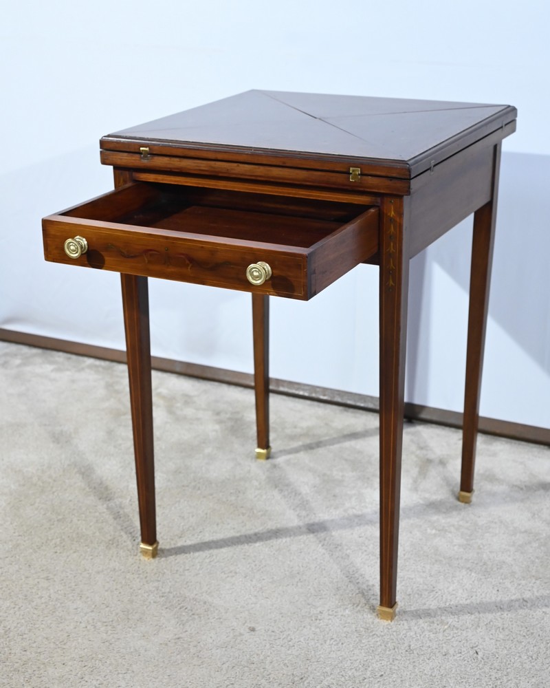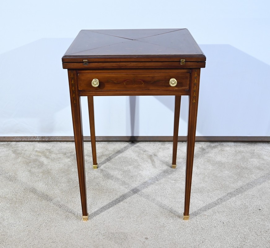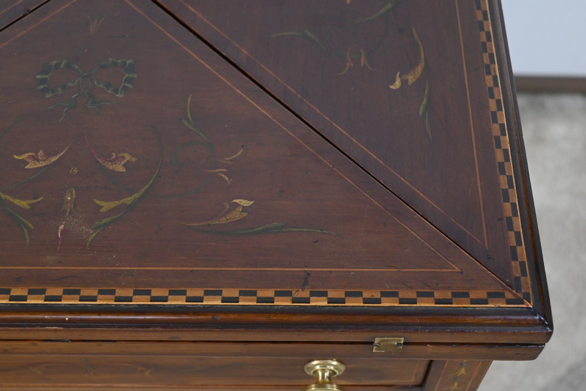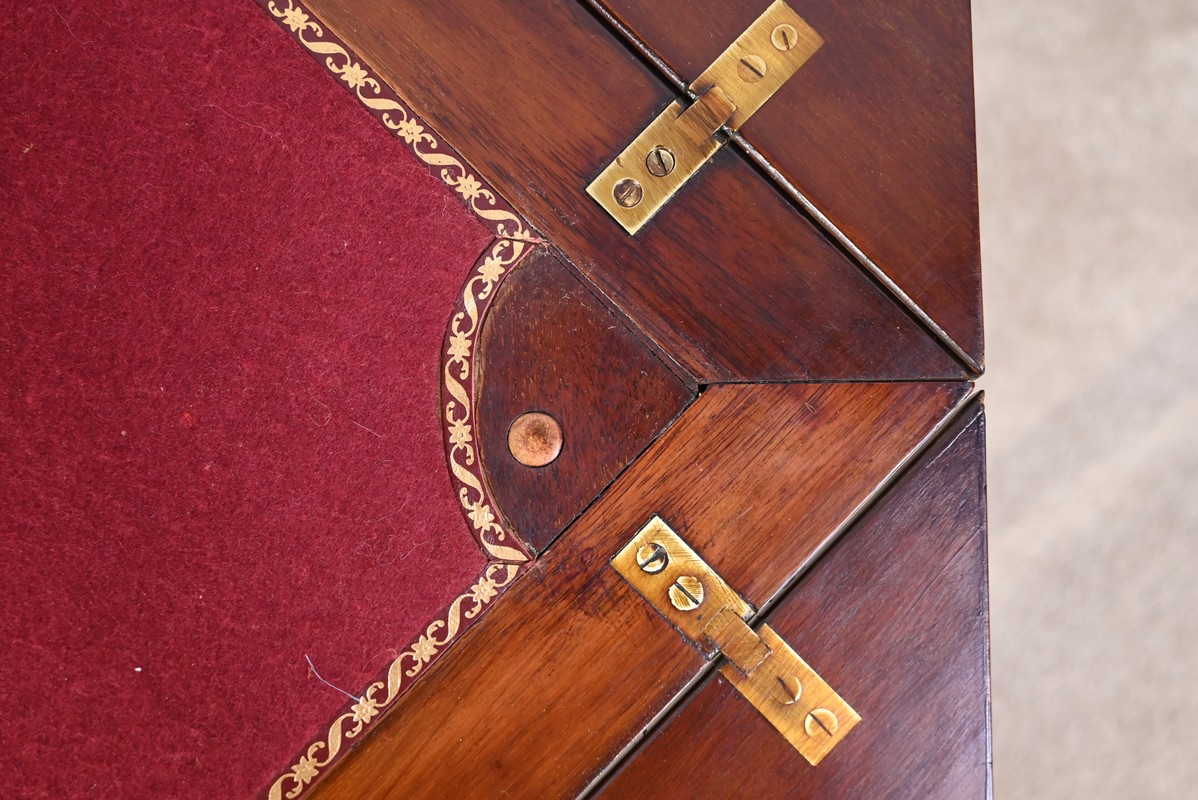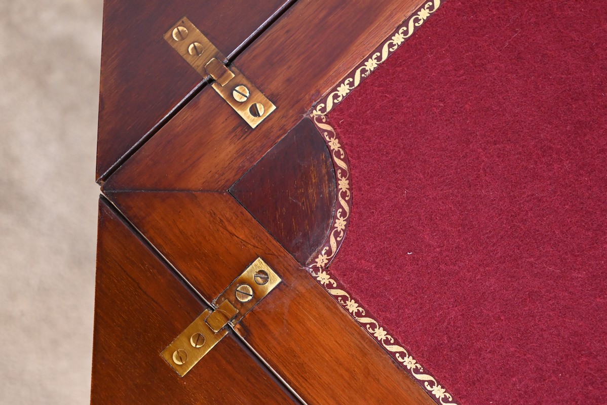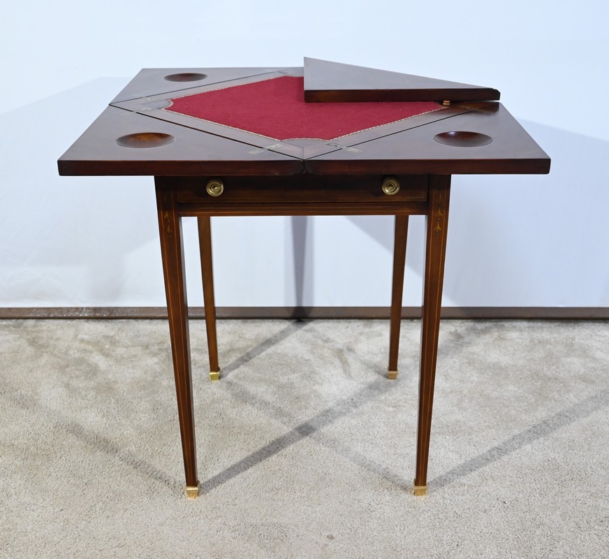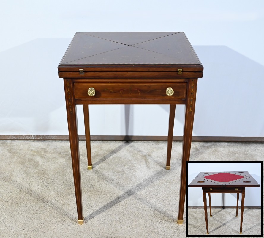 Le dessus, ceint d’une composition d’ébène et de citronnier, est composé de quatre triangles, à décors identiques, montés sur charnières laiton. En pivotant le plateau, un ergot situé en dessous permet de soulever un de ces triangles afin de faciliter le dépliage.