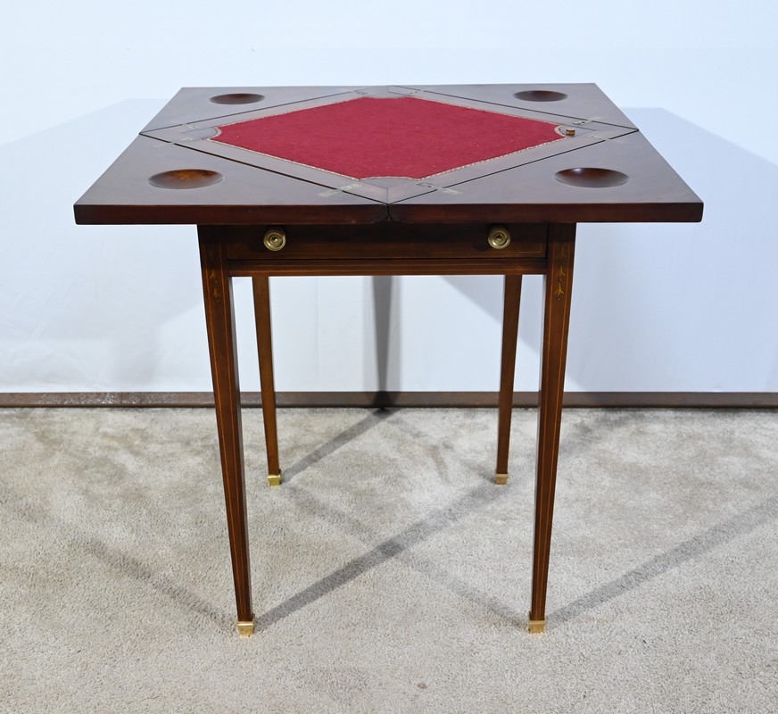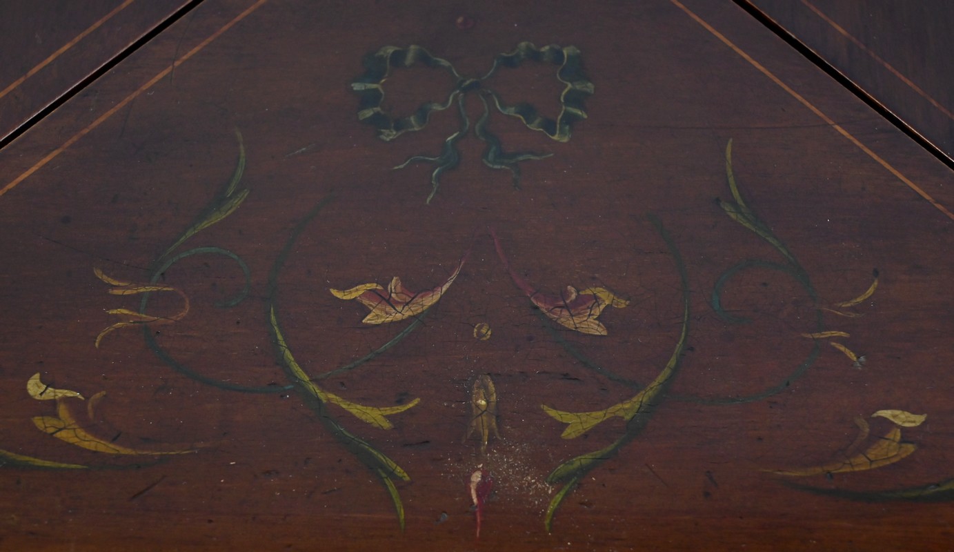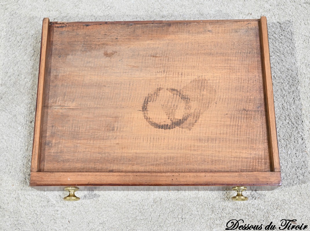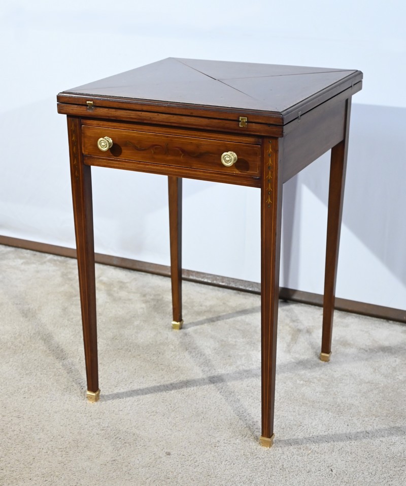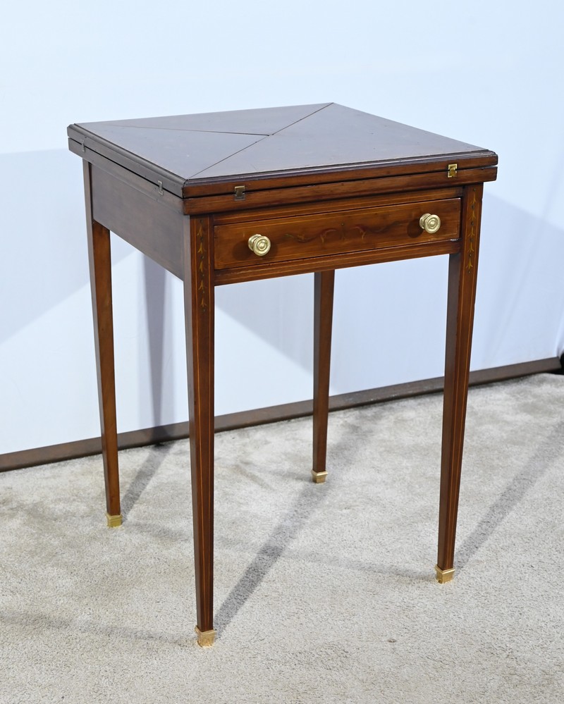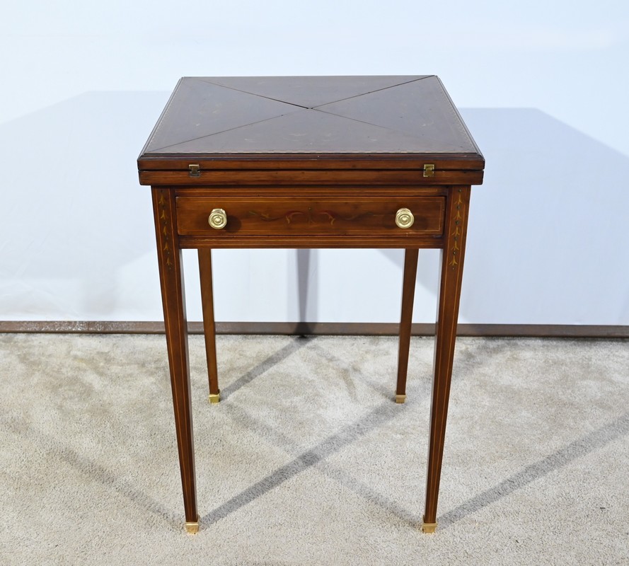 Le dessus, ceint d’une composition d’ébène et de citronnier, est composé de quatre triangles, à décors identiques, montés sur charnières laiton. En pivotant le plateau, un ergot situé en dessous permet de soulever un de ces triangles afin de faciliter le dépliage.