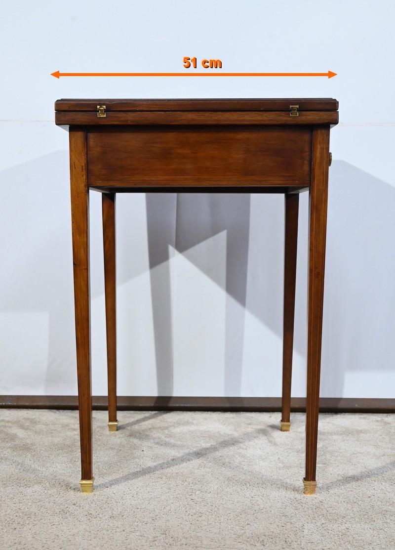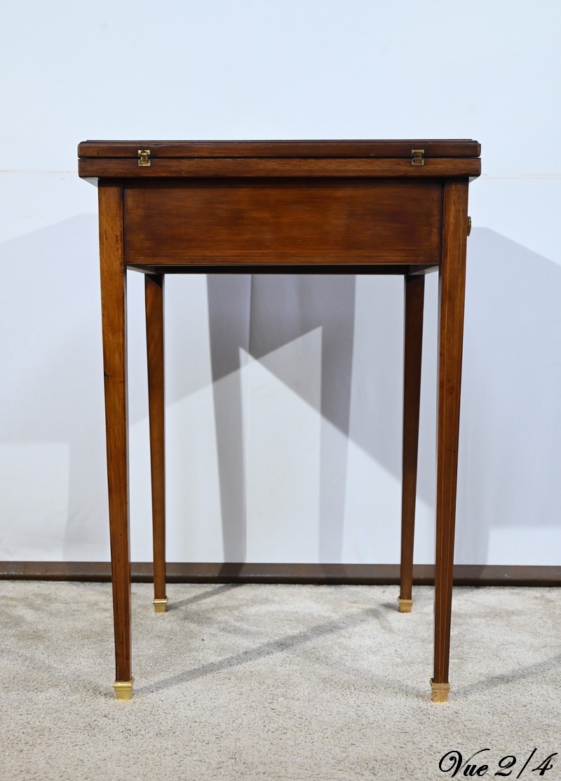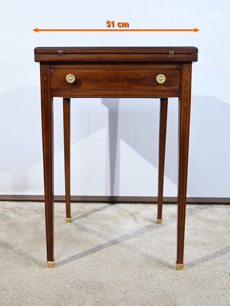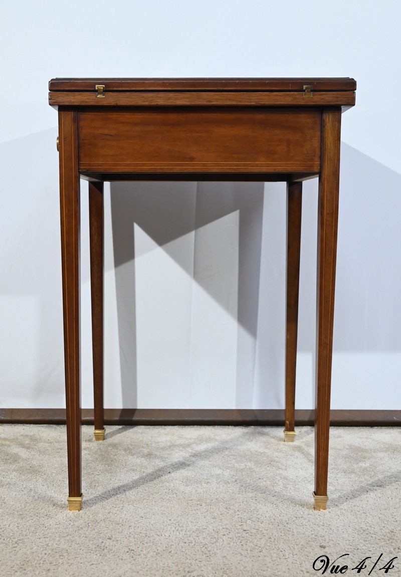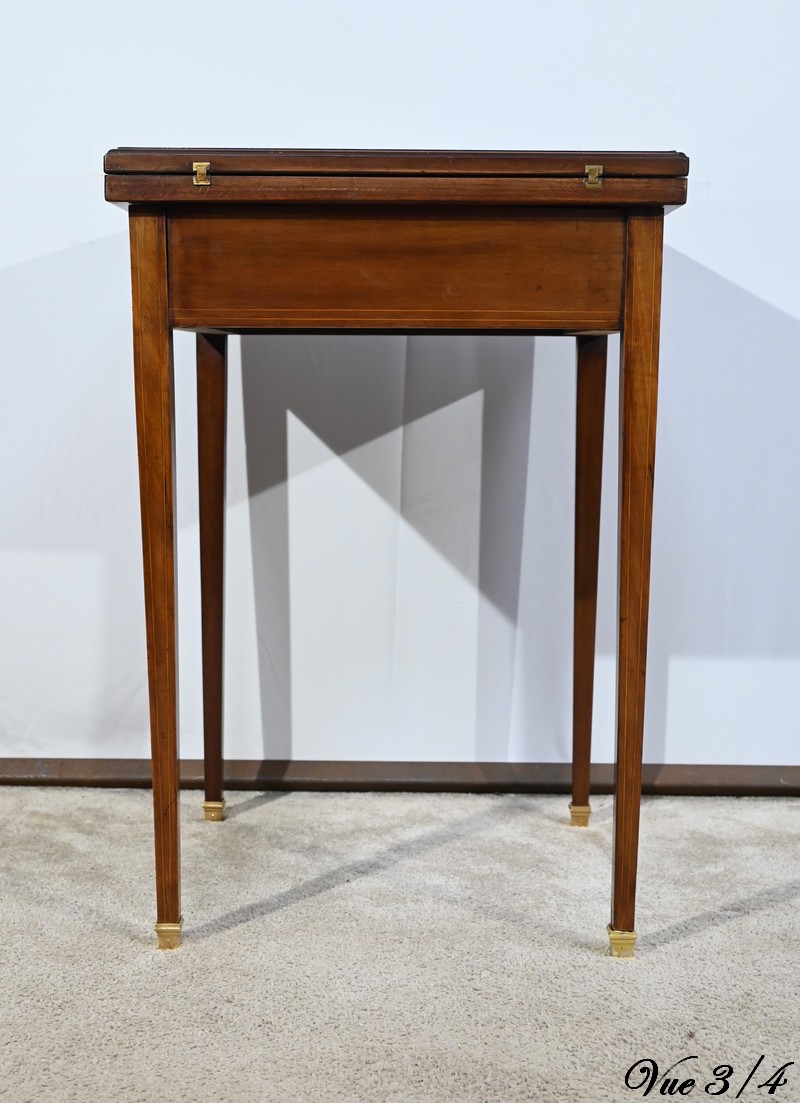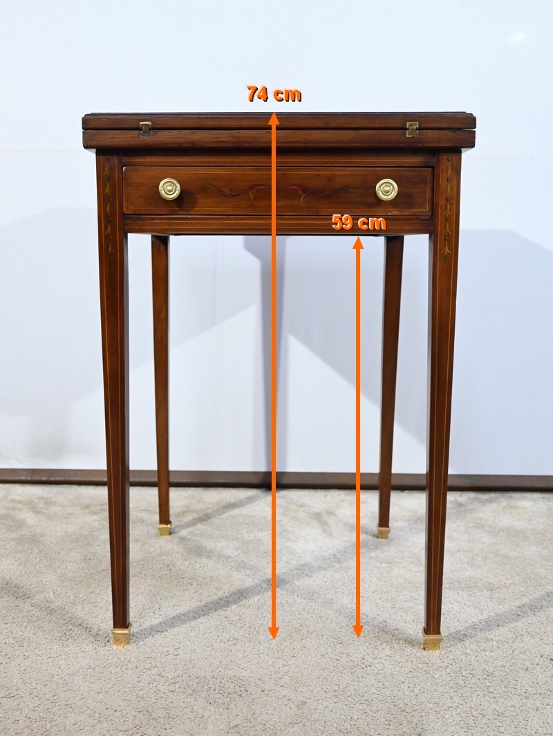 Le dessus, ceint d’une composition d’ébène et de citronnier, est composé de quatre triangles, à décors identiques, montés sur charnières laiton. En pivotant le plateau, un ergot situé en dessous permet de soulever un de ces triangles afin de faciliter le dépliage.