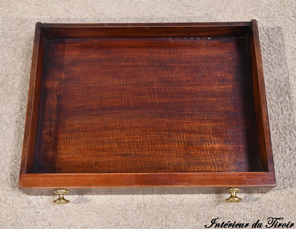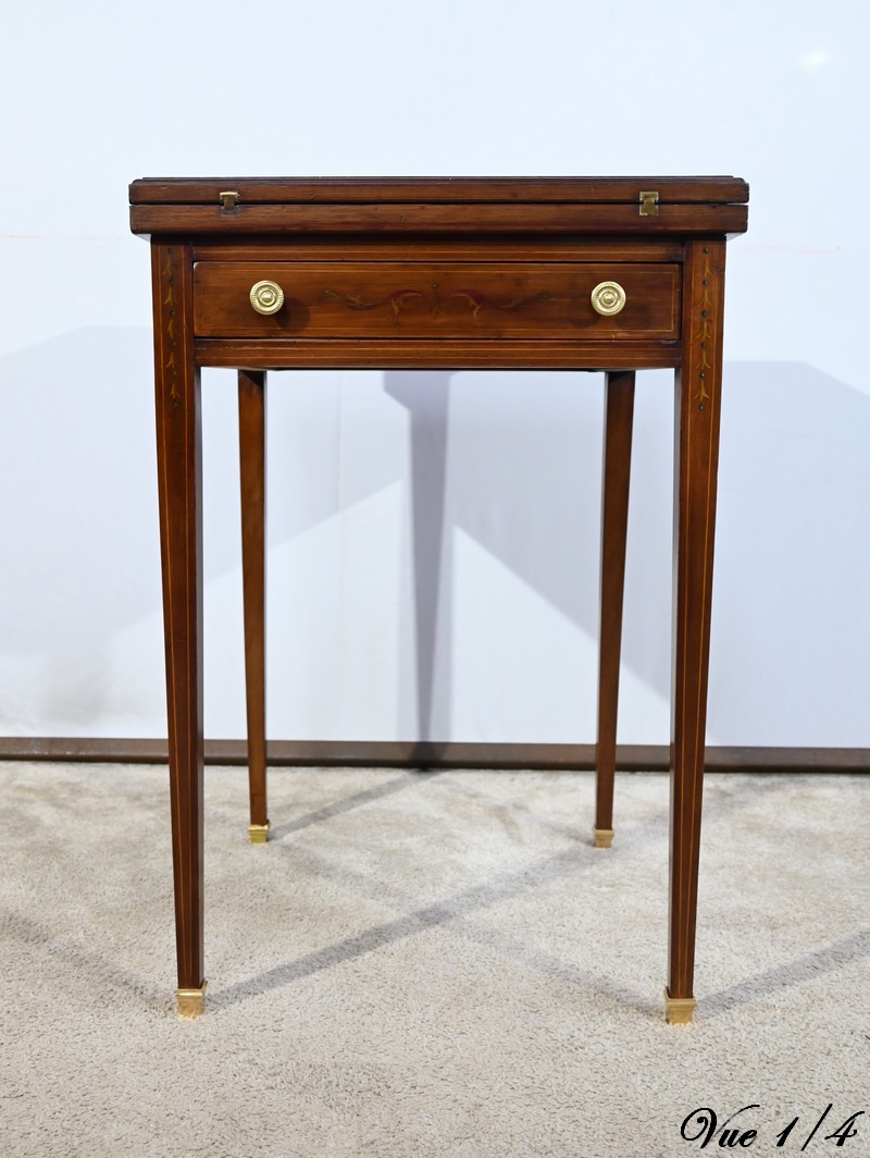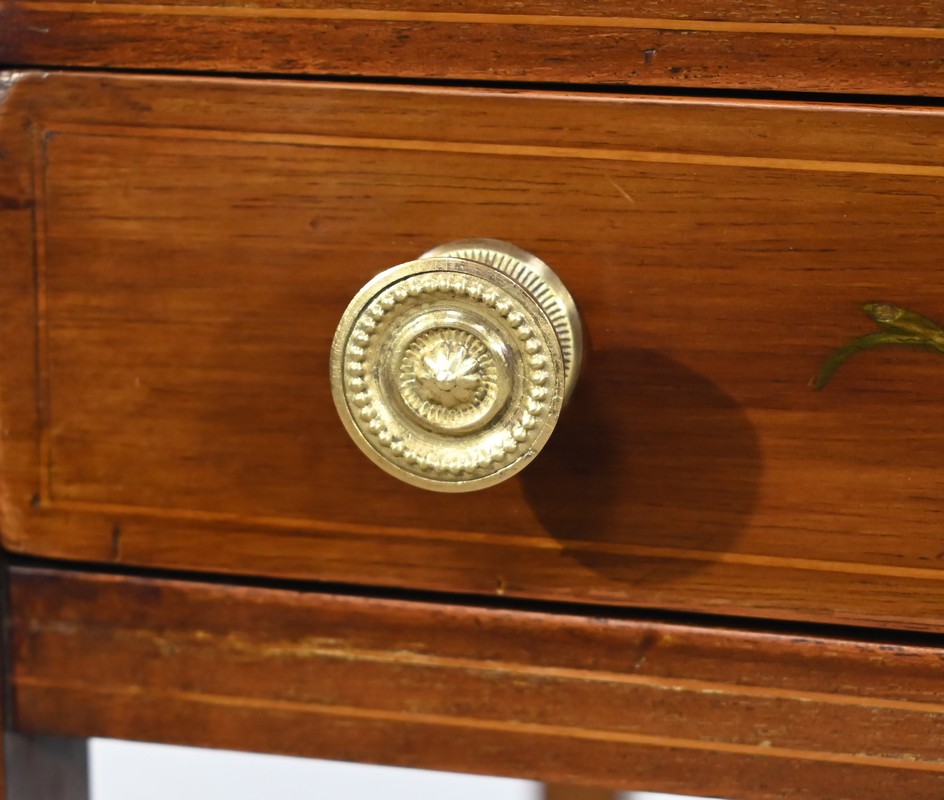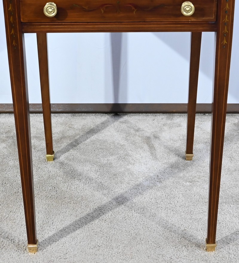 Cette table en acajou massif, de forme carrée, présente un tiroir en ceinture avec filets incrustés et petits motifs peints. Ce tiroir est garni de boutons cuvettes perlés avec rosaces.