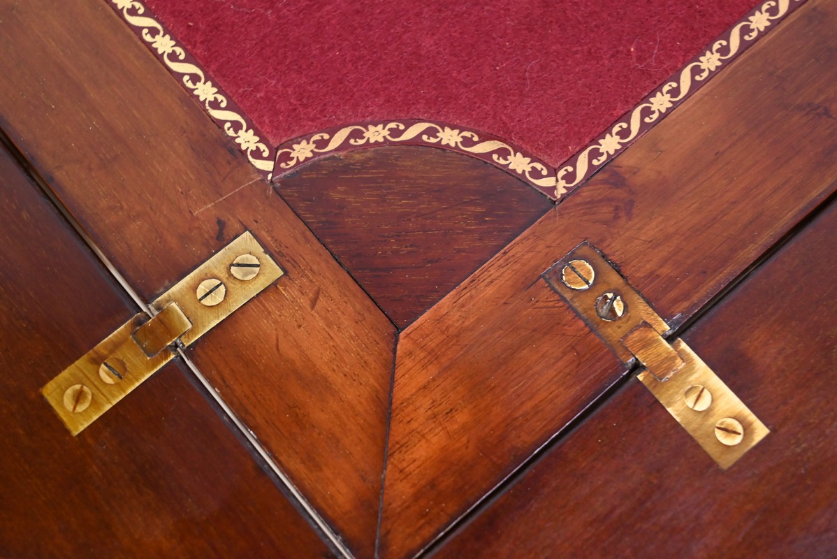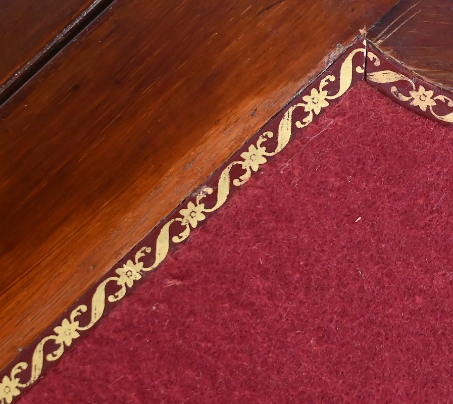 L’ouverture dévoile une surface de jeux, habillée d’une feutrine rouge refaite, avec galon.