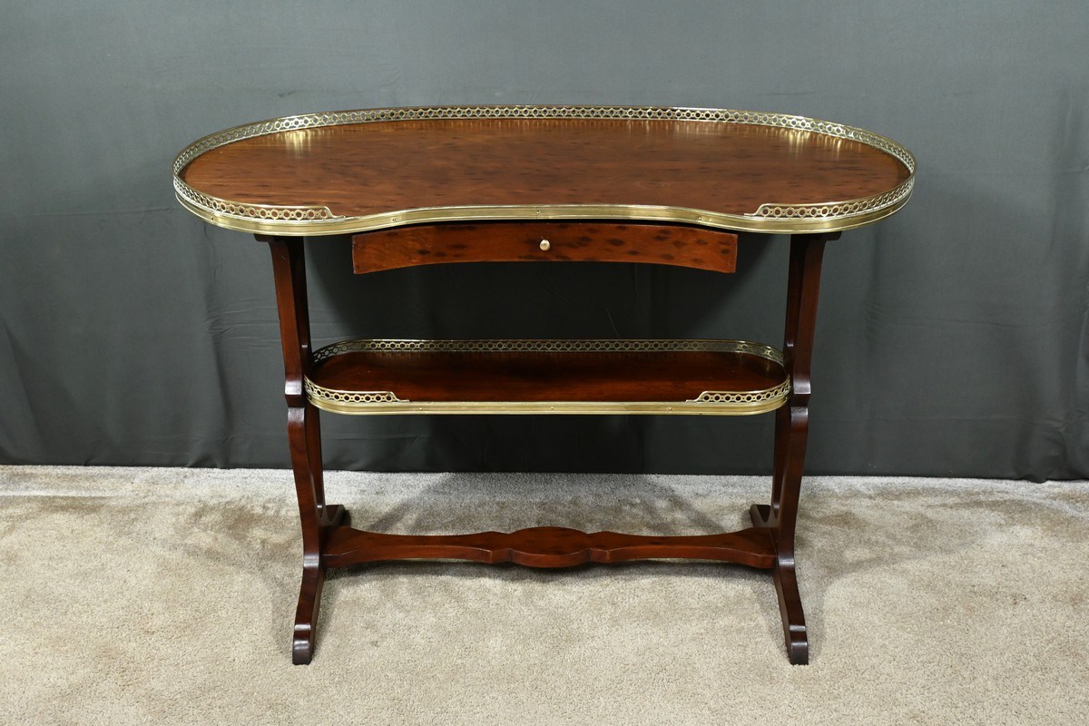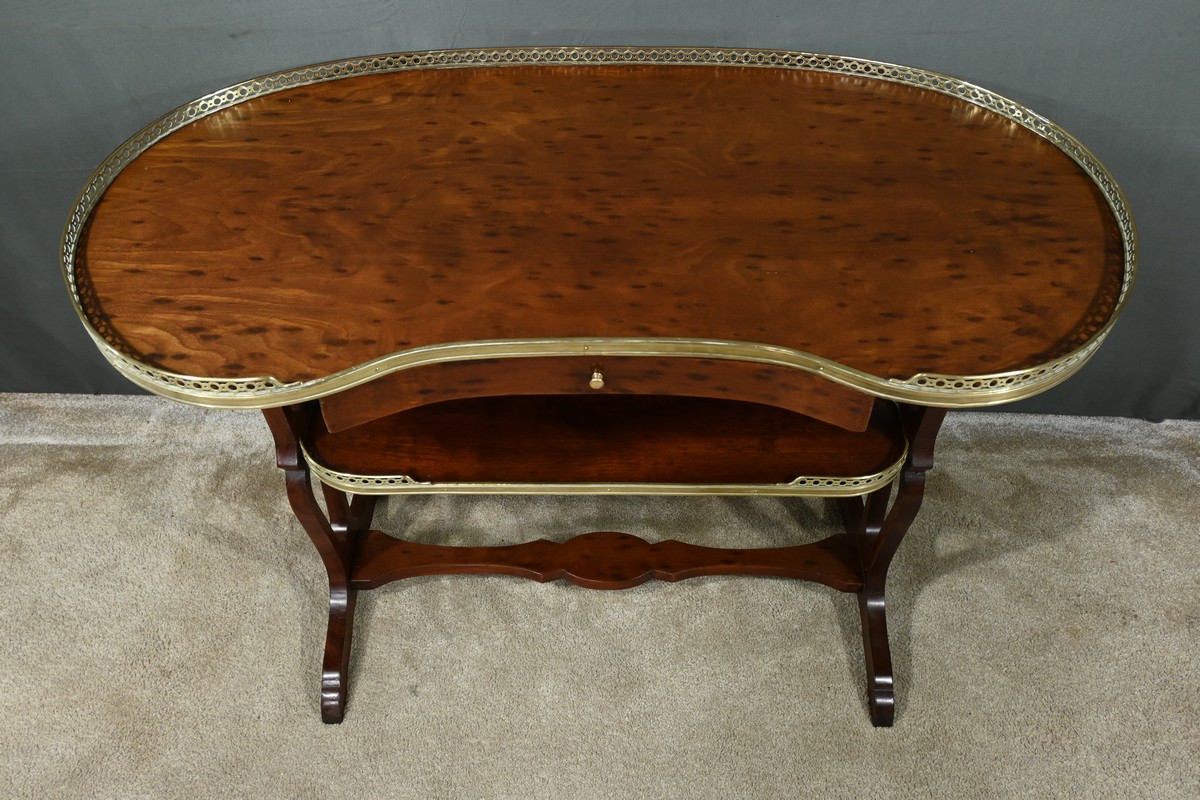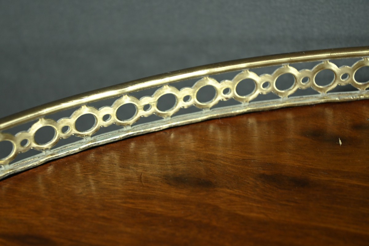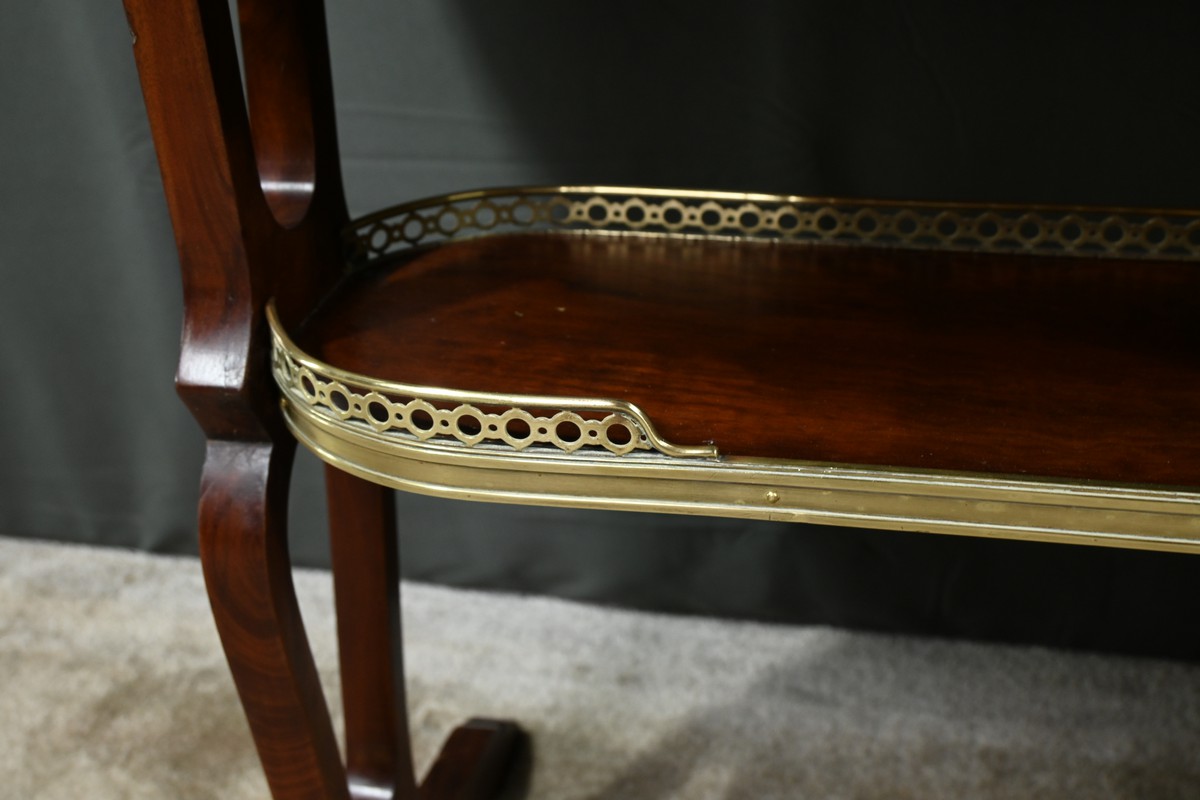 Le plateau et la tablette inférieure sont entourés d’une galerie en laiton doré finement ajourée, soulignant la délicatesse de l’artisanat.