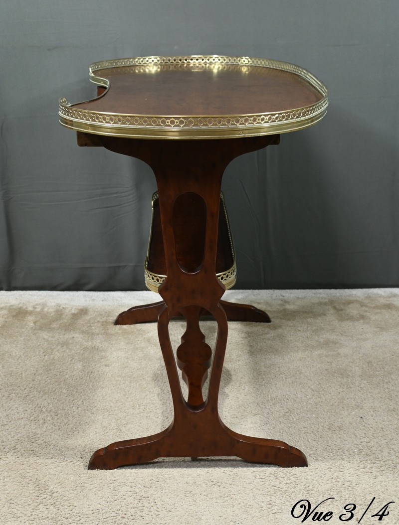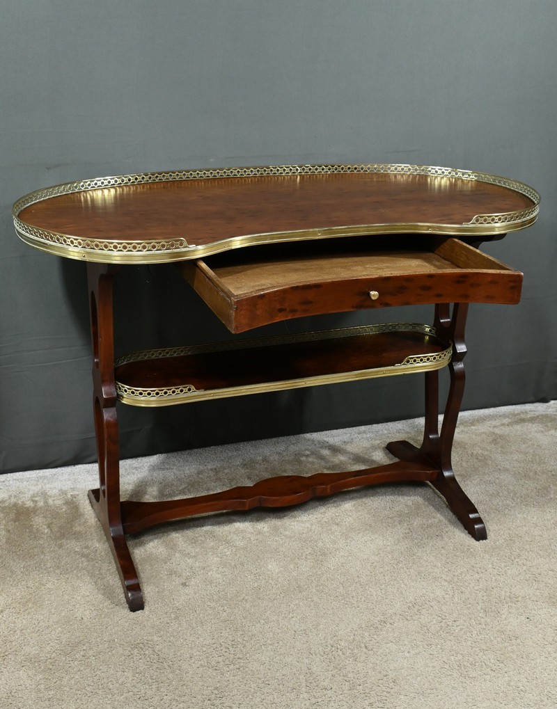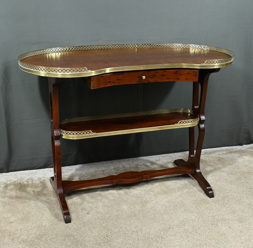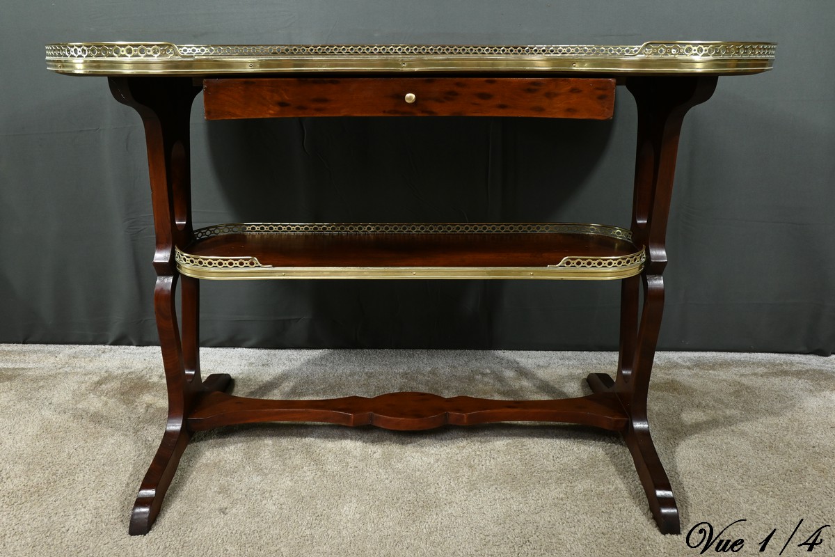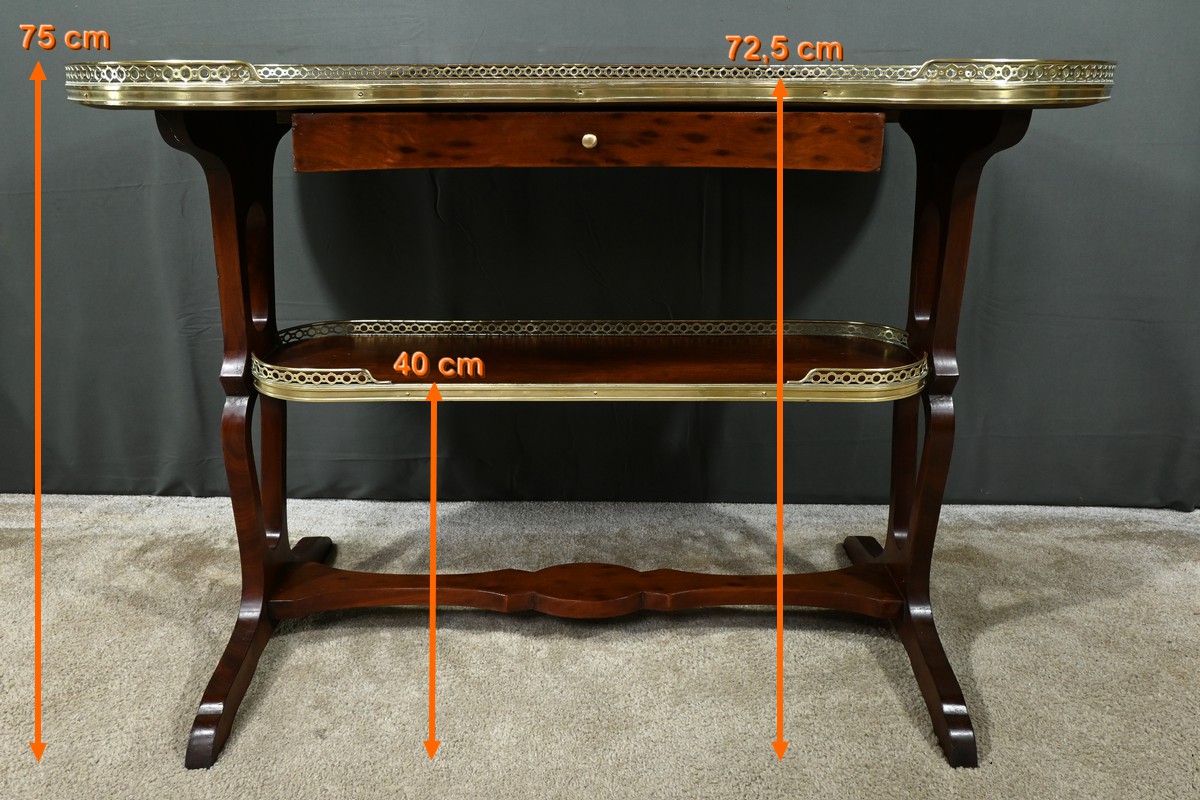 Le plateau et la tablette inférieure sont entourés d’une galerie en laiton doré finement ajourée, soulignant la délicatesse de l’artisanat.