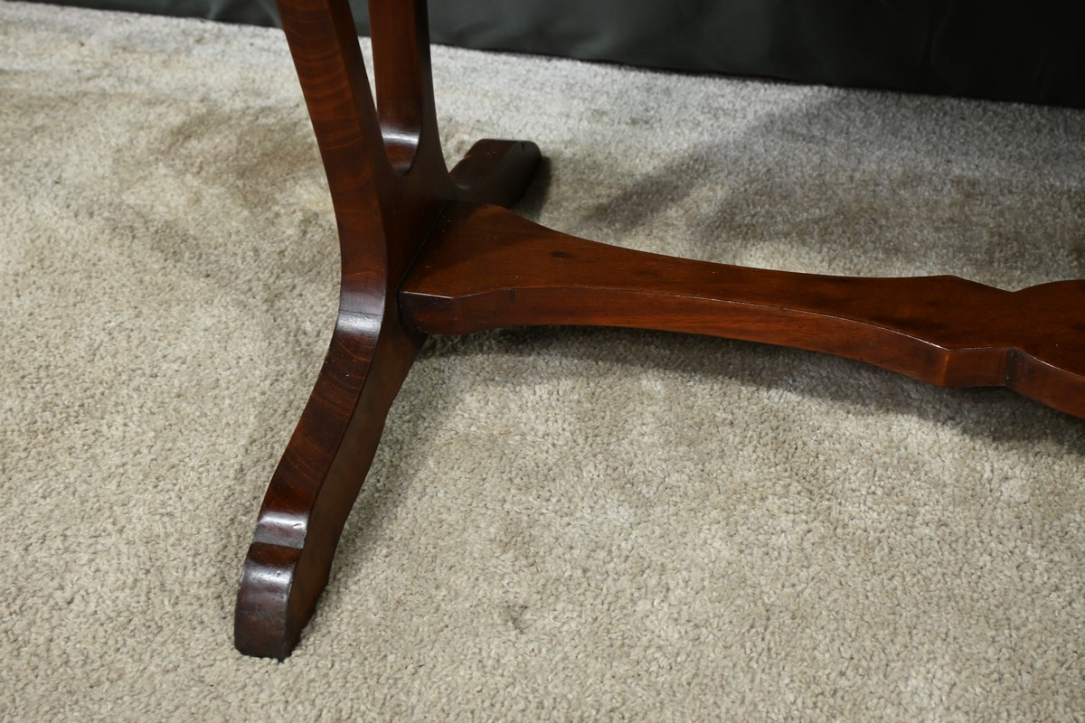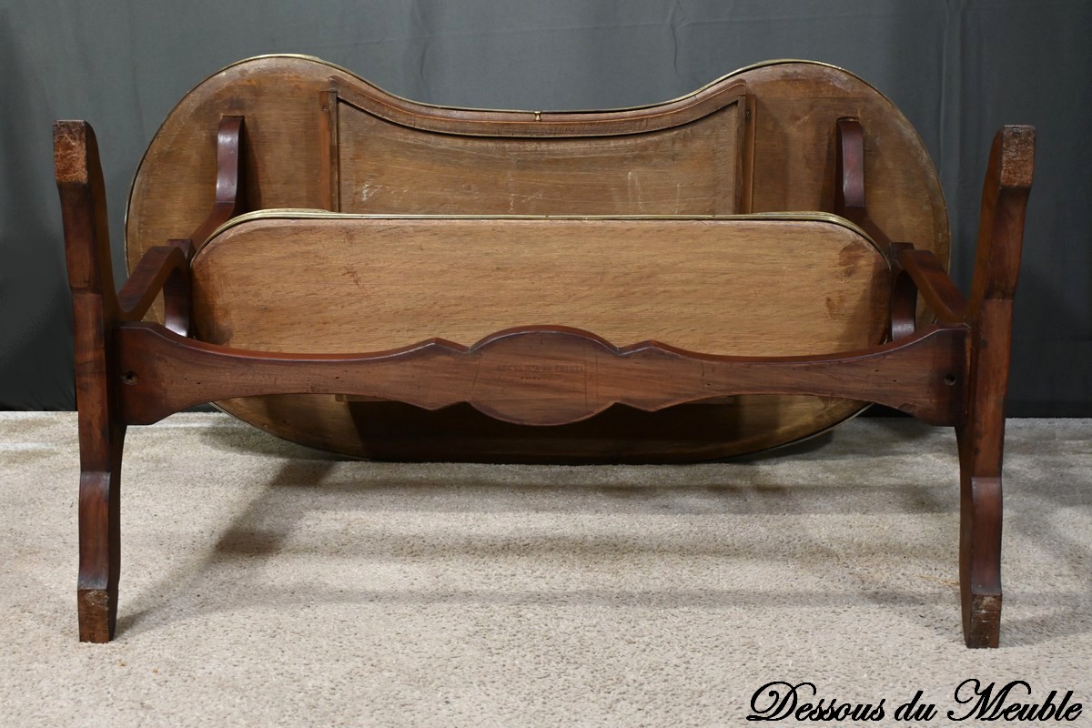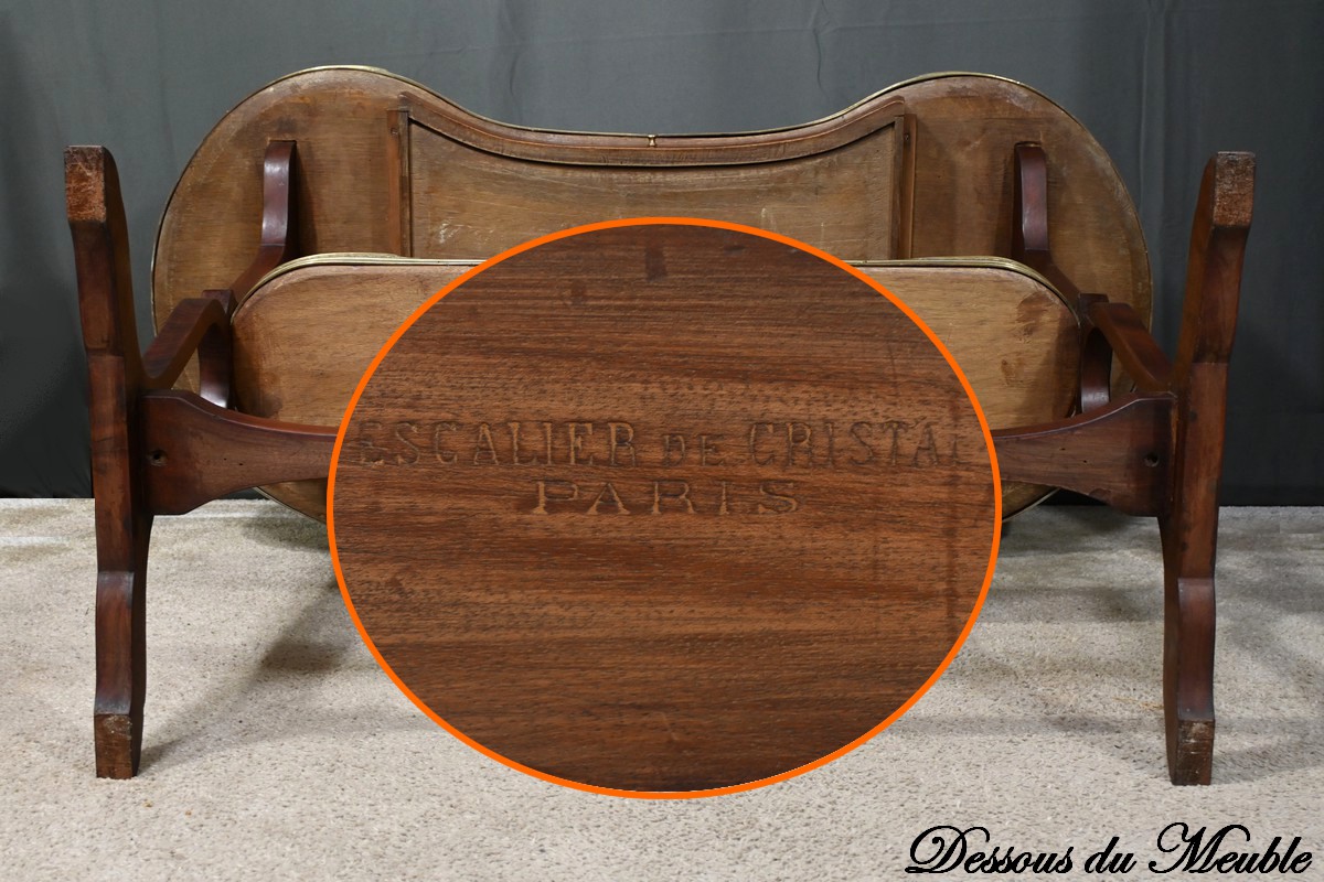 Cette table rognon de milieu en moucheté d’acajou, estampillée de la prestigieuse maison parisienne “L’escalier de Cristal”, est un véritable chef-d’œuvre de la fin du XIXe siècle.