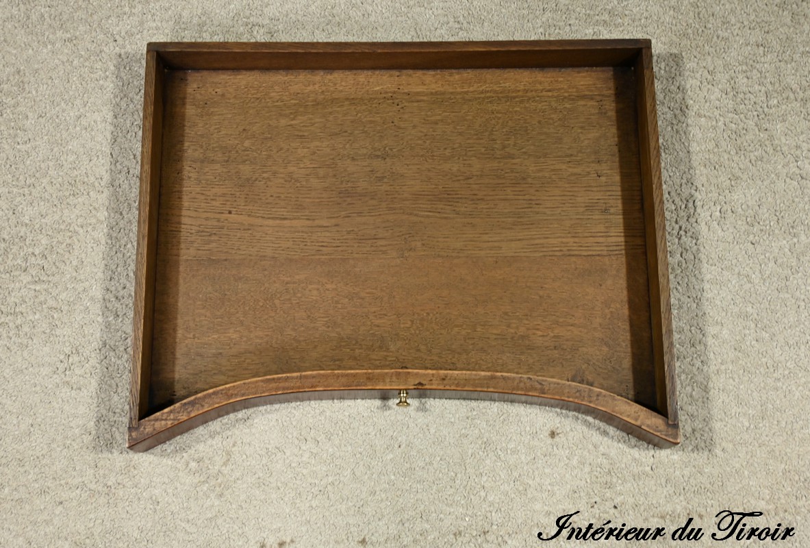 La façade de la table s’ouvre sur un tiroir incurvé élégant, orné d’un bouton lentille, ajoutant une touche de raffinement.