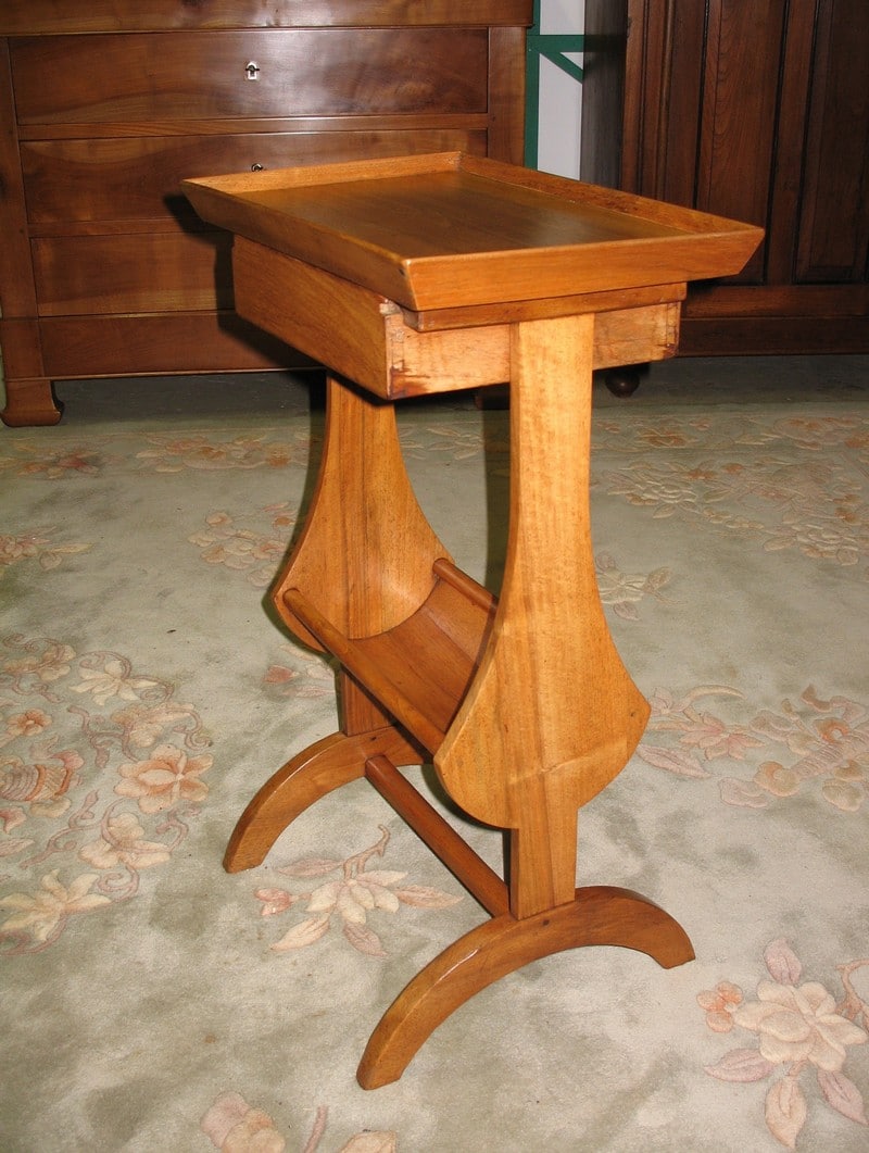 Petite table vide-poche en noyer blond ouvrant à un tiroir. Dessus en cuvette et tablette d’entretoise. Époque XIXe