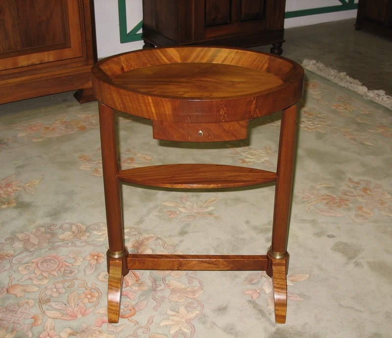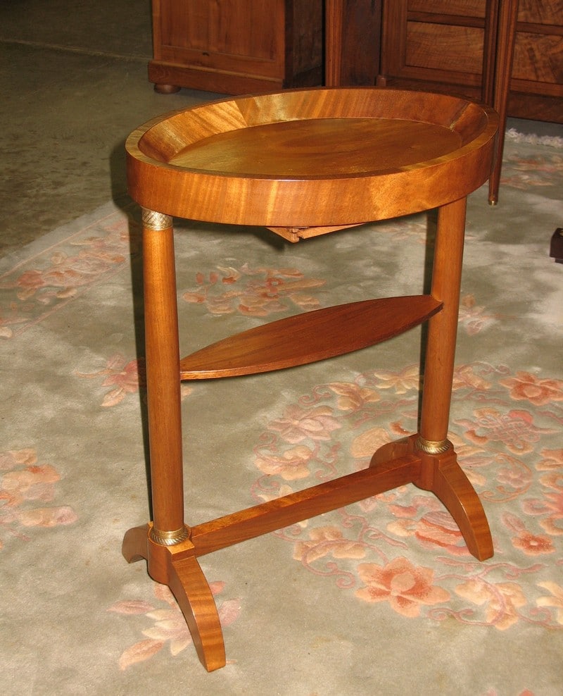 Petite table vide-poche ovale dans le goût Empire en Acajou blond. Plateau cuvette, tablette et bagues de bronze sur les colonnes. Époque : début XXe