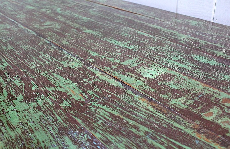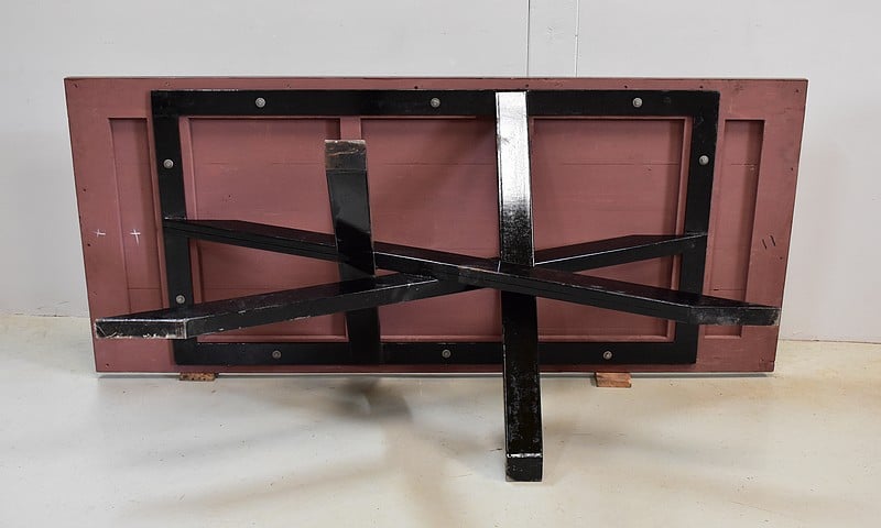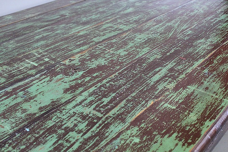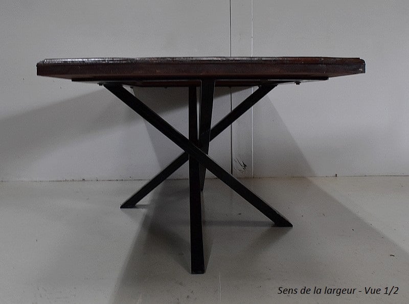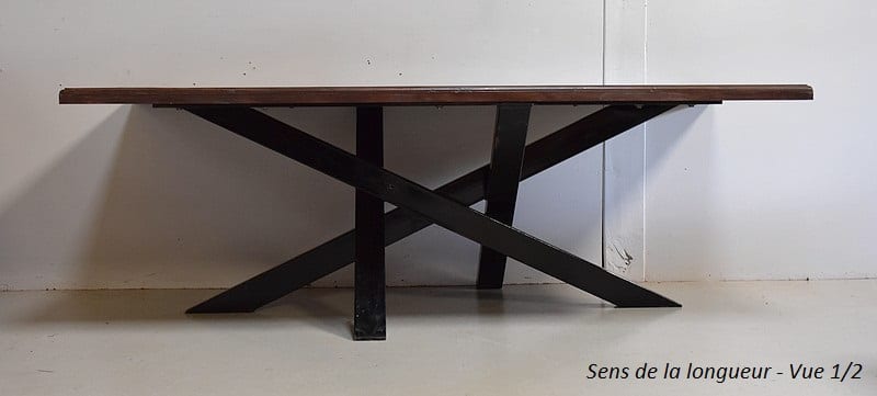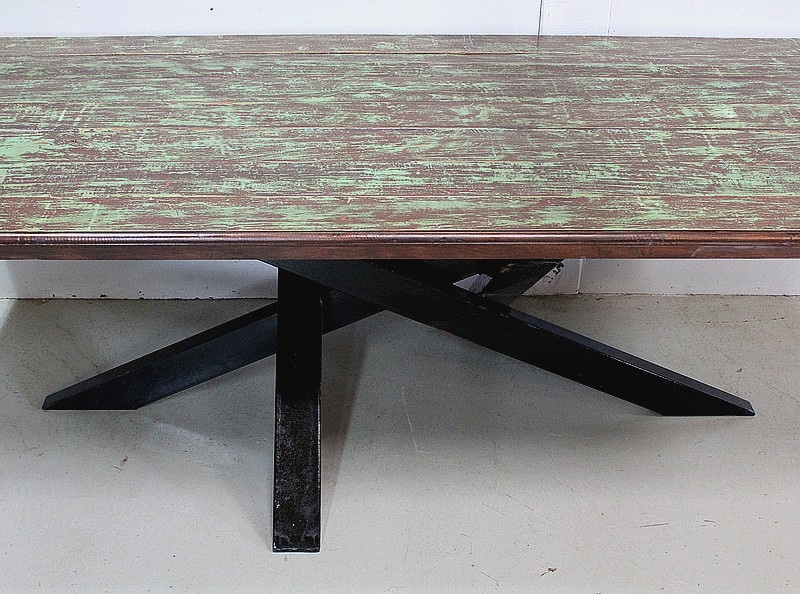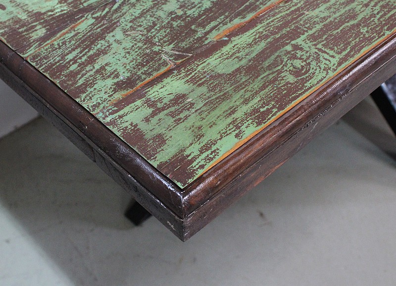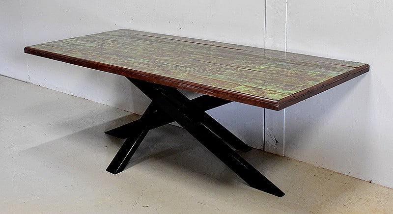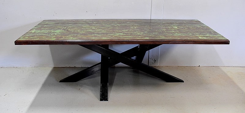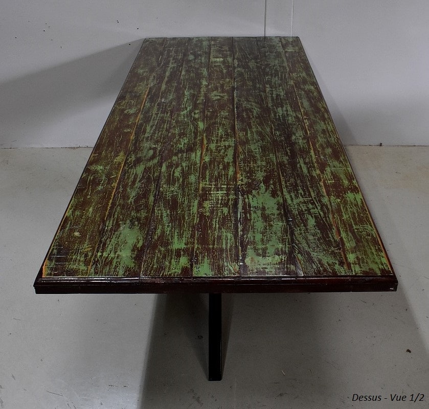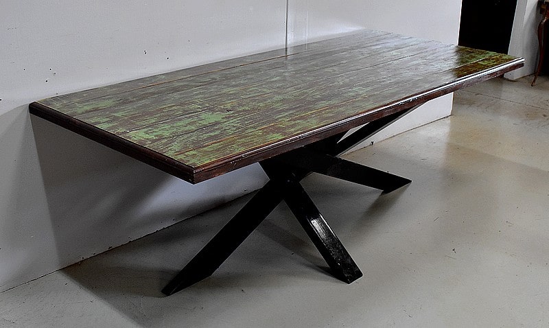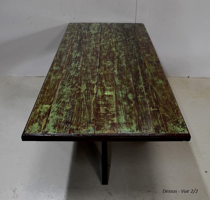 Table en Provenance d’Inde avec grand plateau de forme Rectangulaire, constitué d’anciennes planches de bois en Acajou, avec ses Patines Brunes et Vertes d’origines.