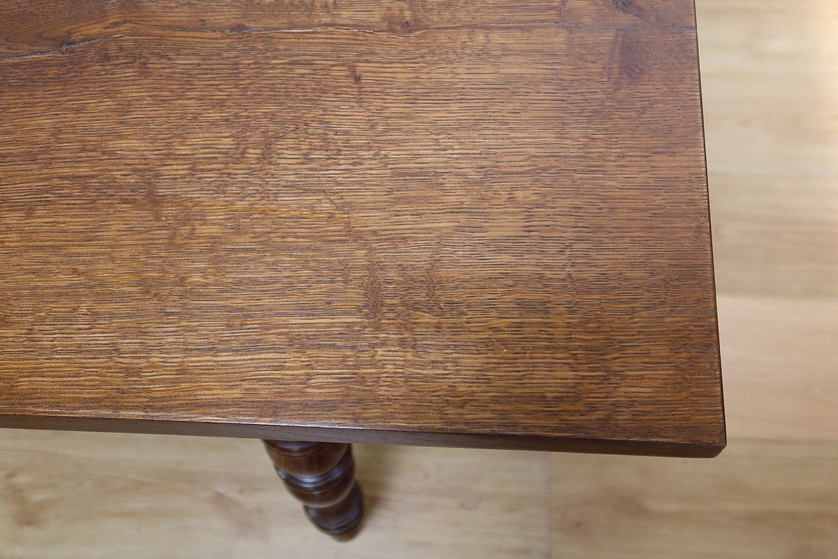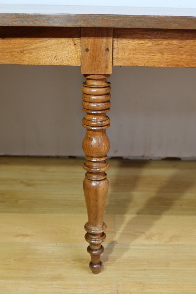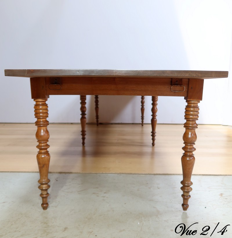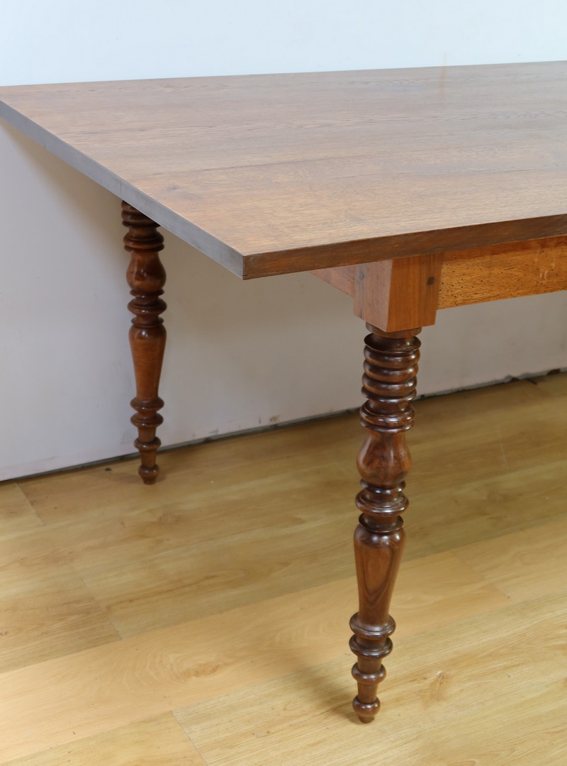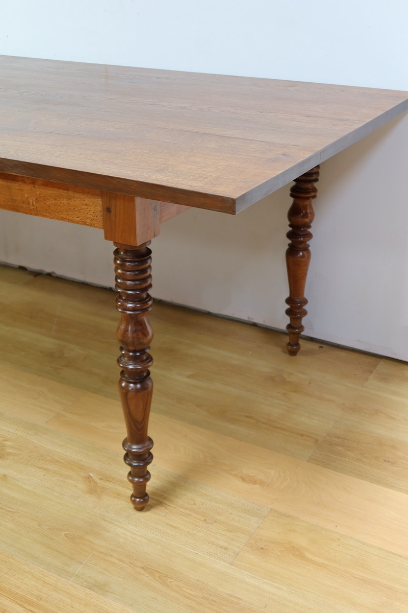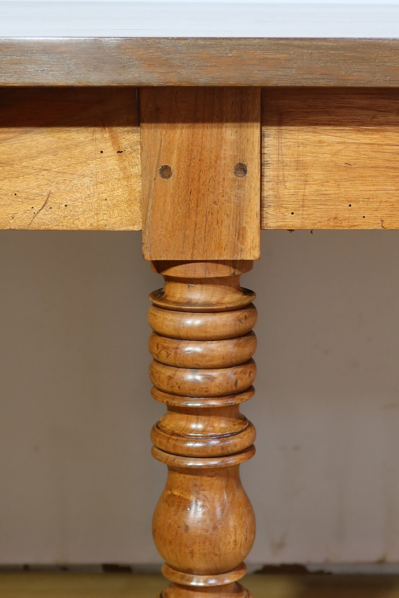 Celui-ci repose sur six pieds tournés, annelés et à balustre en noyer massif.