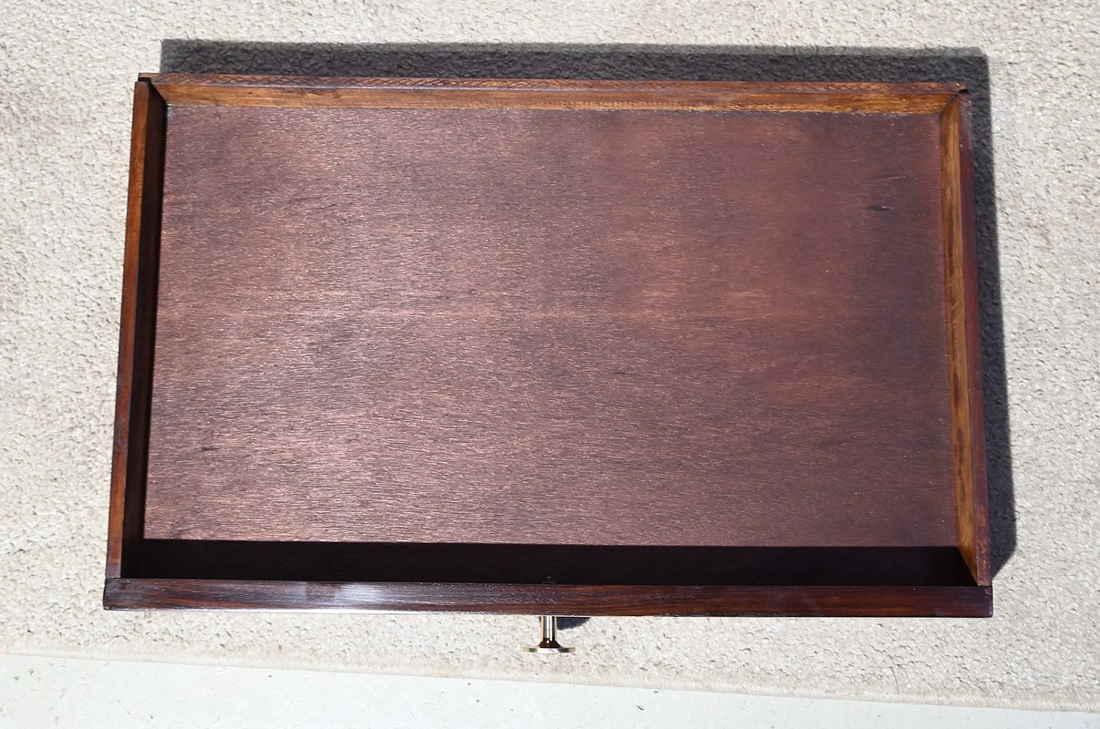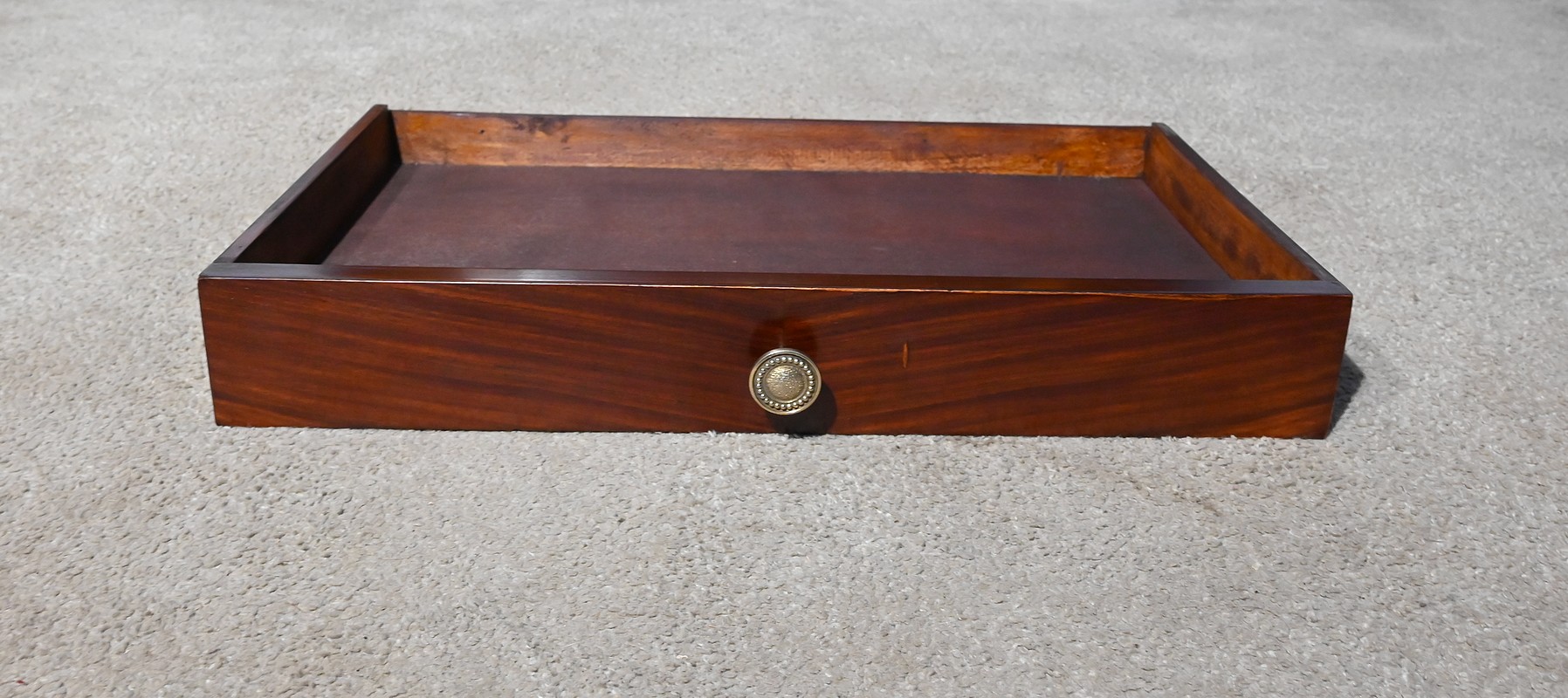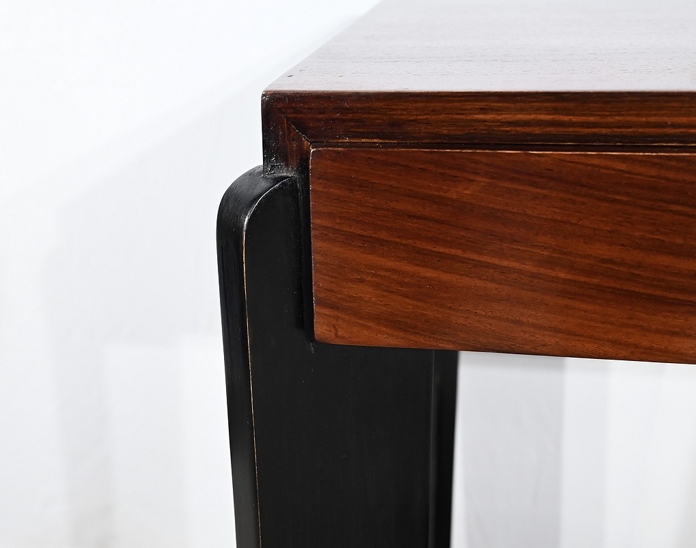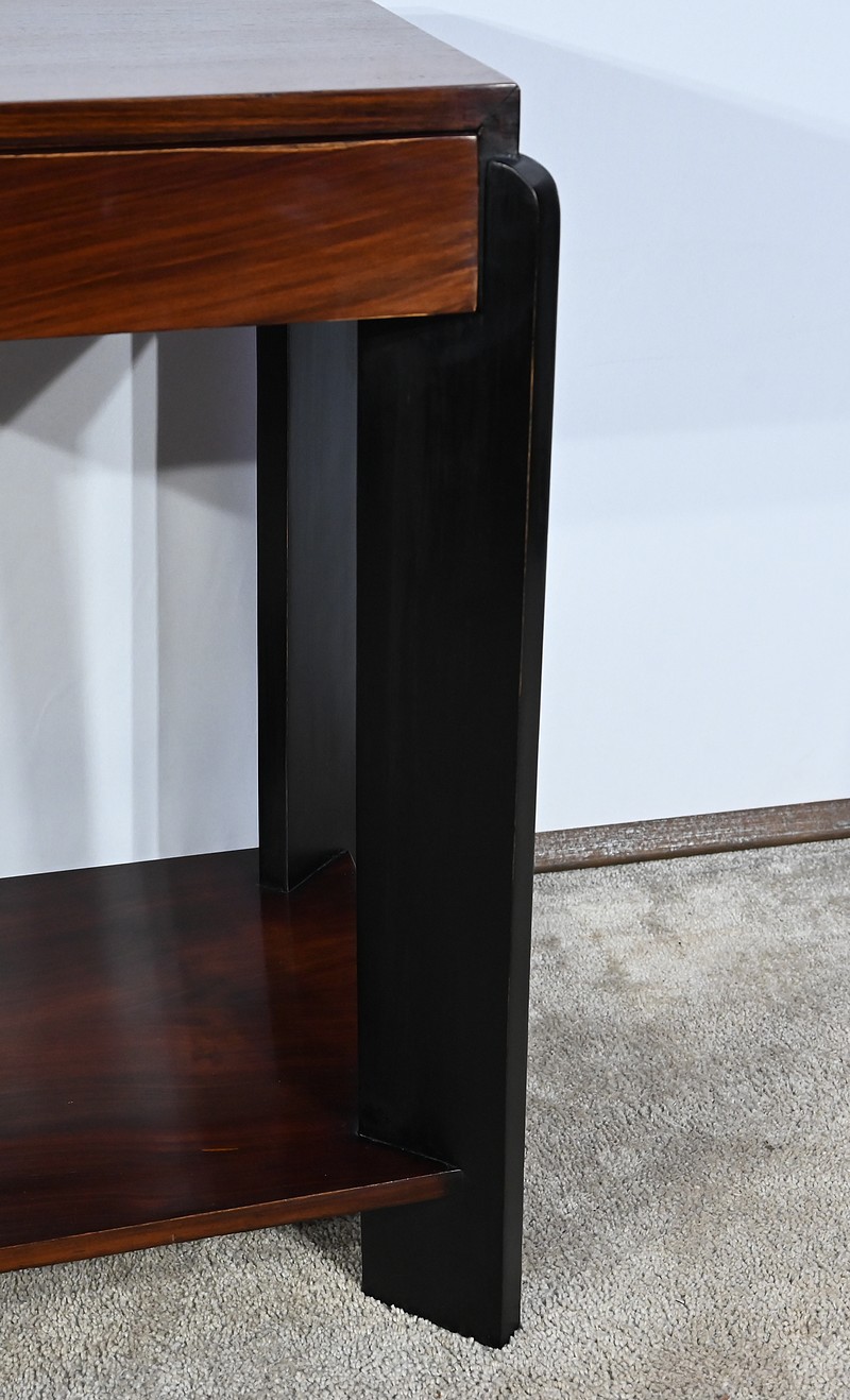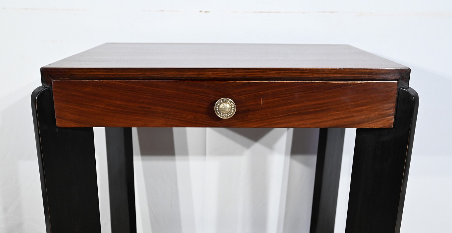 Cette table de milieu possède un dessus avec placage d’acajou développé. Cet acajou se caractérise par sa teinte lumineuse. Ce petit mobilier ouvre en façade par un large tiroir agrémenté d’un bouton laiton perlé et repose sur quatre pieds en bois noirci. Ces pieds à ressauts sont disposés en diagonale. En partie basse, une belle tablette est enchâssée dans ces pieds.