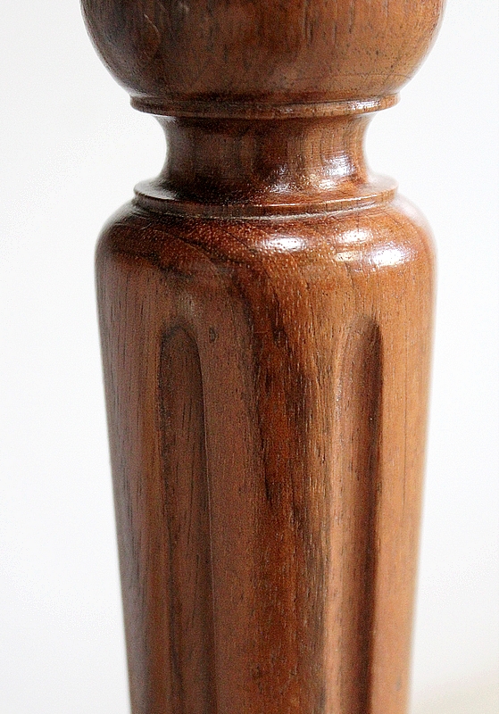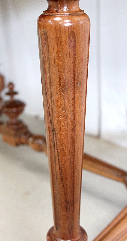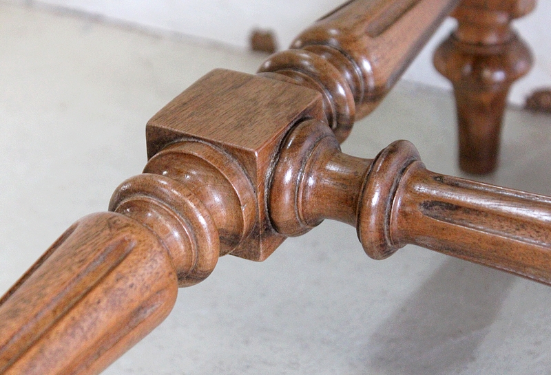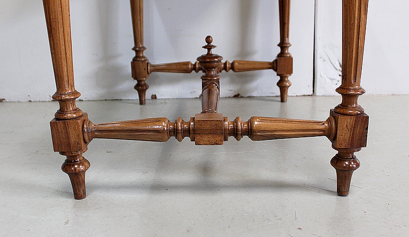 L’ensemble repose sur un piétement Élégamment Ouvragé, composé de quatre jambes embellies de Cannelures et Finement Tournées en Fuseau, dans le style Louis XVI. Ces dernières sont reliées à leurs bases par une Entretoise aux mêmes attributs, sommée, en son centre, d’un important Décor Sculpté. Chaque bas de pied se termine en forme Toupie.