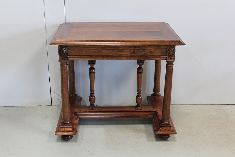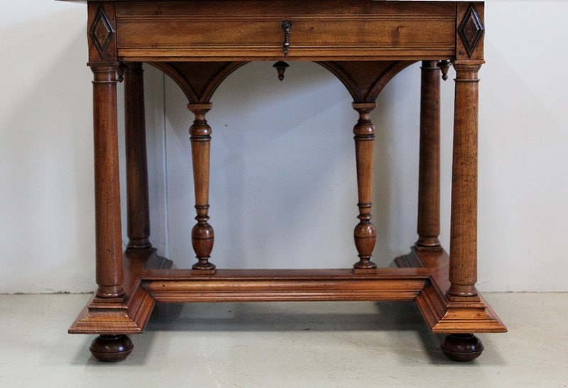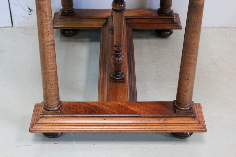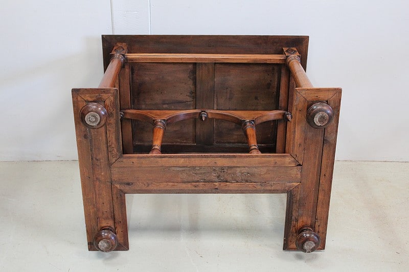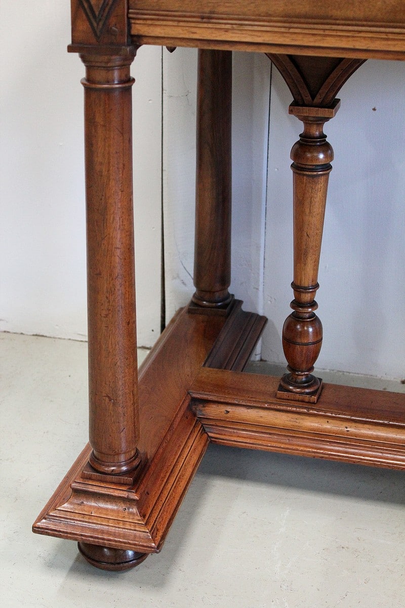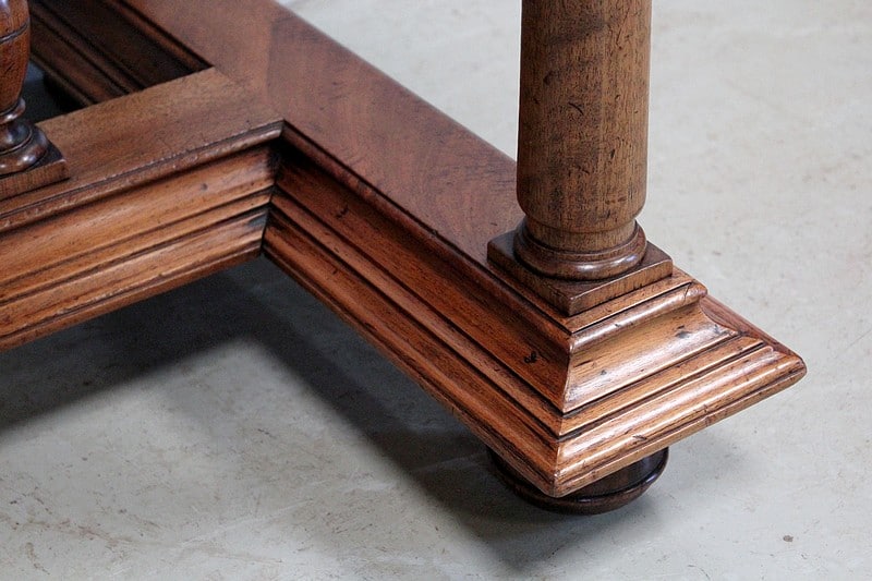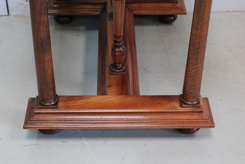 Elle repose sur 4 pieds en colonnes moulurées ainsi que sur 2 autres pieds centraux en balustres et sculptures en ogives, tous reposant sur une entretoise en H à multiple moulures, sur pieds boules aplaties.