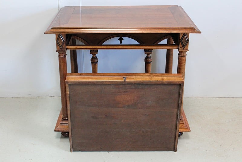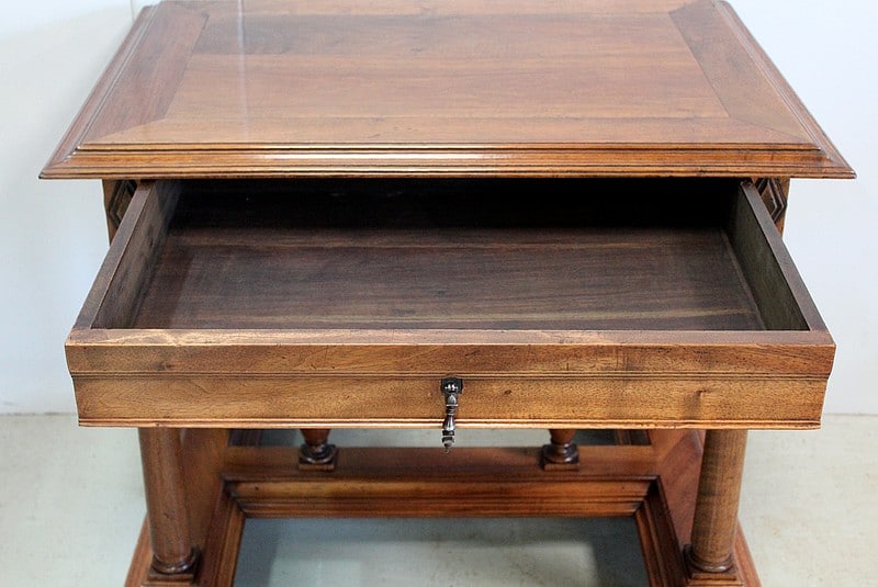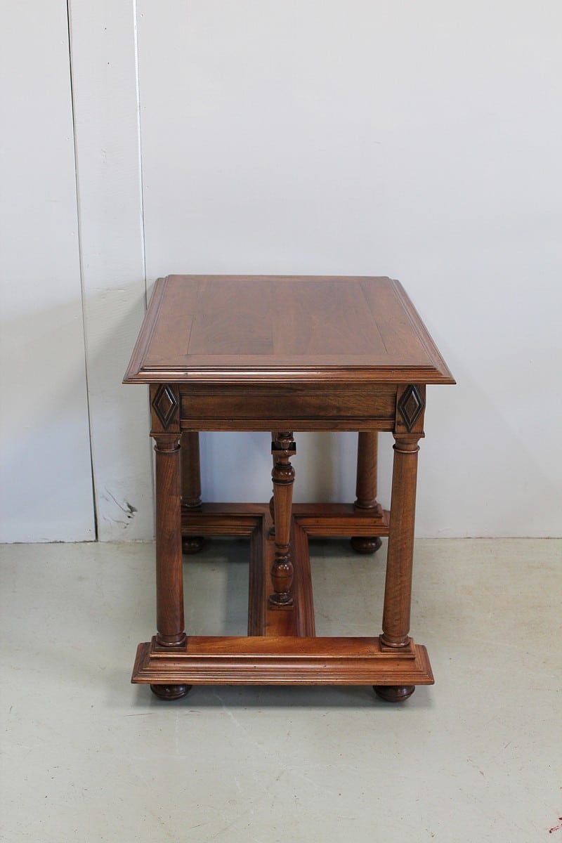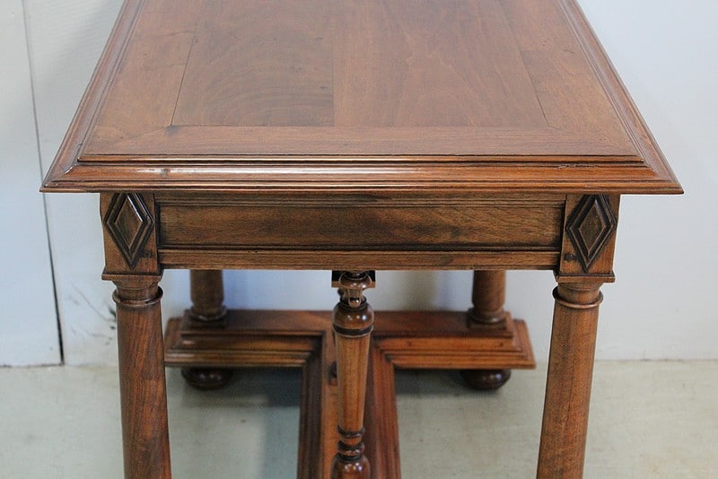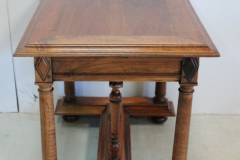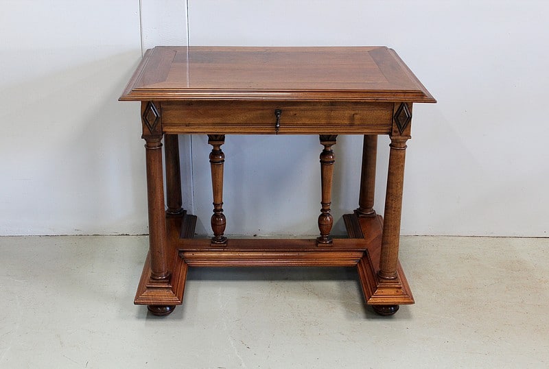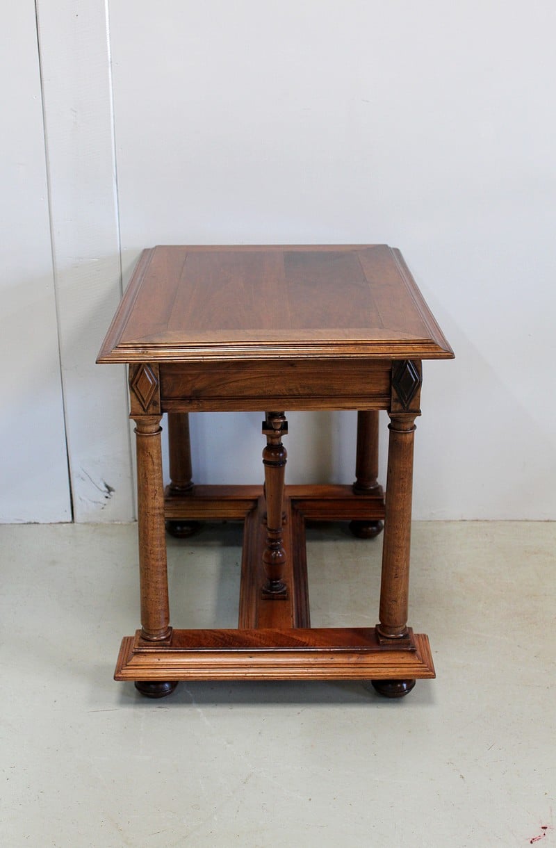 Elle repose sur 4 pieds en colonnes moulurées ainsi que sur 2 autres pieds centraux en balustres et sculptures en ogives, tous reposant sur une entretoise en H à multiple moulures, sur pieds boules aplaties.