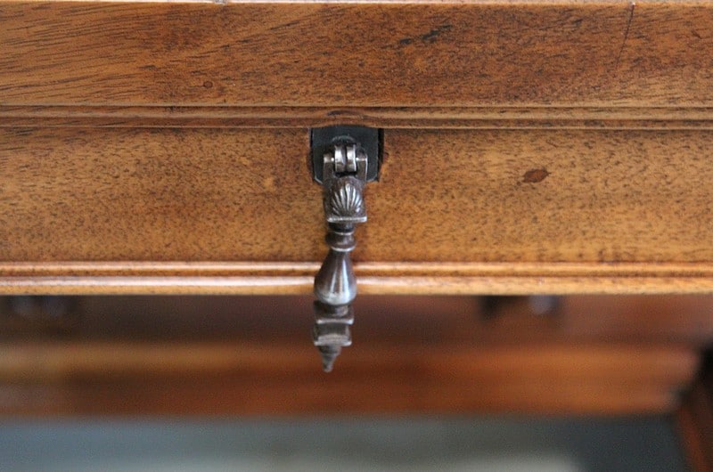 Elle ouvre par un large tiroir en ceinture doté d’une petite poignée en fer.
