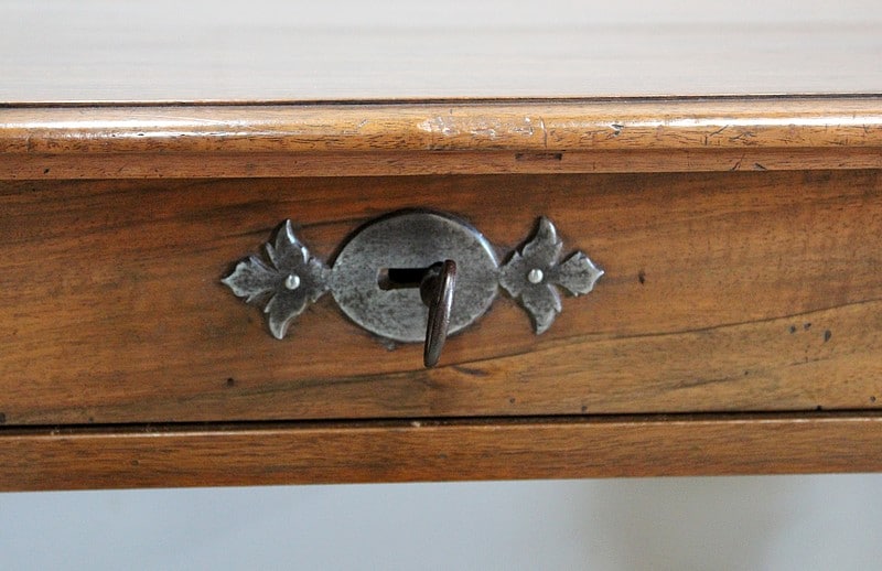 Elle ouvre en ceinture par un tiroir avec serrure et clef d’origine en fer.