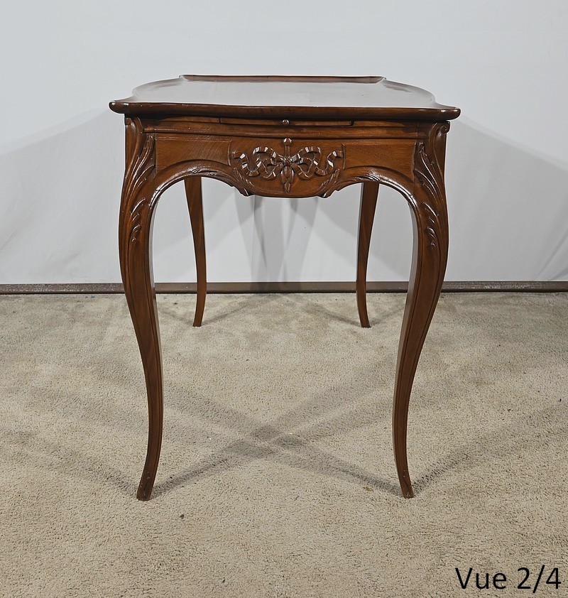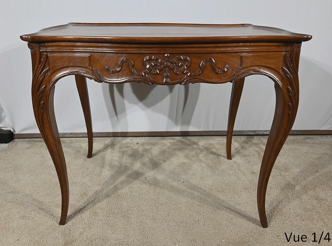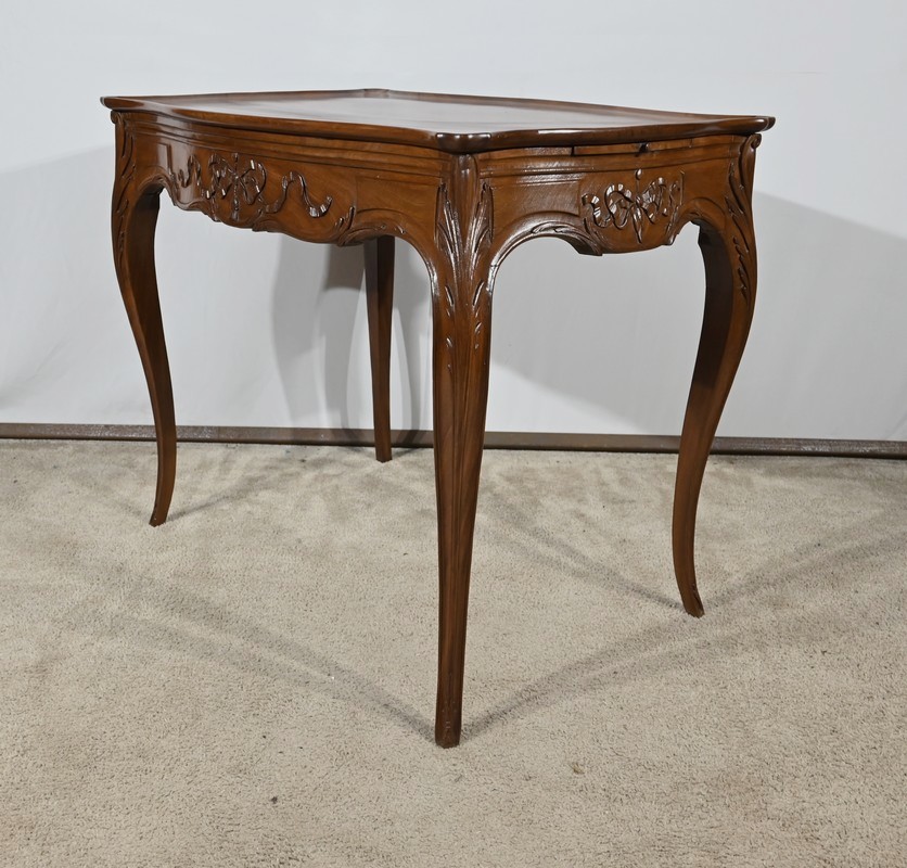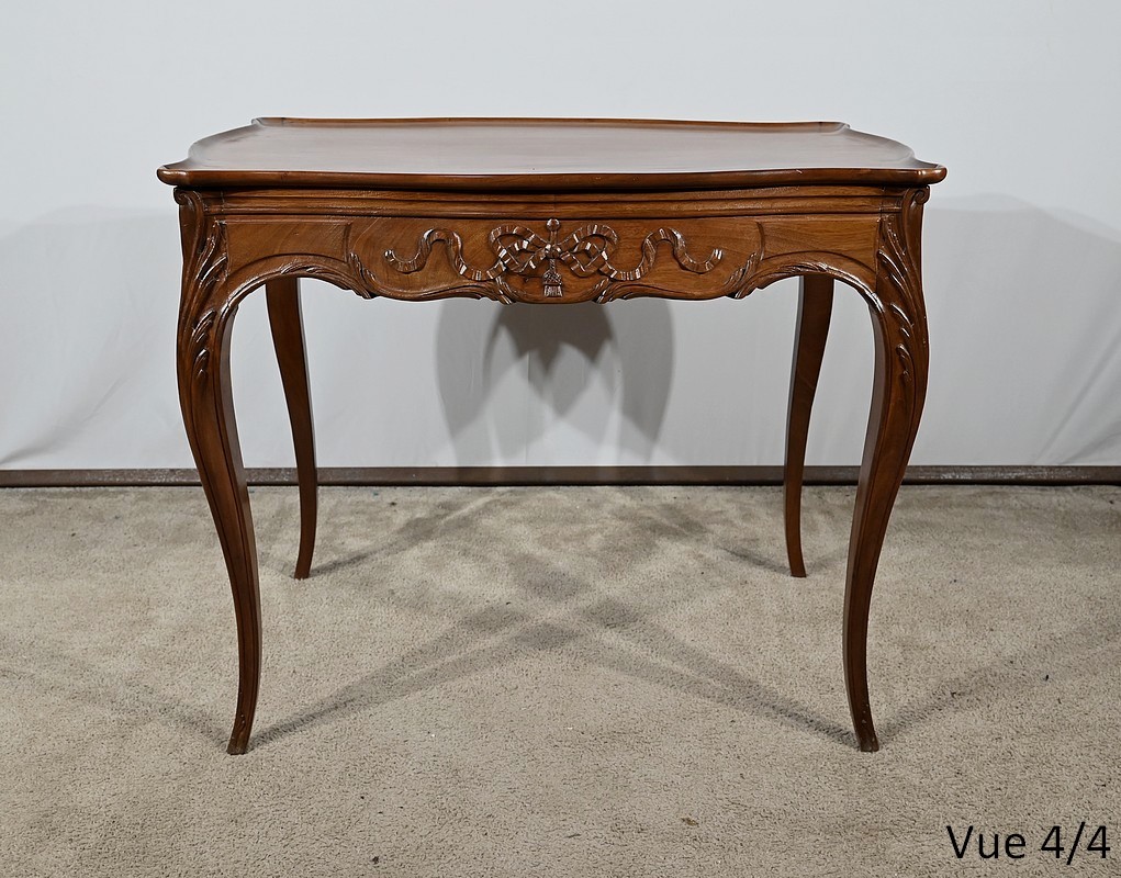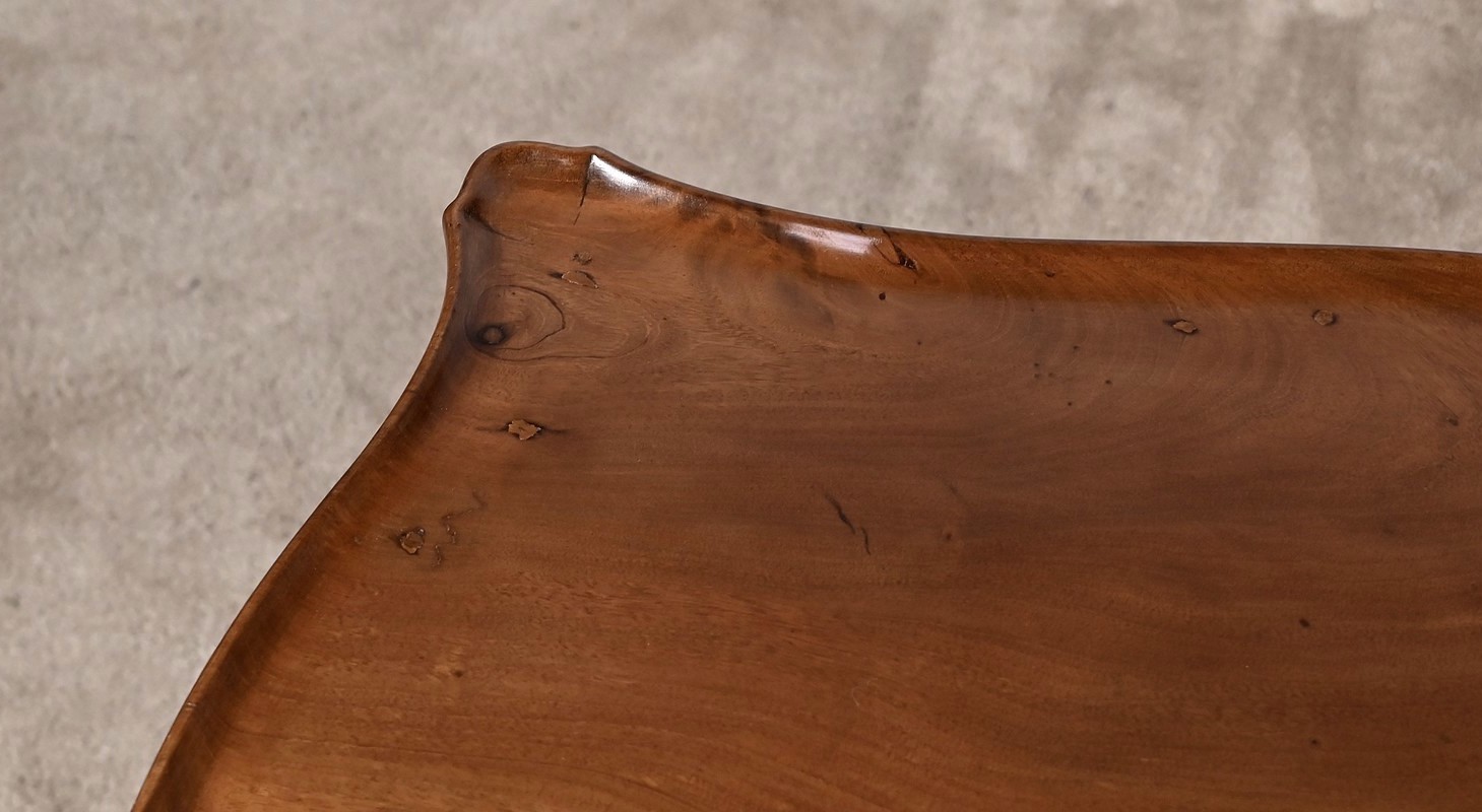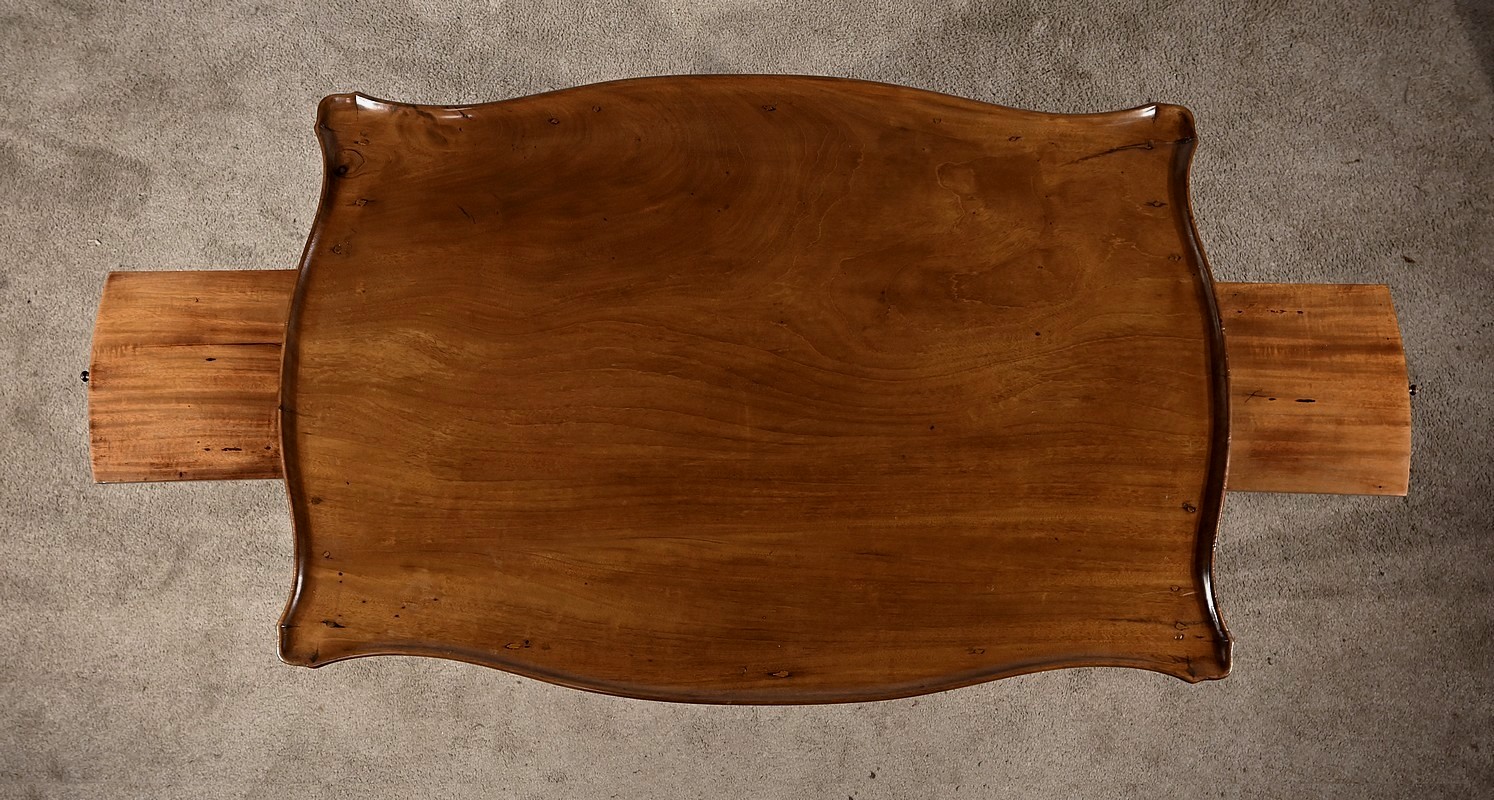 Table Cabaret en acajou massif munie d’un plateau cuvette de forme mouvementée et d’une ceinture à découpe par le dessous, sculptée de frises, de rubans et de pompons sur ses quatre faces. De chaque côté, nous retrouvons deux tablettes coulissantes avec butée et bouton bois.