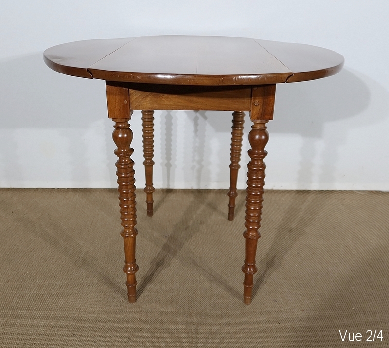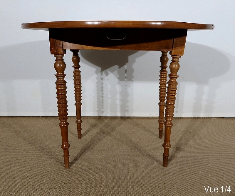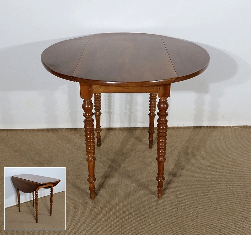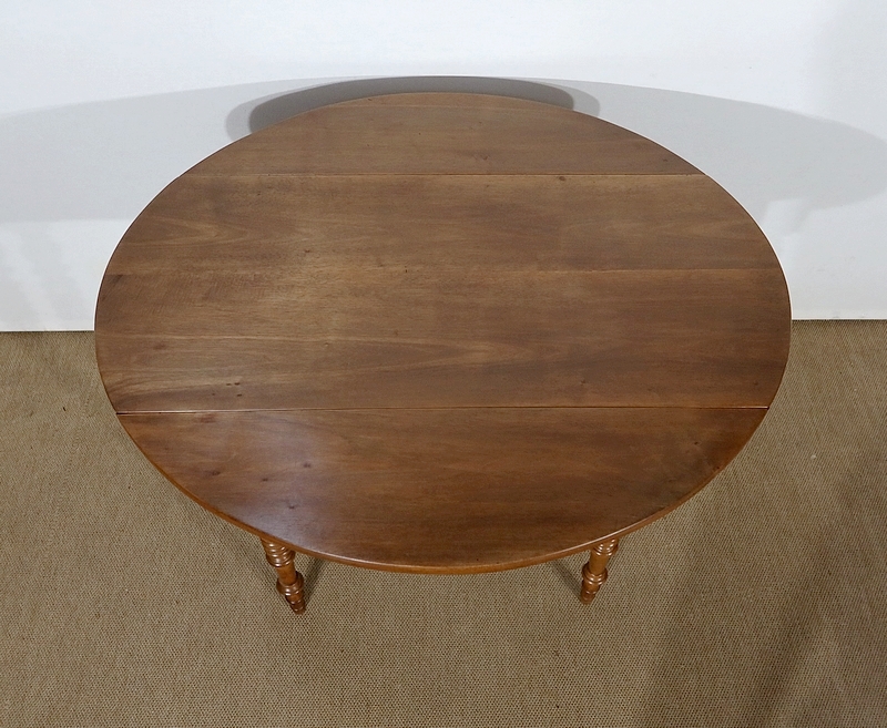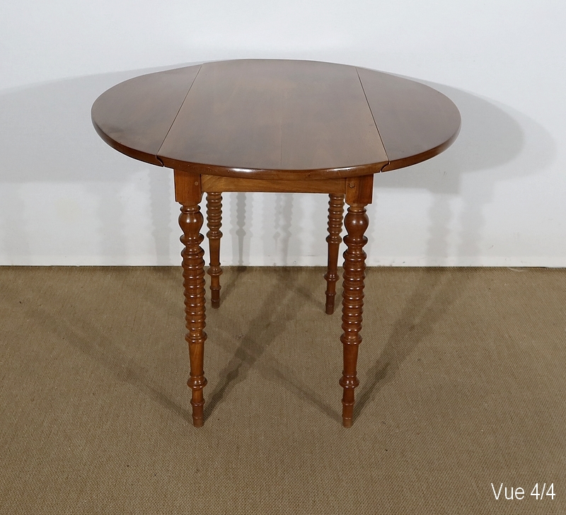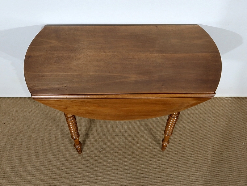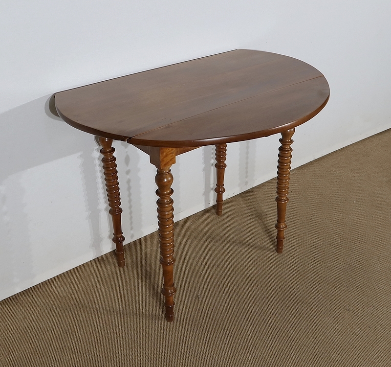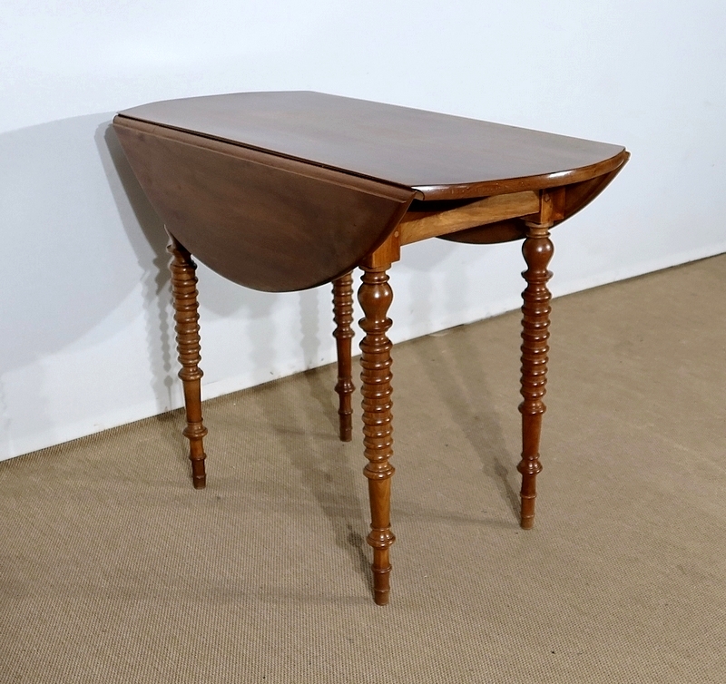 Table ovalisée en noyer massif bénéficiant de deux abattants permettant trois versions de celle-ci. Ouverte, elle permet d’accueillir quatre personnes.