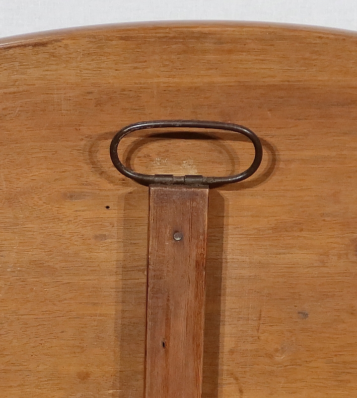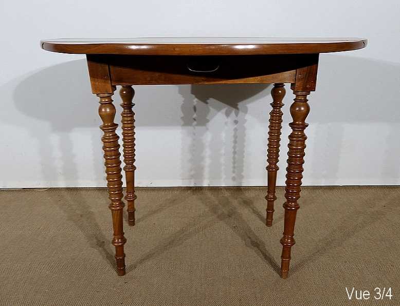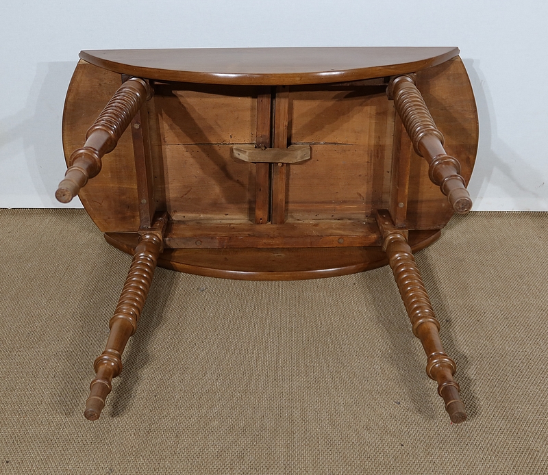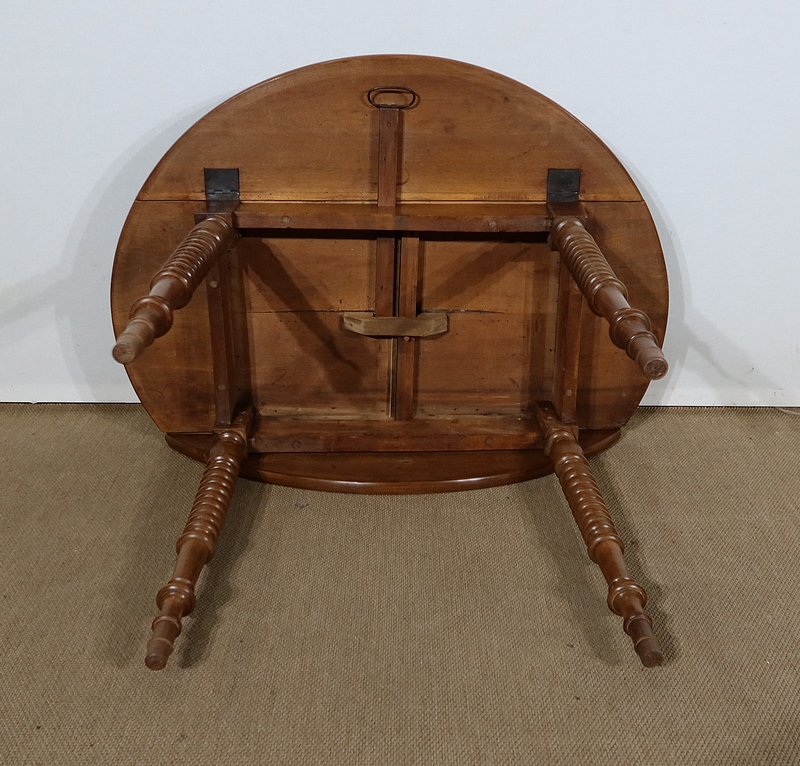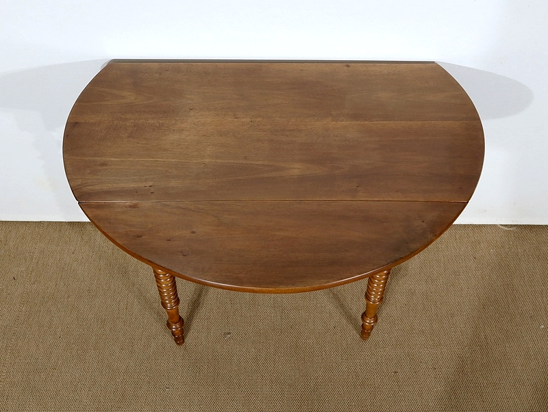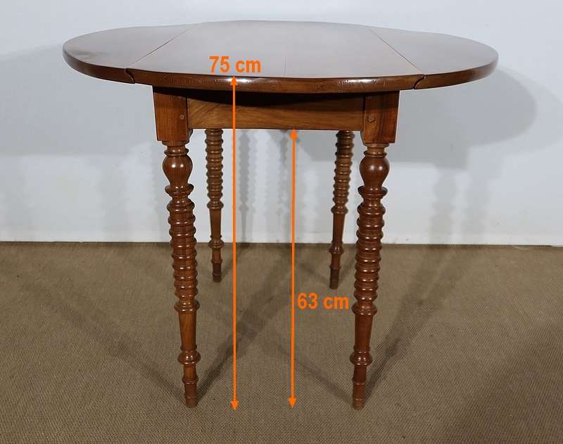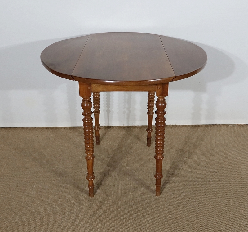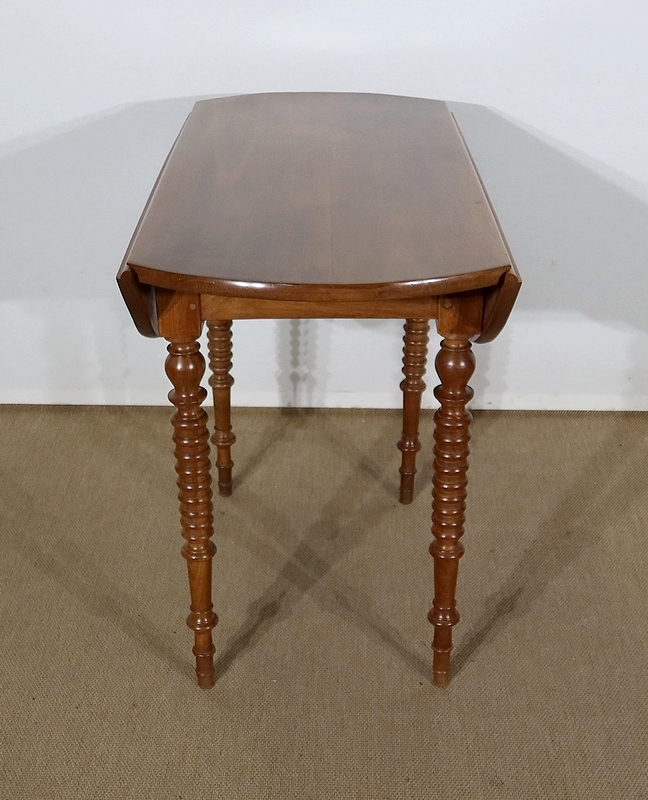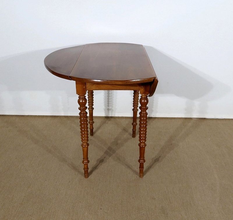 Table ovalisée en noyer massif bénéficiant de deux abattants permettant trois versions de celle-ci. Ouverte, elle permet d’accueillir quatre personnes.