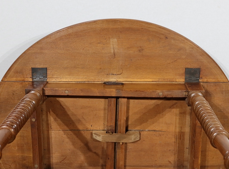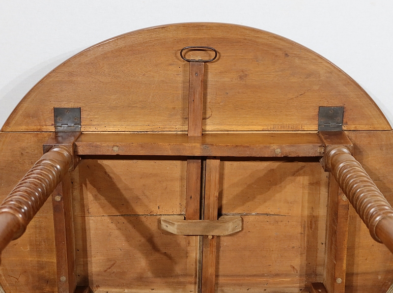 Les abattants sont soutenus en position dépliée par des tirants placés de part et d’autre. L’ensemble repose sur quatre pieds tournés à couronne dans la partie centrale.