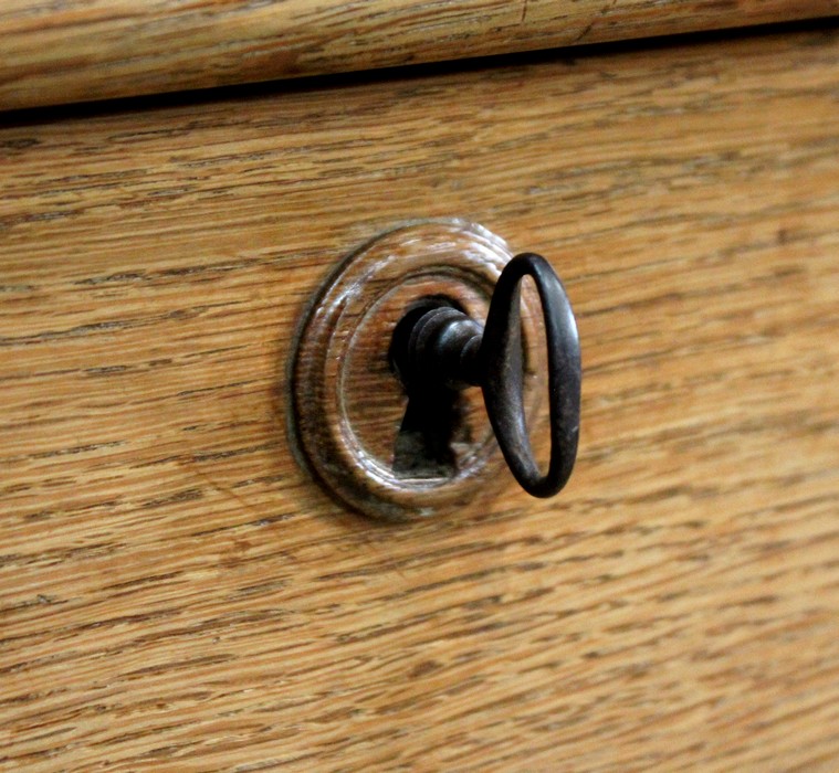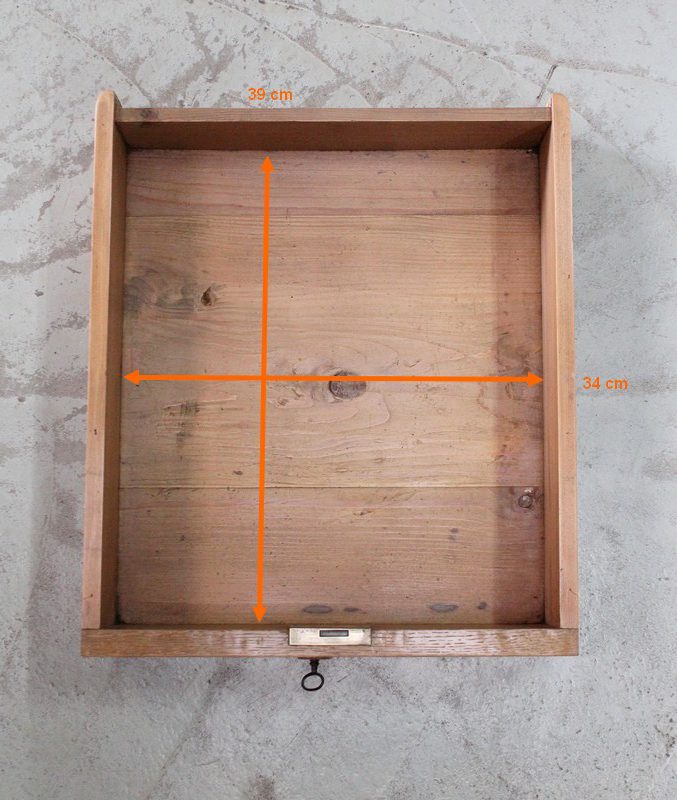 Cette table ouvre en ceinture par un tiroir muni d’une entrée ronde en bois, et pouvant se verrouiller grâce à sa serrure en état de fonctionnement accompagnée de sa clé d’origine.