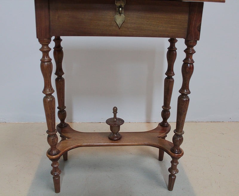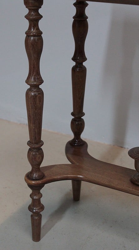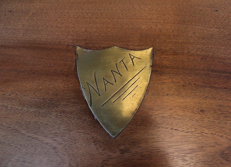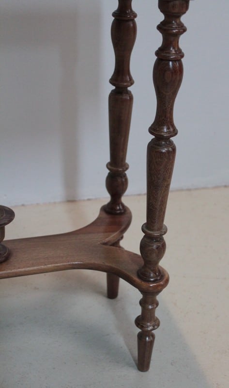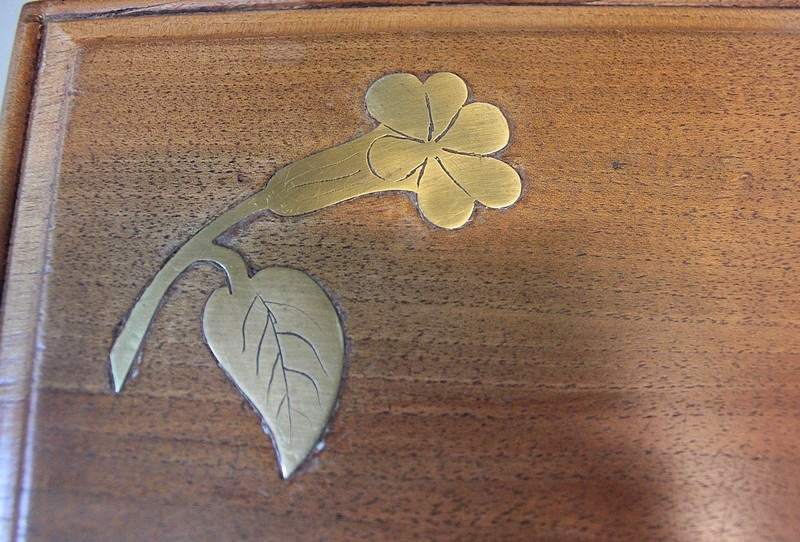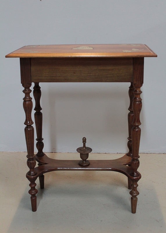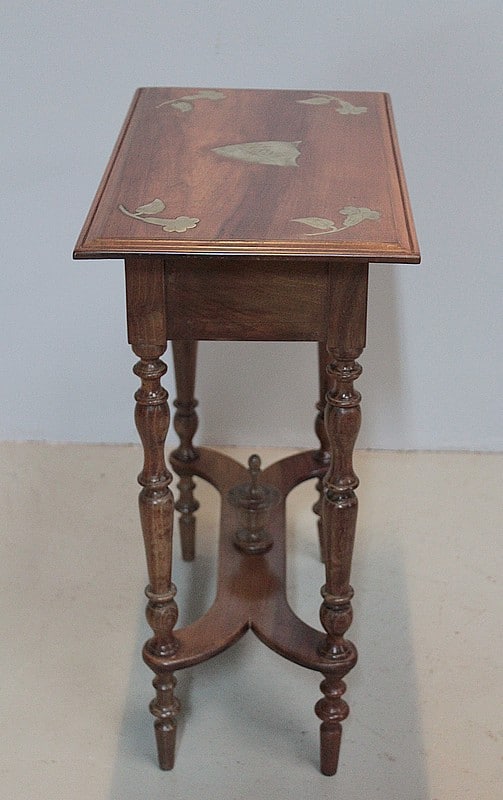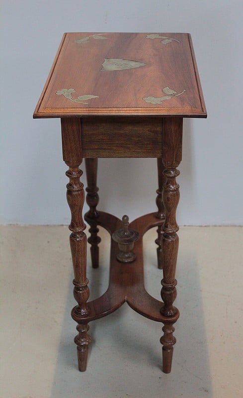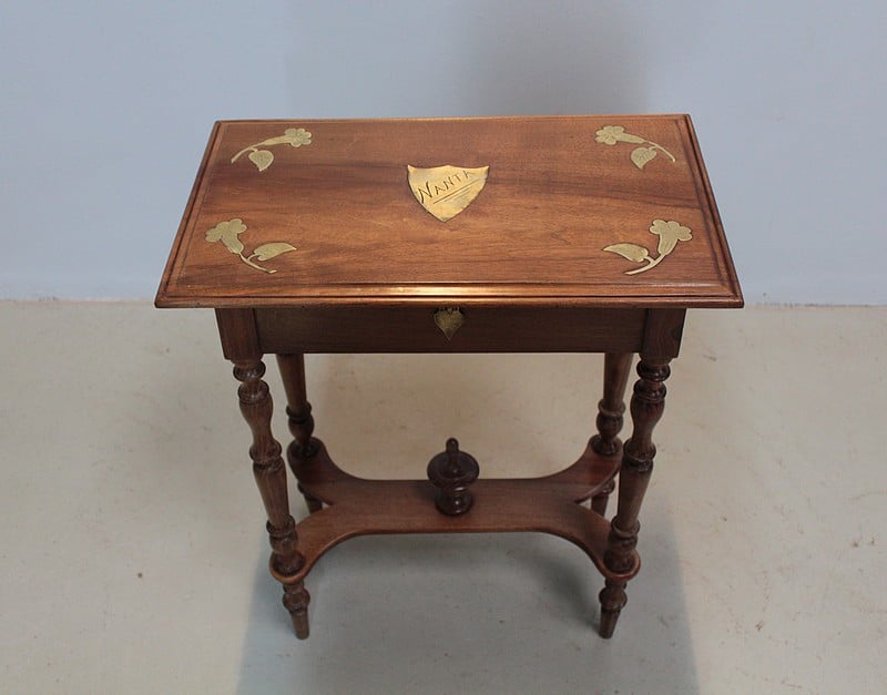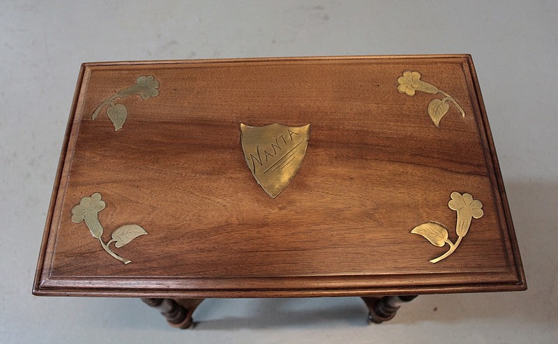 Petite table vide-poche en noyer pour l’entretoise, la ceinture et le plateau qui est décoré par des incrustations de laiton à motifs de fleurs aux angles et d’écusson au milieu sur lequel on lit l’inscription ‘Nanta’.