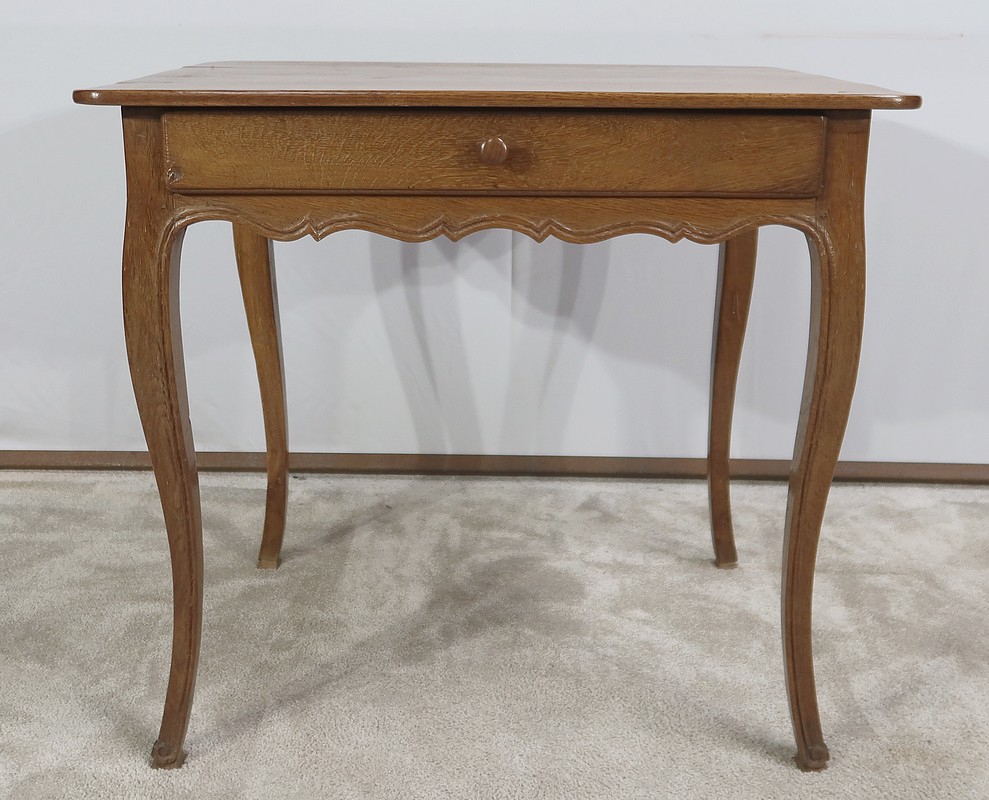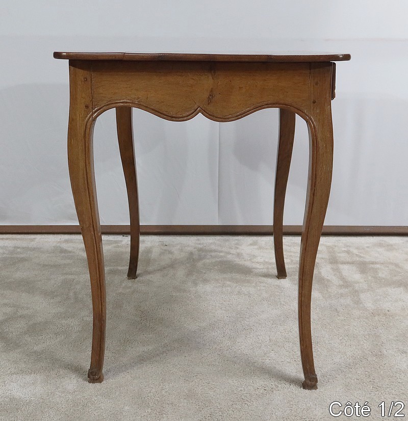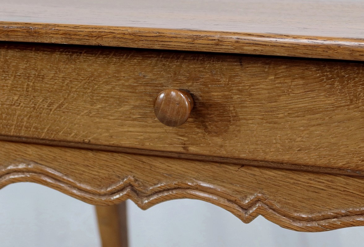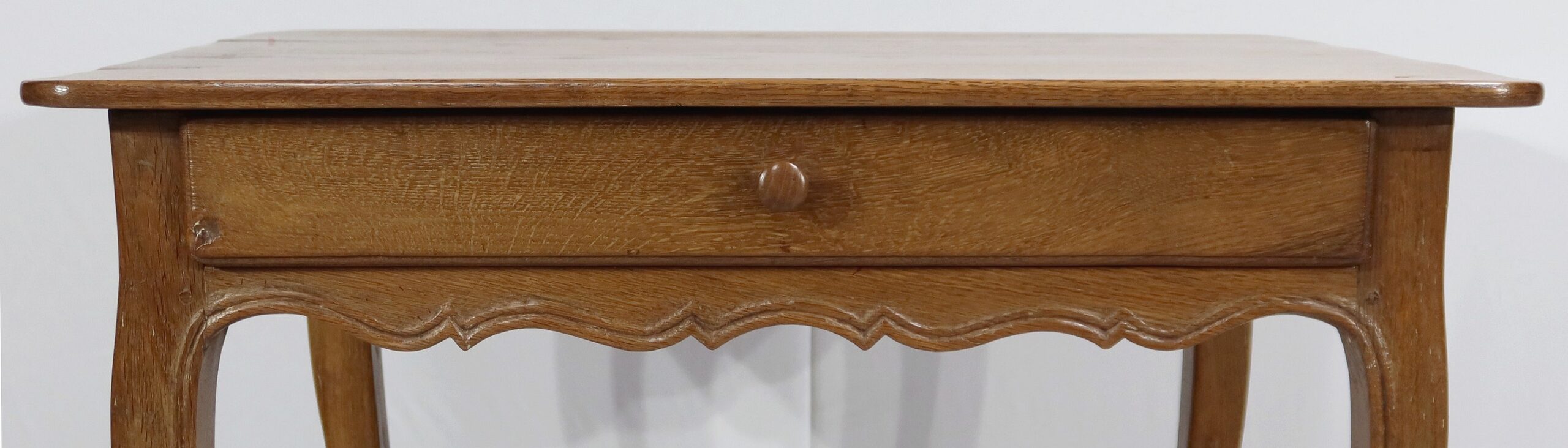 Charmante petite table mouvementée en chêne blond présentant en ceinture un long tiroir. Celui-ci est pourvu d’une façade au pourtour légèrement mouluré, en saillie de la ceinture. Il est également agrémenté d’un bouton de tirage adoucit, de forme lentille.