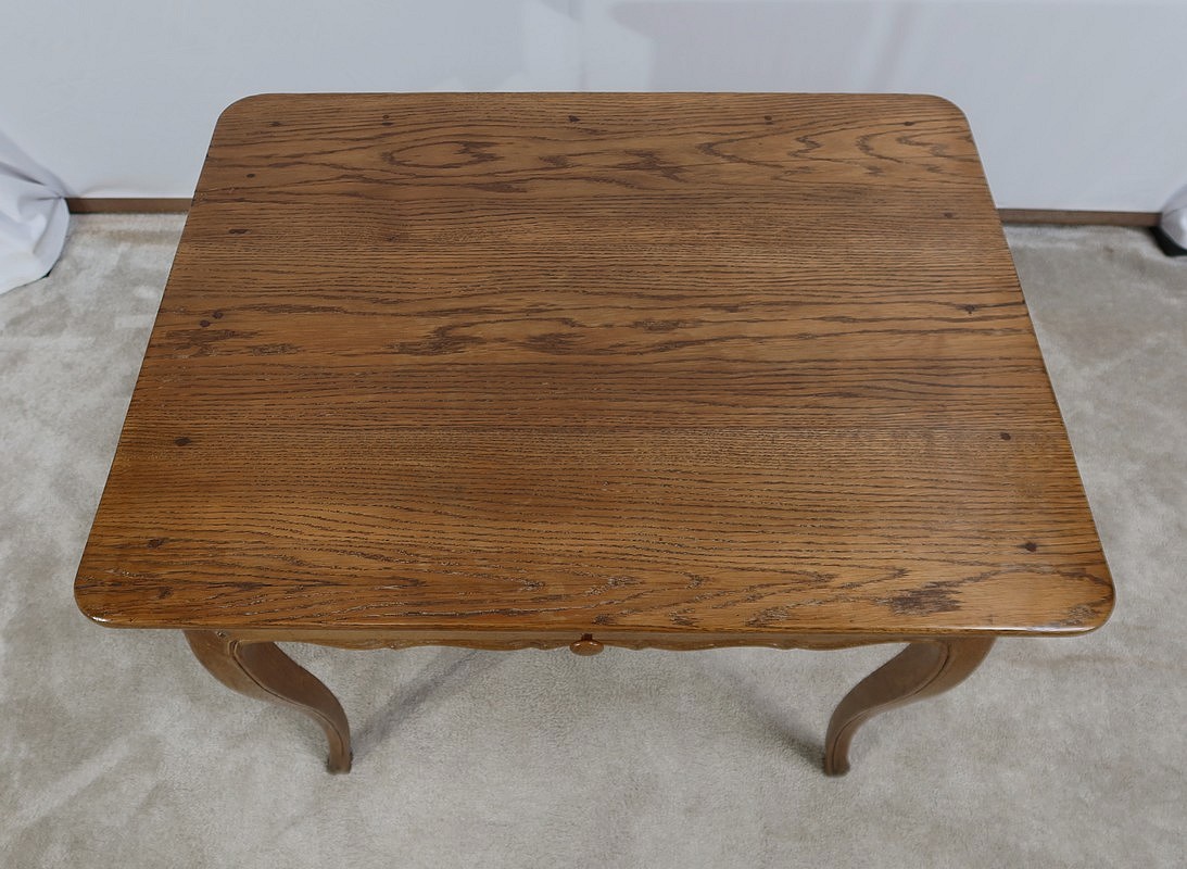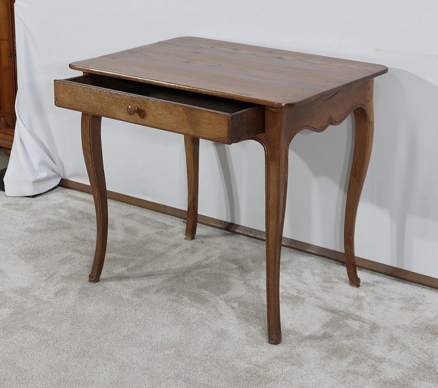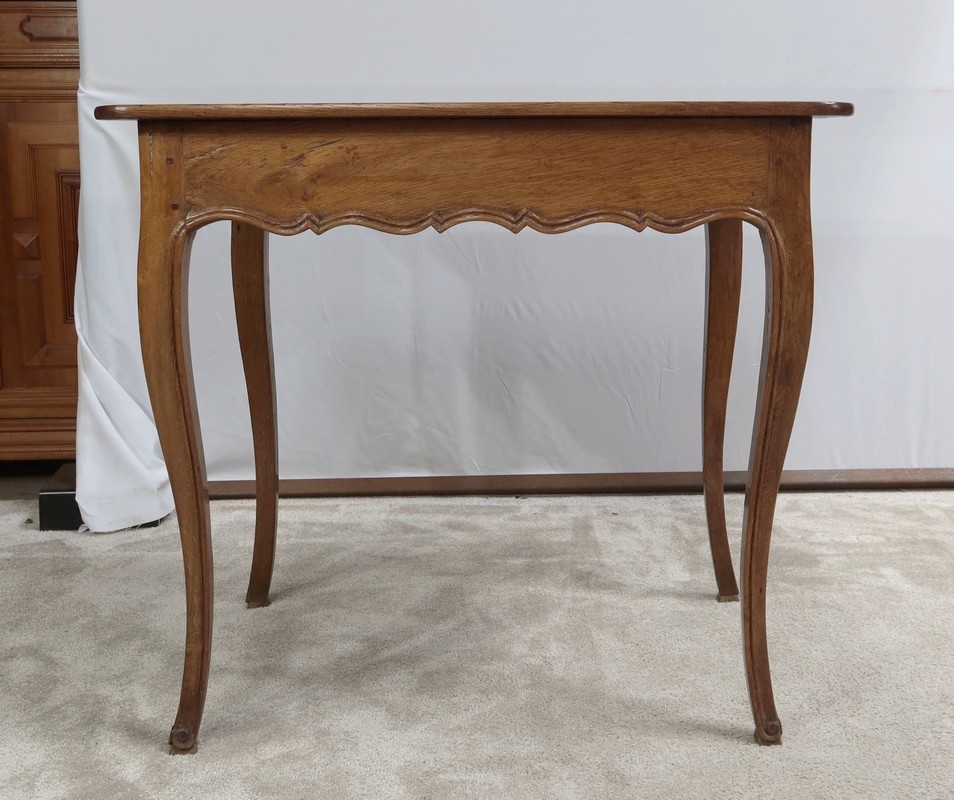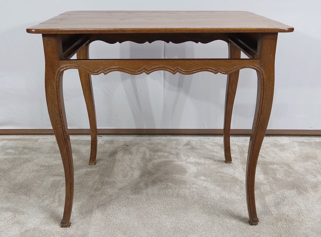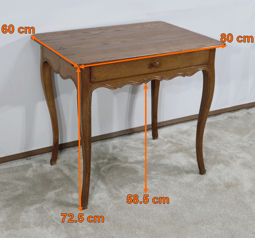 Charmante petite table mouvementée en chêne blond présentant en ceinture un long tiroir. Celui-ci est pourvu d’une façade au pourtour légèrement mouluré, en saillie de la ceinture. Il est également agrémenté d’un bouton de tirage adoucit, de forme lentille.