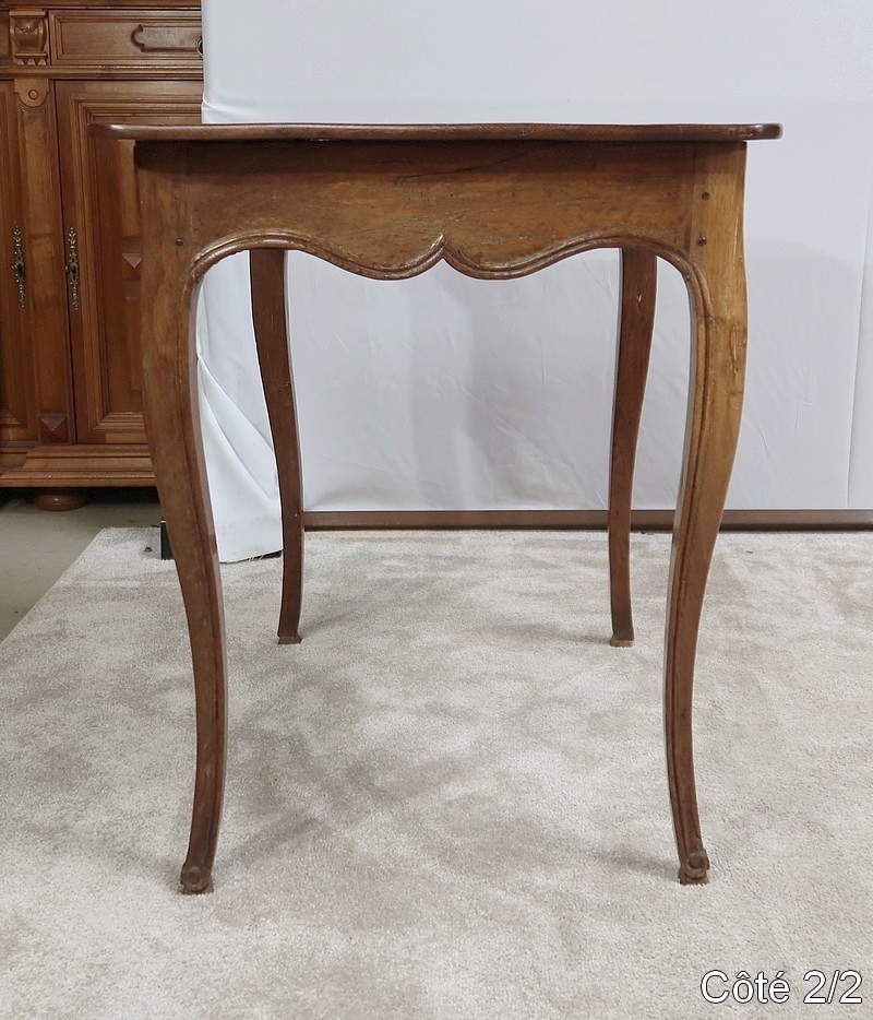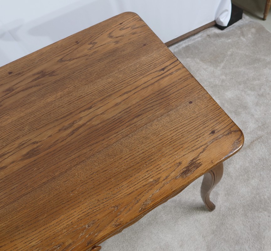 Cette table se caractérise par sa ceinture mouvementée. Cette traverse (façade, côtés et arrière) est découpée en partie basse et la moulure du bas ressort subtilement par défoncement de celle-ci.