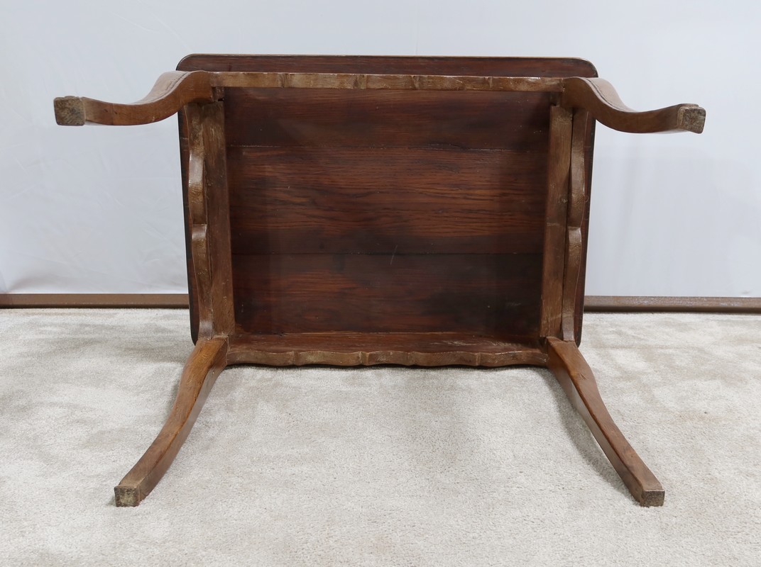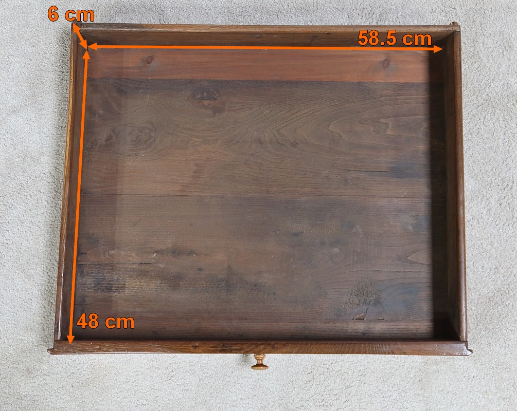 Ce petit meuble repose sur 4 pieds cambrés avec moulurations extérieures. Ils se terminent par des volutes et des pieds sabots. De plus, l’arête des pieds est légèrement arrondie avec un défoncement de bois vers la moulure.