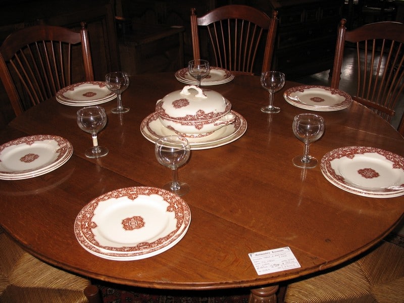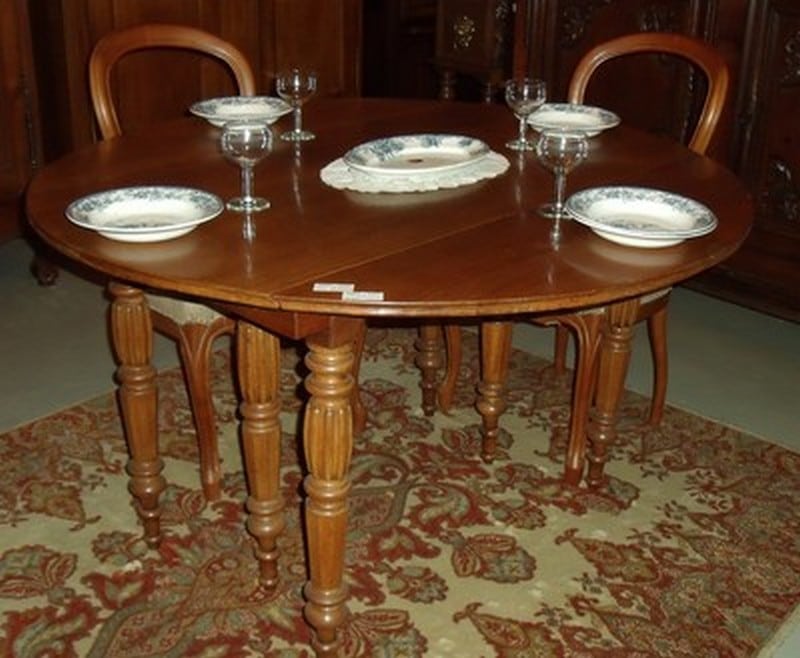 Table ronde à abattants en chêne, reposant sur 6 pieds tournés. Elle ouvre par des coulisses d’origine pouvant supporter 5 allonges lui permettant d’atteindre une longueur totale de 339cm.
