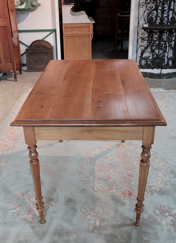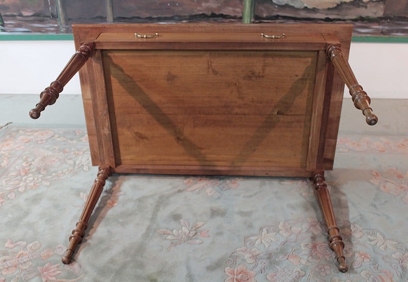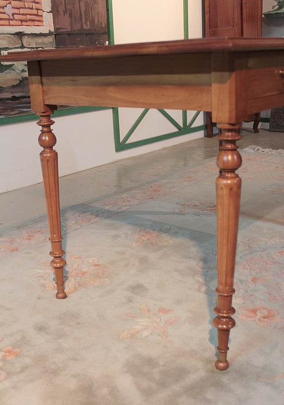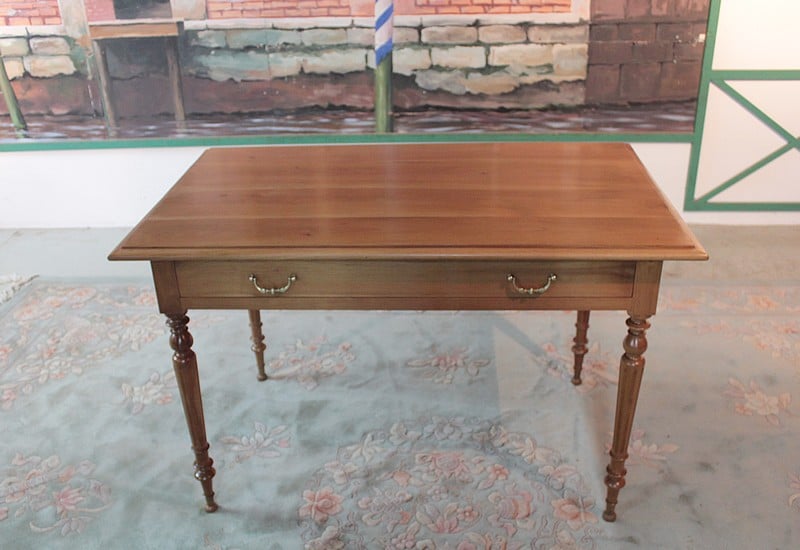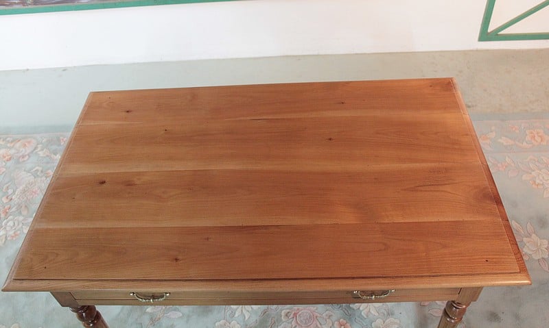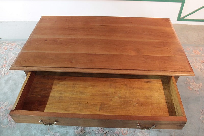 Table à écrire en merisier reposant sur 4 pieds tournés à cannelures dans le goût Louis XVI. Elle ouvre par un grand tiroir dans la ceinture. Époque 1920.
