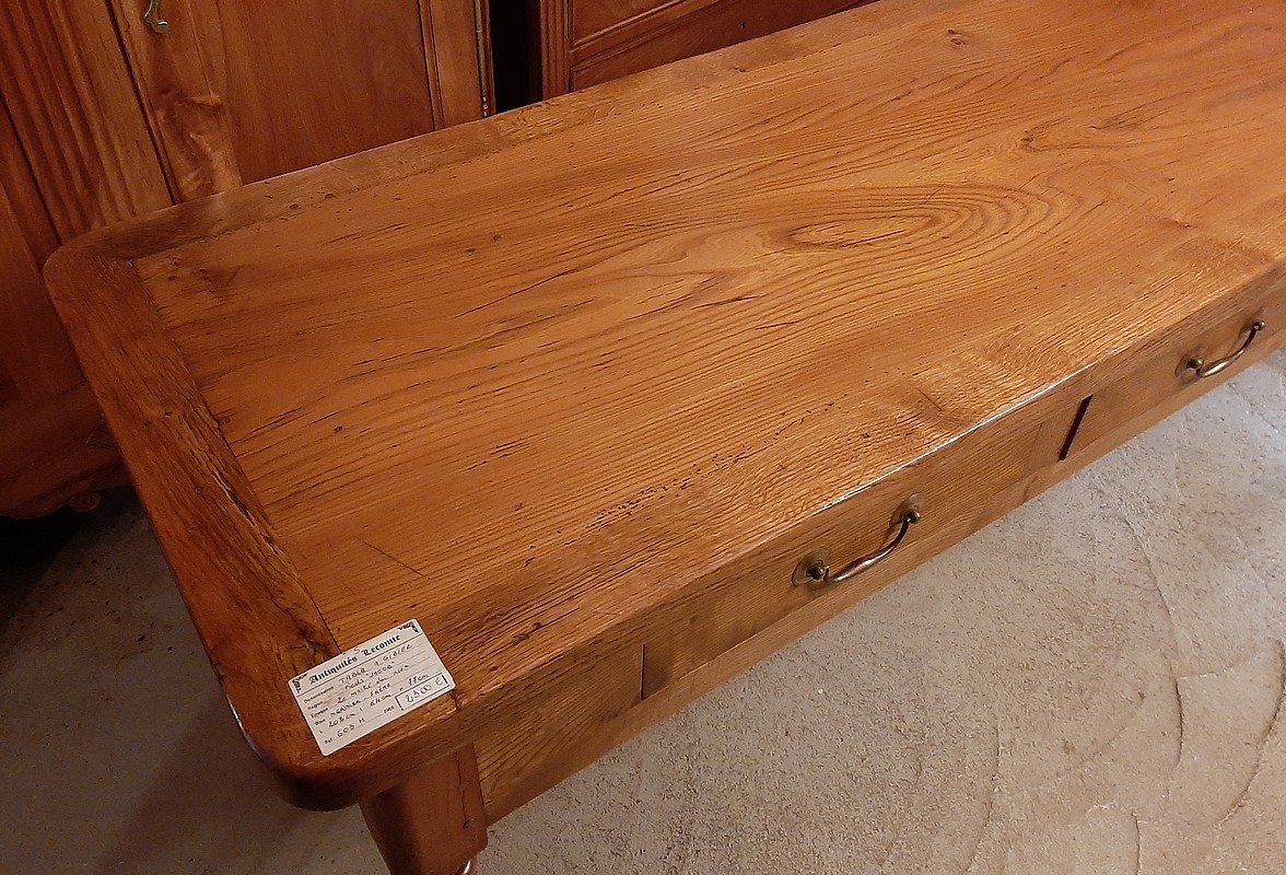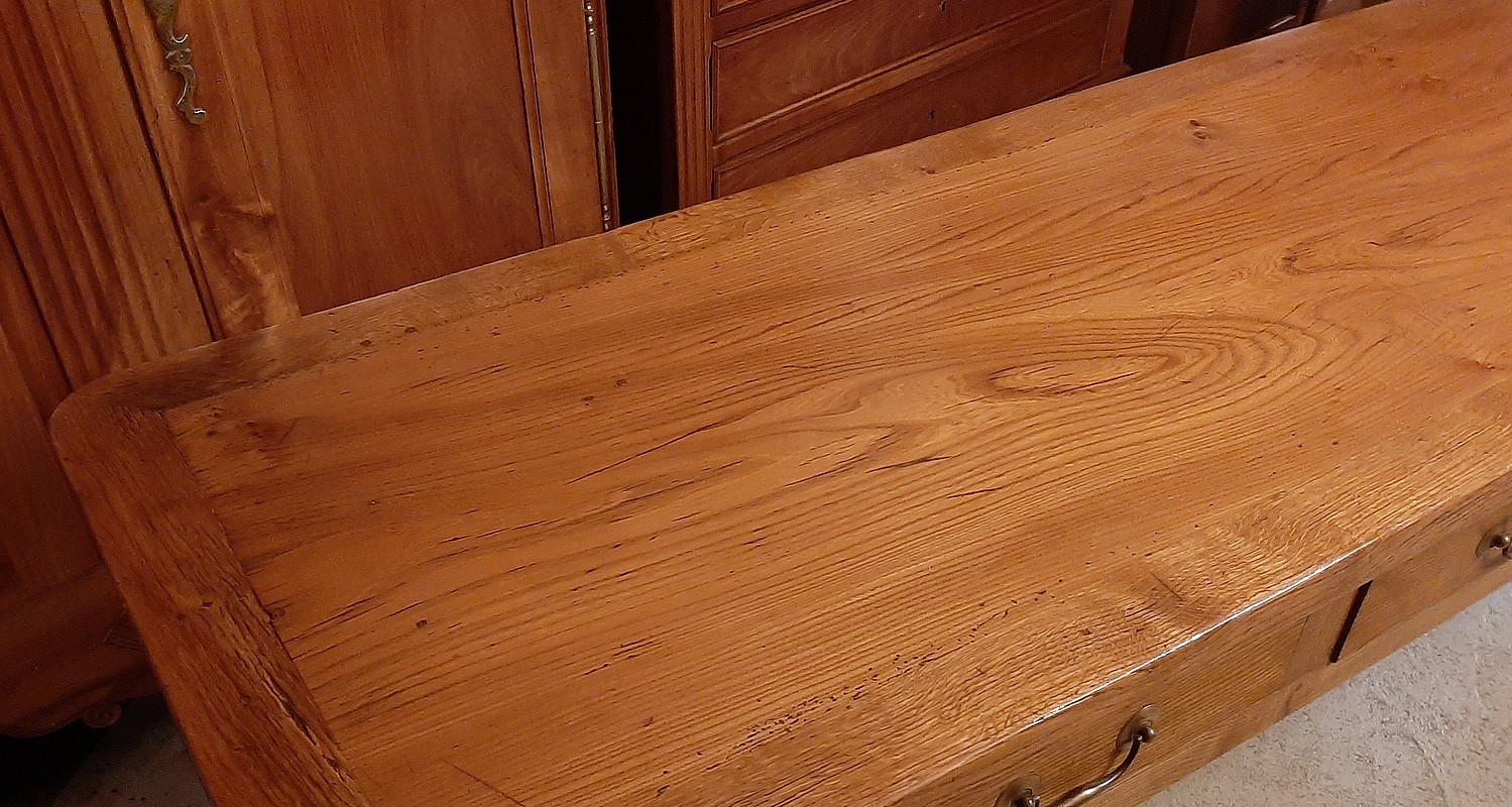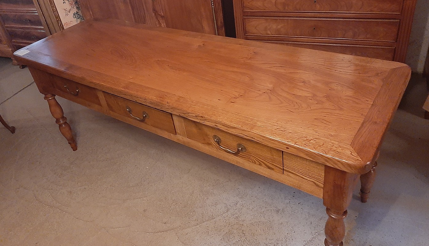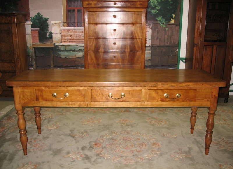 Table à Gibier ouvrant par 3 tiroirs en façade. Pieds ‘Jacob’. Plateau et ceinture en frêne avec entourage en chêne et pieds en merisier.