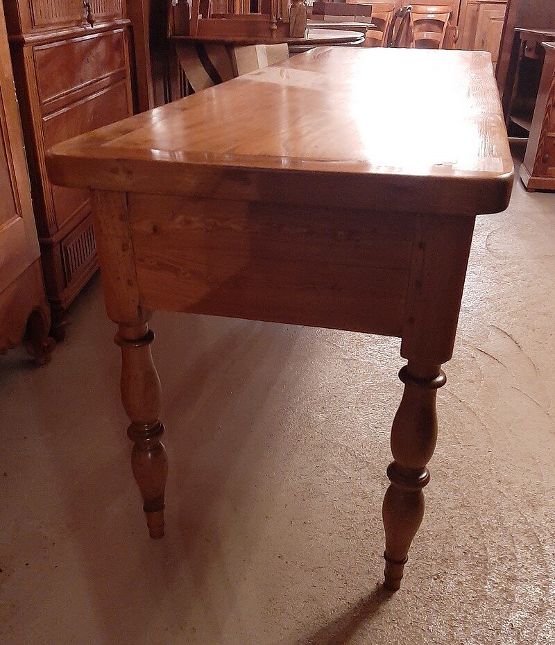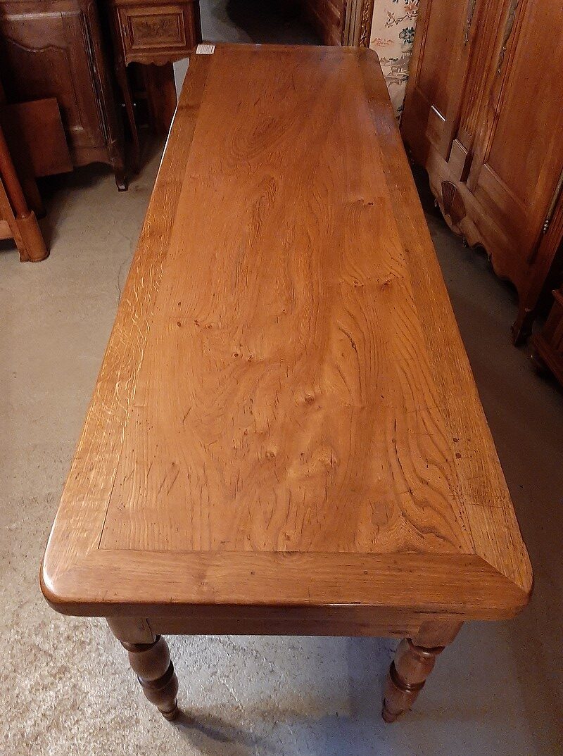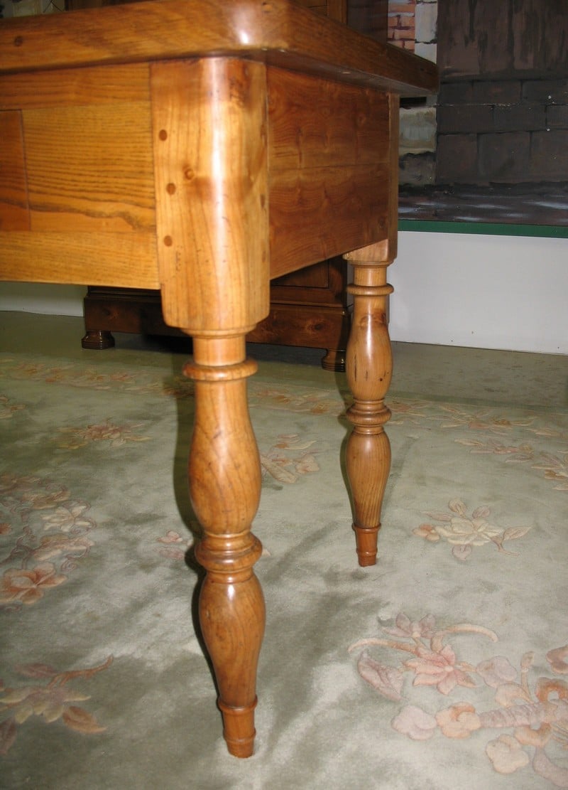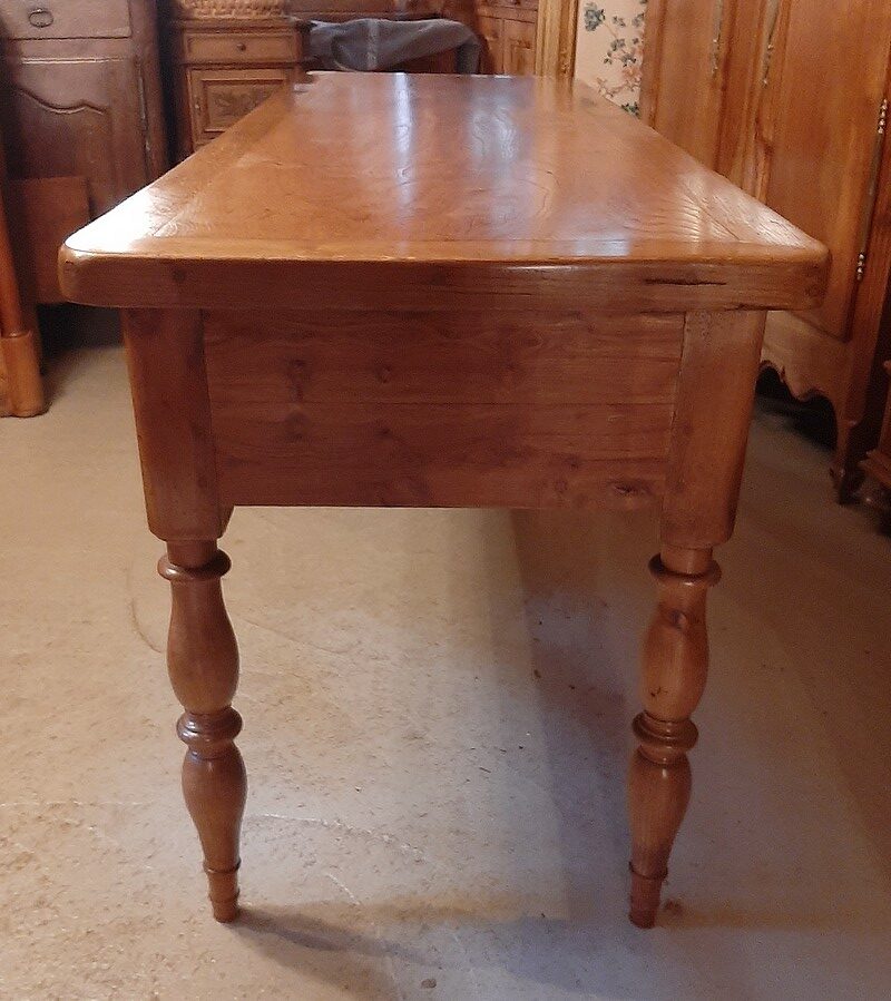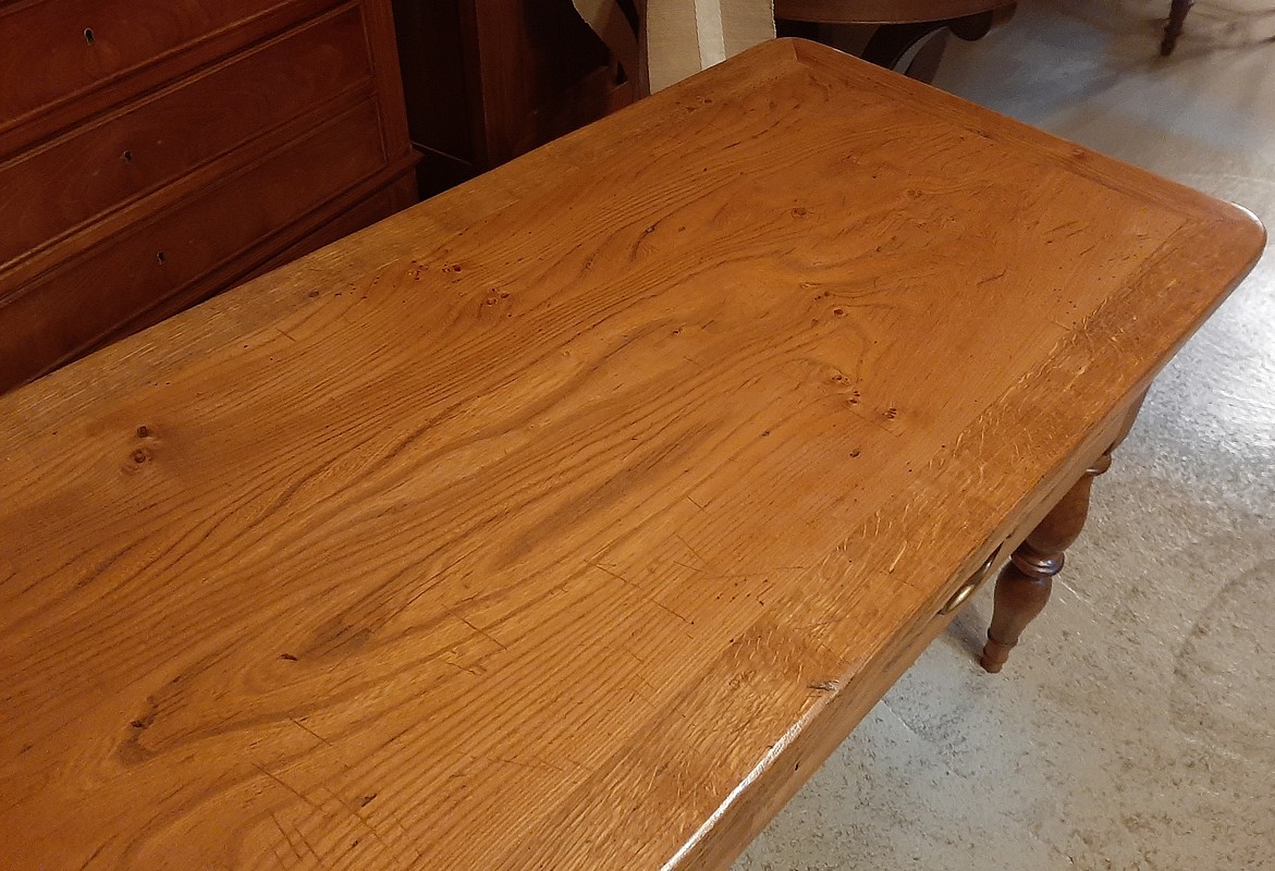 Table à Gibier ouvrant par 3 tiroirs en façade. Pieds ‘Jacob’. Plateau et ceinture en frêne avec entourage en chêne et pieds en merisier.