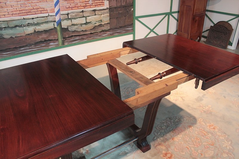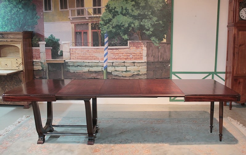 Ouverte, grâce à ses 3 allonges en bois secondaire teinté, elle mesure 290cm X 101cm. Elle est alors soutenue par 2 pieds supplémentaires qui sont repliables.