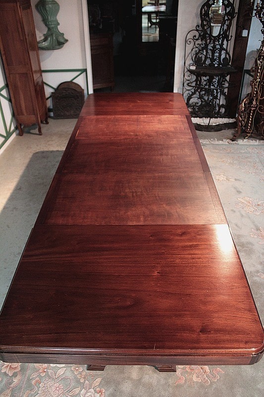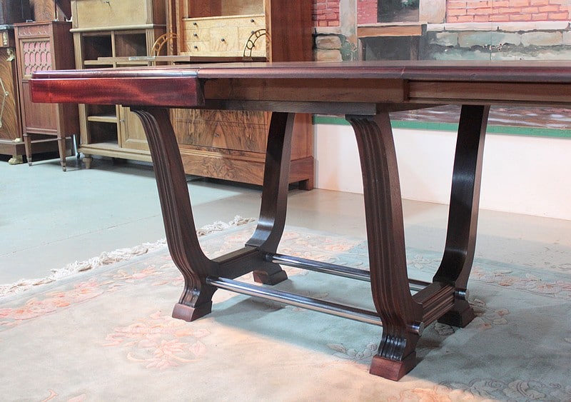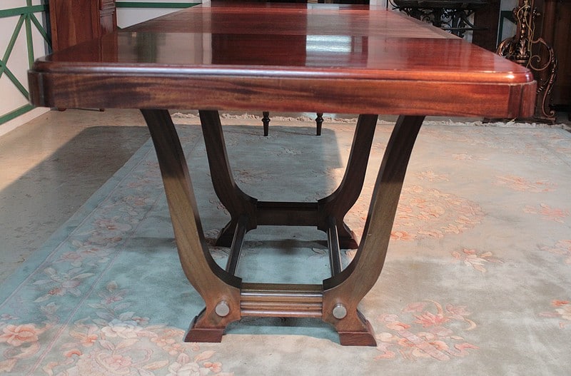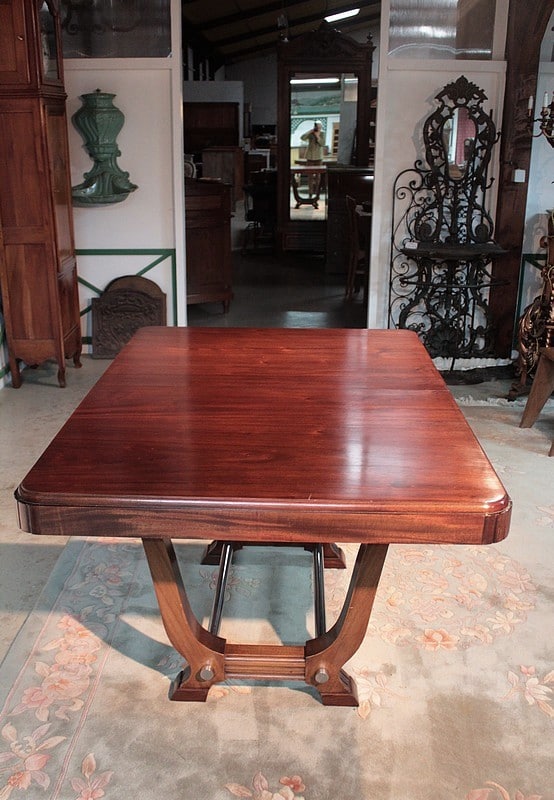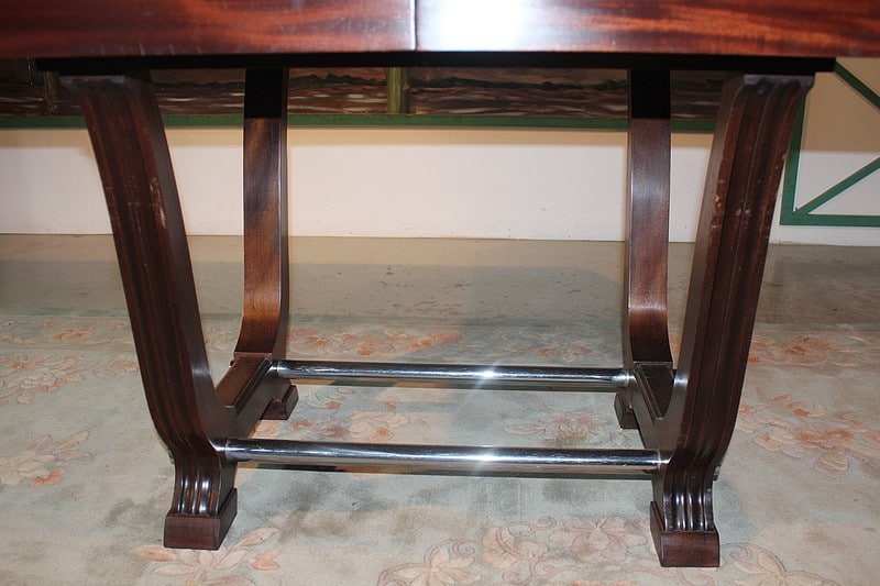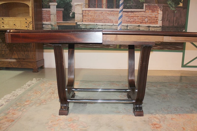 Table rectangulaire Art Déco avec bandeau en acajou massif. Elle repose sur 2 piètements en U reliés par 2 barres en métal chromé.