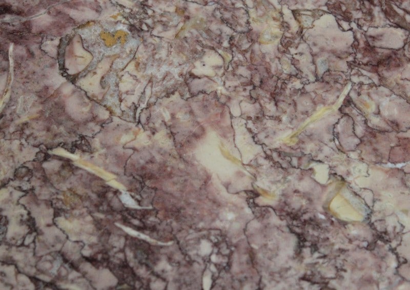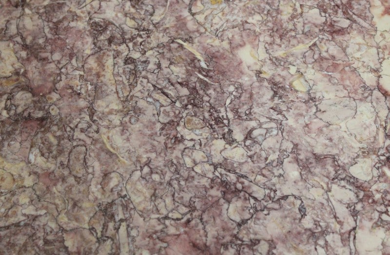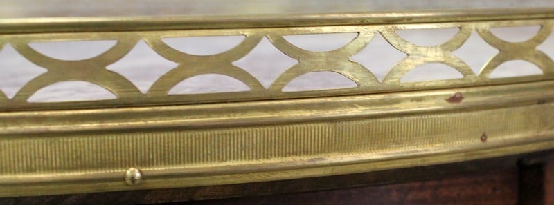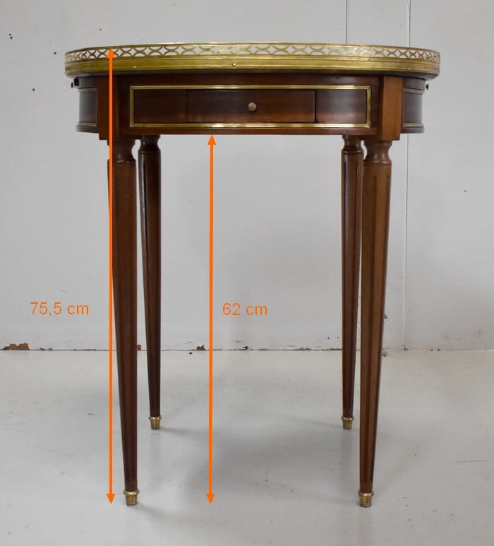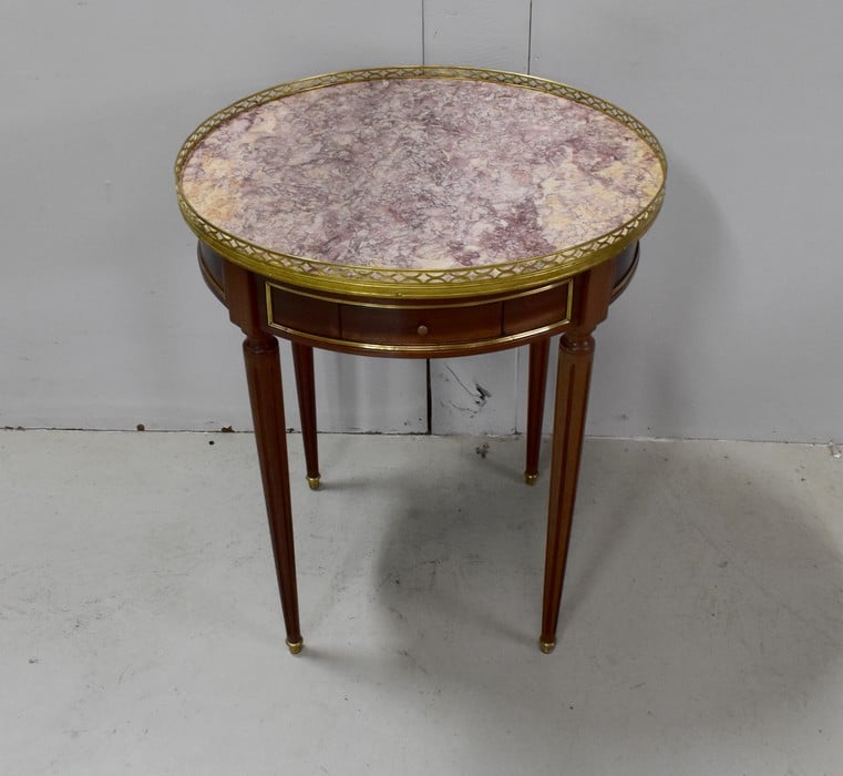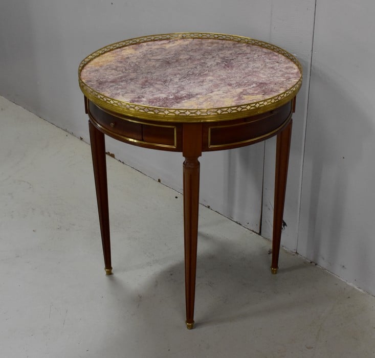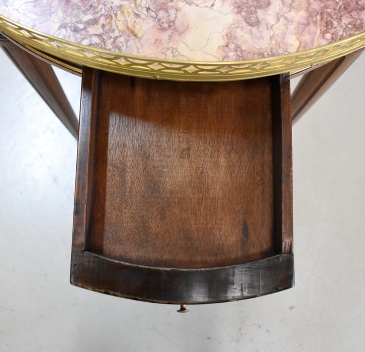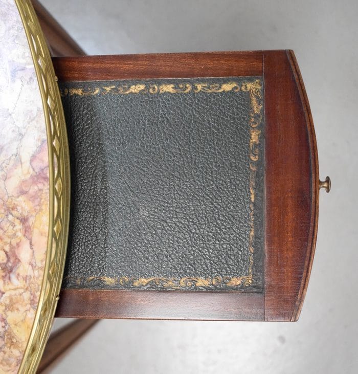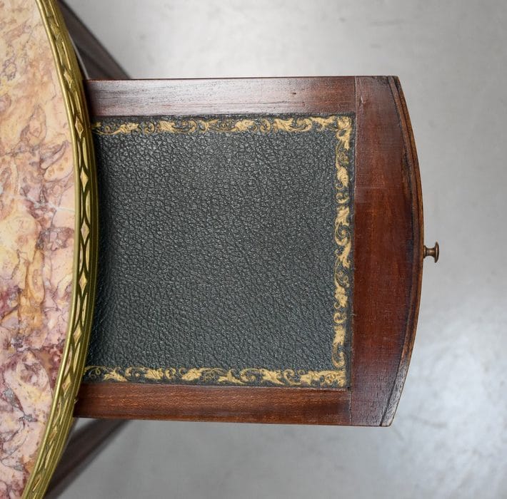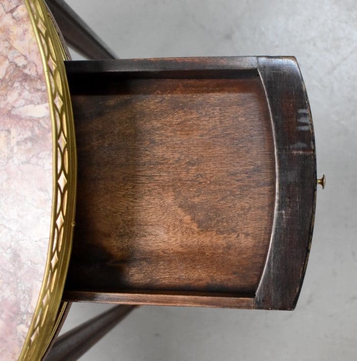 Son plateau Rond est en Marbre Griotte Rose de Lourdes, entouré d’une galerie Ajourée en Laiton.