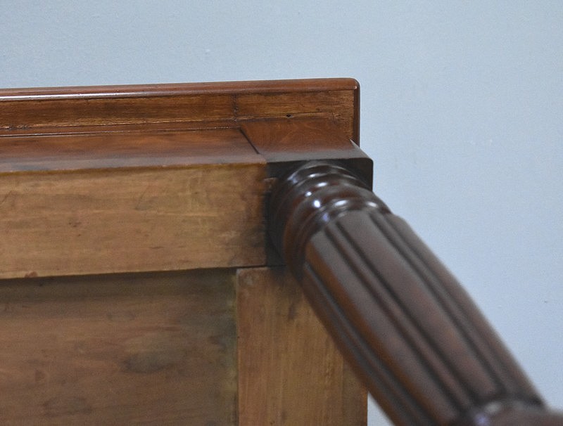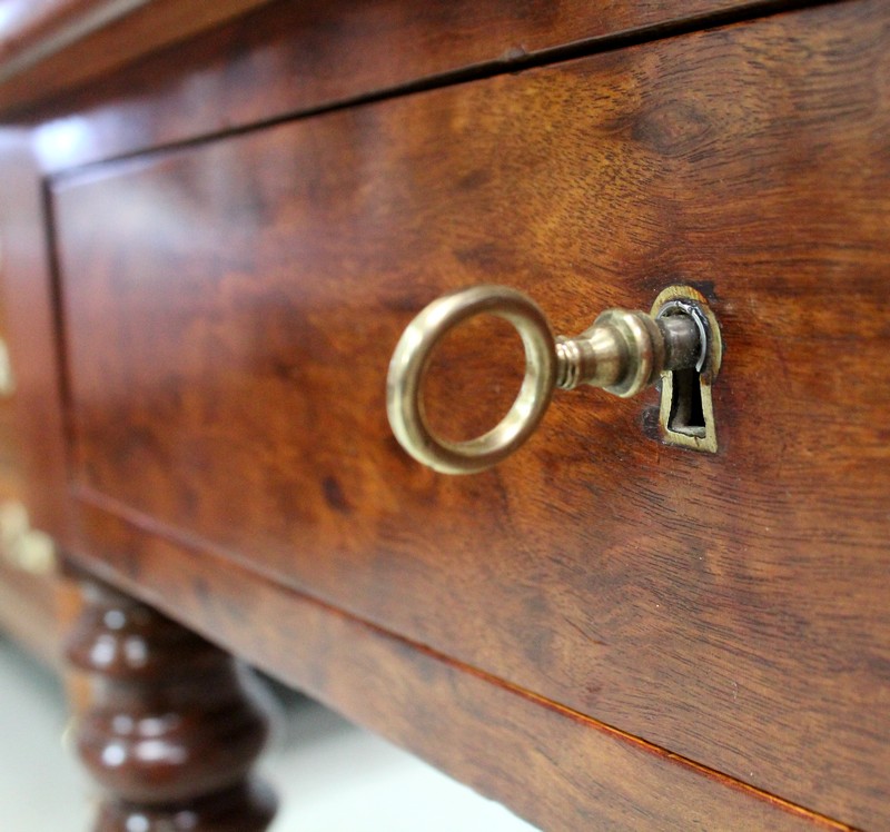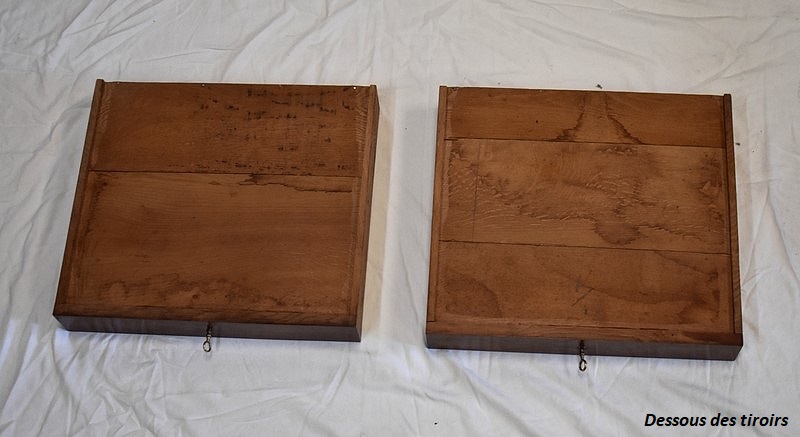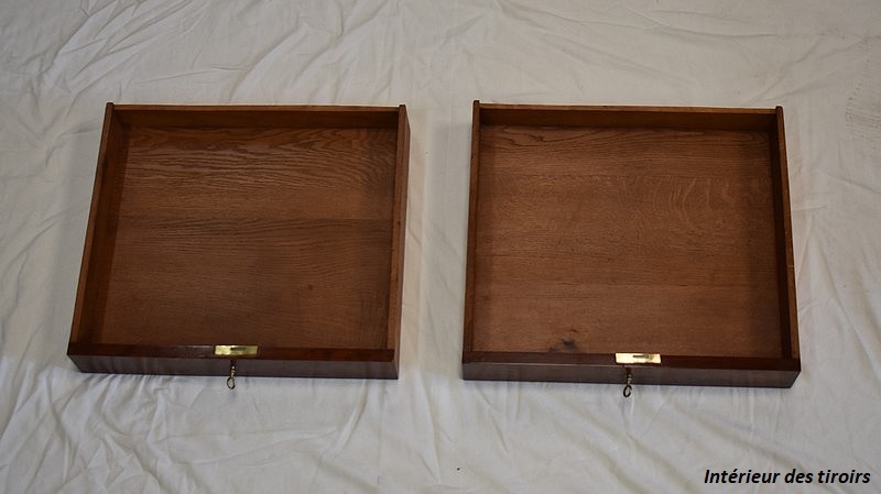 Ce Meuble est composé de deux tiroirs, à façades en Placage d’Acajou Moucheté, sur lesquelles on peut noter la présence de Serrures d’Origine en état de fonctionnement, munies de clés rapportées. Le fond et les côtés des tiroirs sont quant à eux en Chêne.